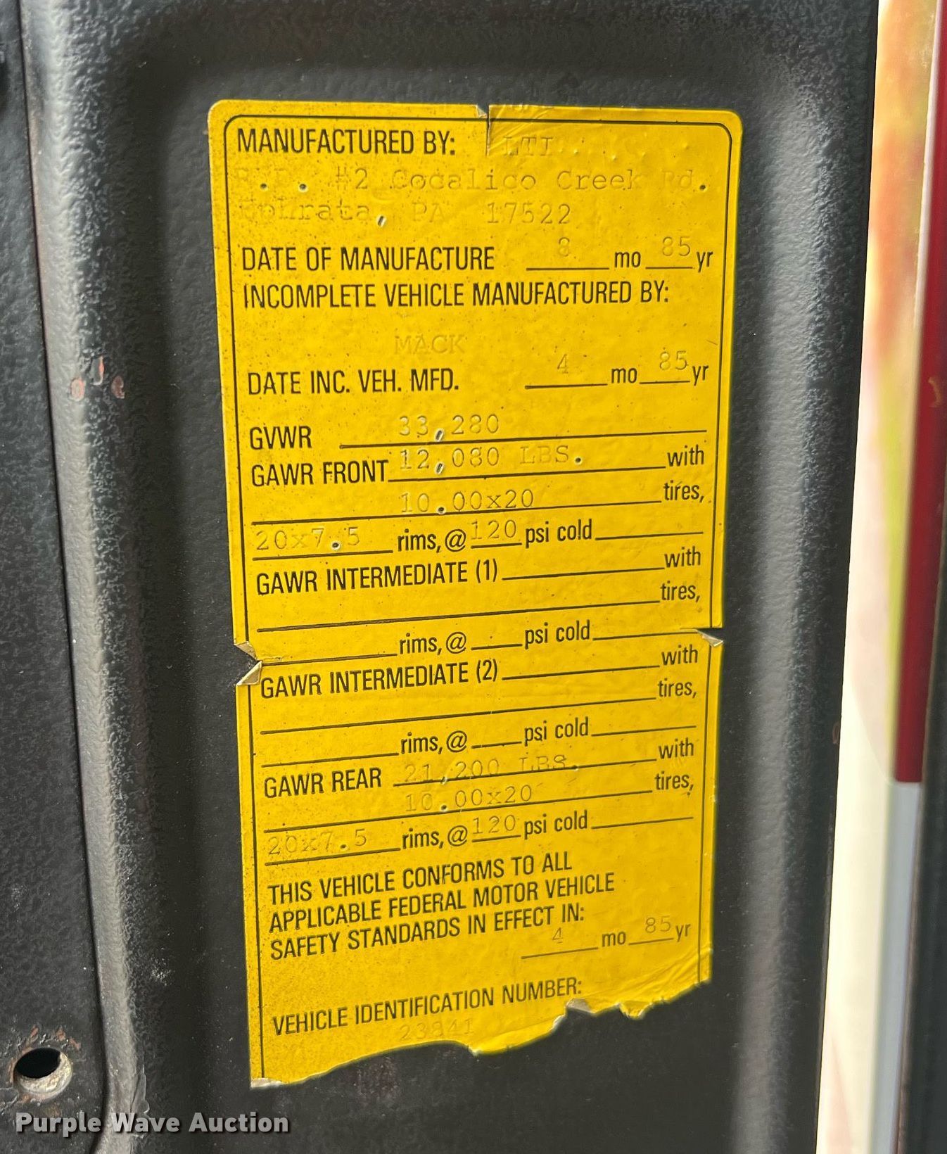 1985 Mack CF686FC pumper fire truck. Miles: 40,563 on odometer, VIN: 1M2A142C2FM001616. Engine Mack, Displacement: 11.0L, Cylinders: 6, Fuel type: Diesel. Transmission Manual, Speed: 5. Chassis Axles: Single, Suspension: Spring, Brakes: Air, GVWR: 33,280 lbs. Interior Heat. Features Fire truck body Elevated deck gun, Pump 1,510 gpm, Ground ladder. Tires Size: 10.00R20. Missouri title. Title distribution may be delayed up to 14 days from verification of funds. Russellville Lohman Fire. 2909 Main Street. Lohman , MO 65050