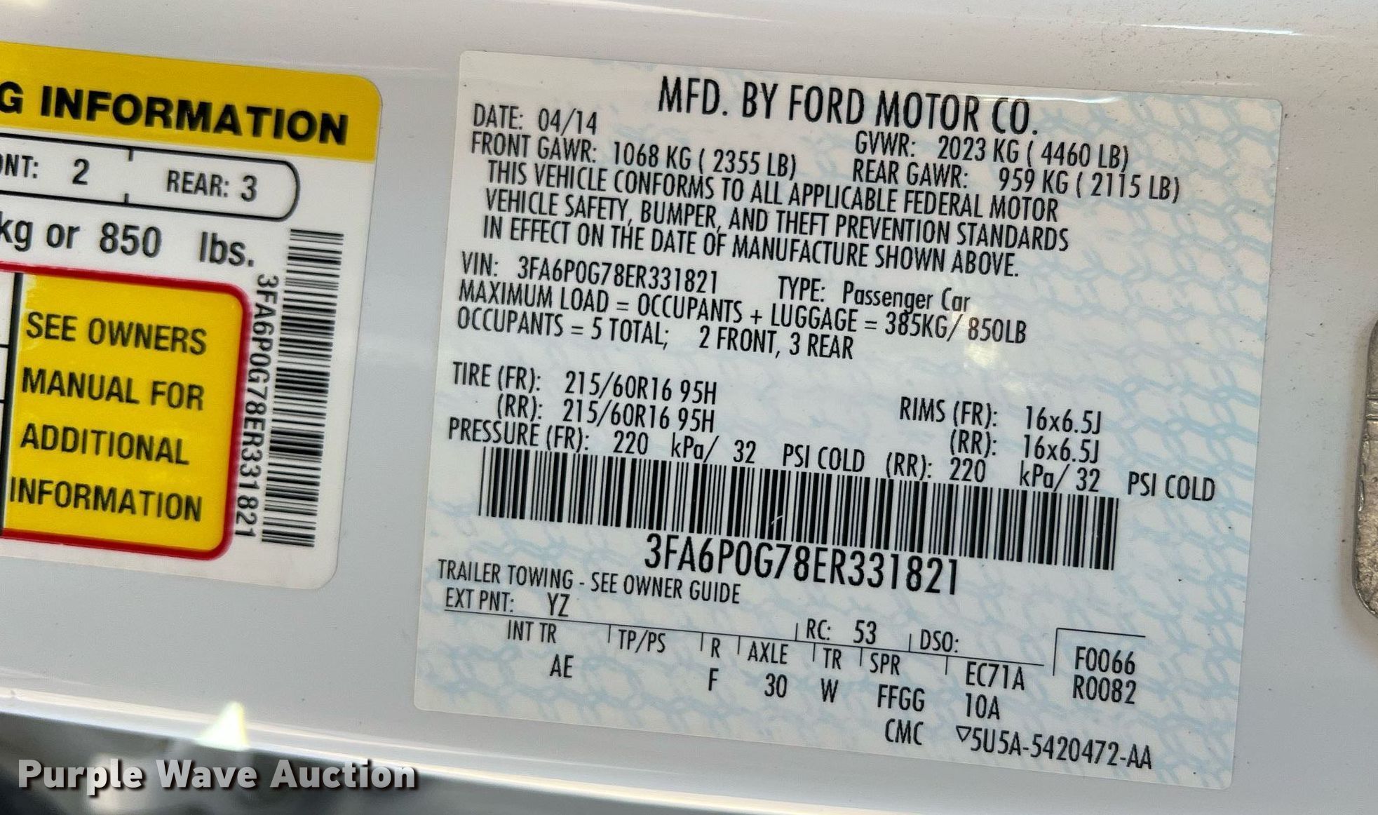 2014 Ford Fusion Sedan. Miles: 181,199 on odometer, VIN: 3FA6P0G78ER331821, Unit #: B7202. Engine Displacement: 2.5L L4 DOHC, Cylinders: 4, Fuel type: Gas. Transmission Automatic. Interior AC, Heat, Power windows, Power locks, Cruise control. Tires Size: 215/60R16. Notes Hail damage. Title distribution may be delayed up to 14 days from verification of funds. 8267 Old Hwy 54. New Bloomfield, MO 65063