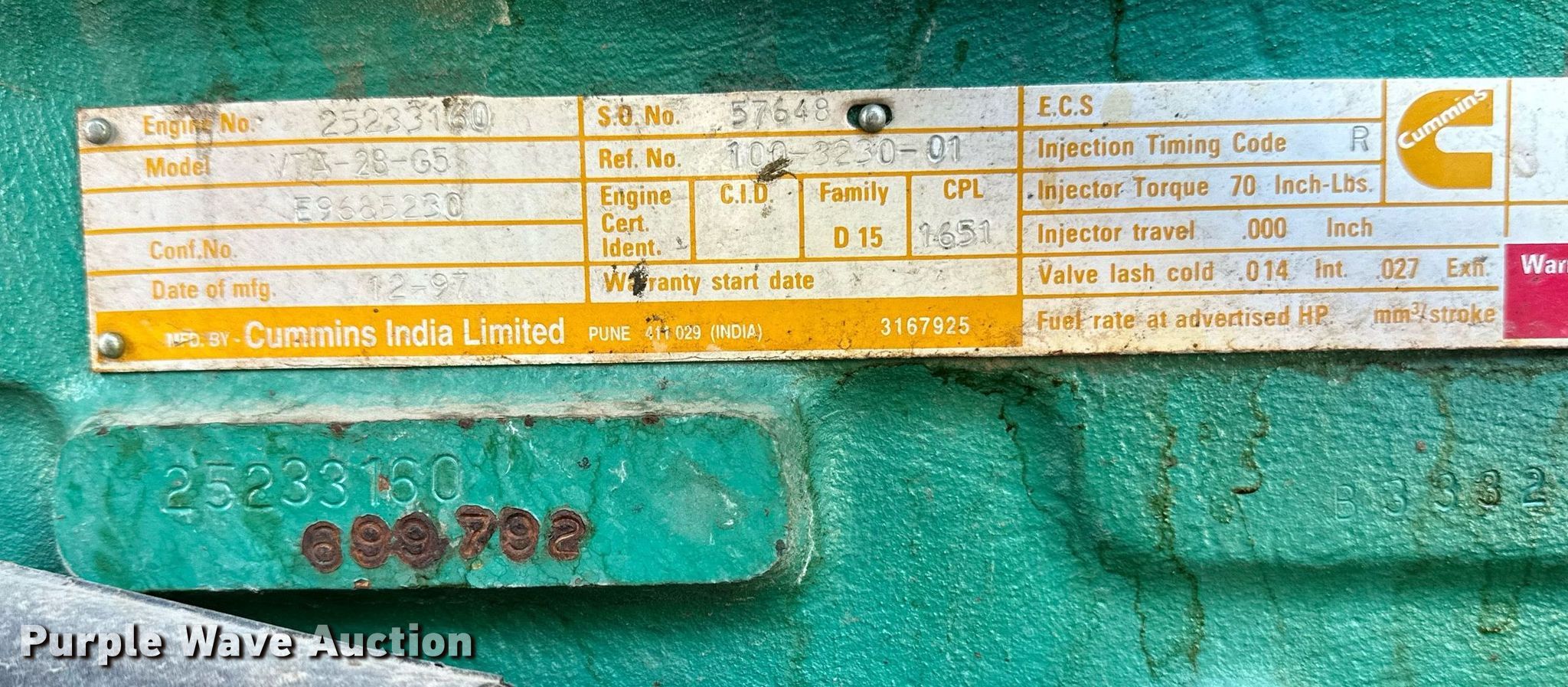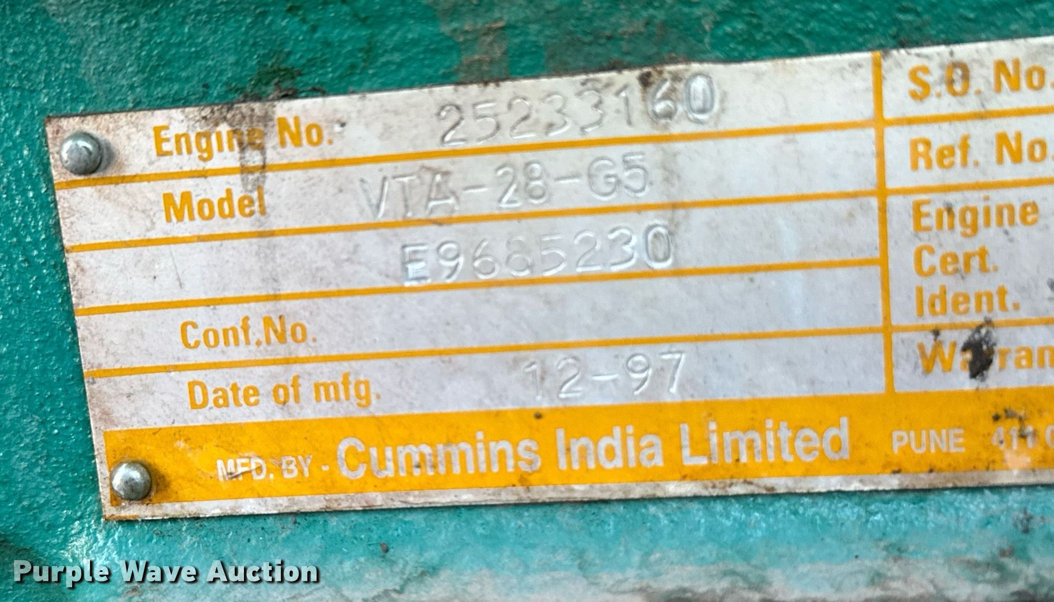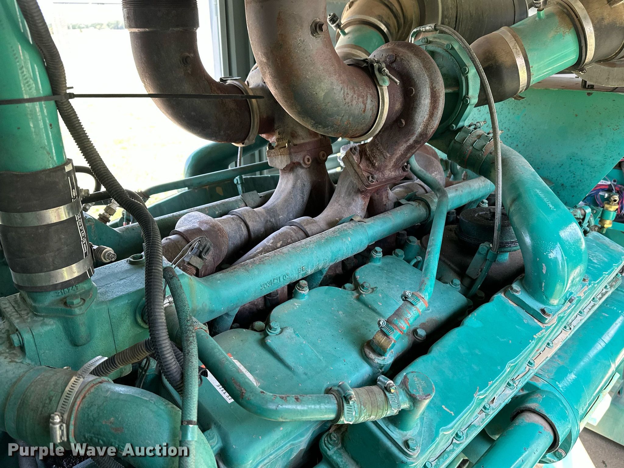 Onan 600DFGB generator. Hours: Unknown, Serial: B980699792. Dimensions 15'L x 94"W x 146"H. Engine Cummins VTA-28-G5, Serial: 25233160, Cylinders: 12, Fuel type: Diesel, HP: 900. Features Generator kVA: 750, kW: 600, Phase: Three, Electric start. Notes Unit has been disconnected from utilities. City of Newton. 201 East 6th Street. Newton, KS 67114