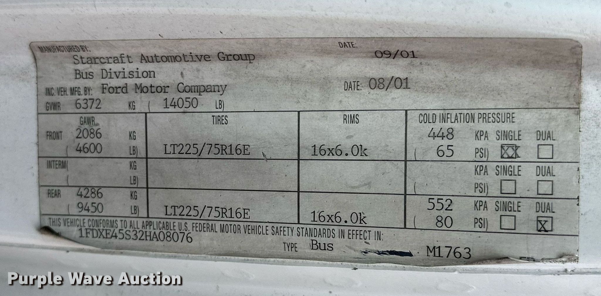 Purple Wave is selling a used Bus in Kansas. This item is a 2001 Ford E450 Super Duty shuttle bus with the following: Miles: 108,762 on odometer, VIN: 1FDXE45S32HA08076
