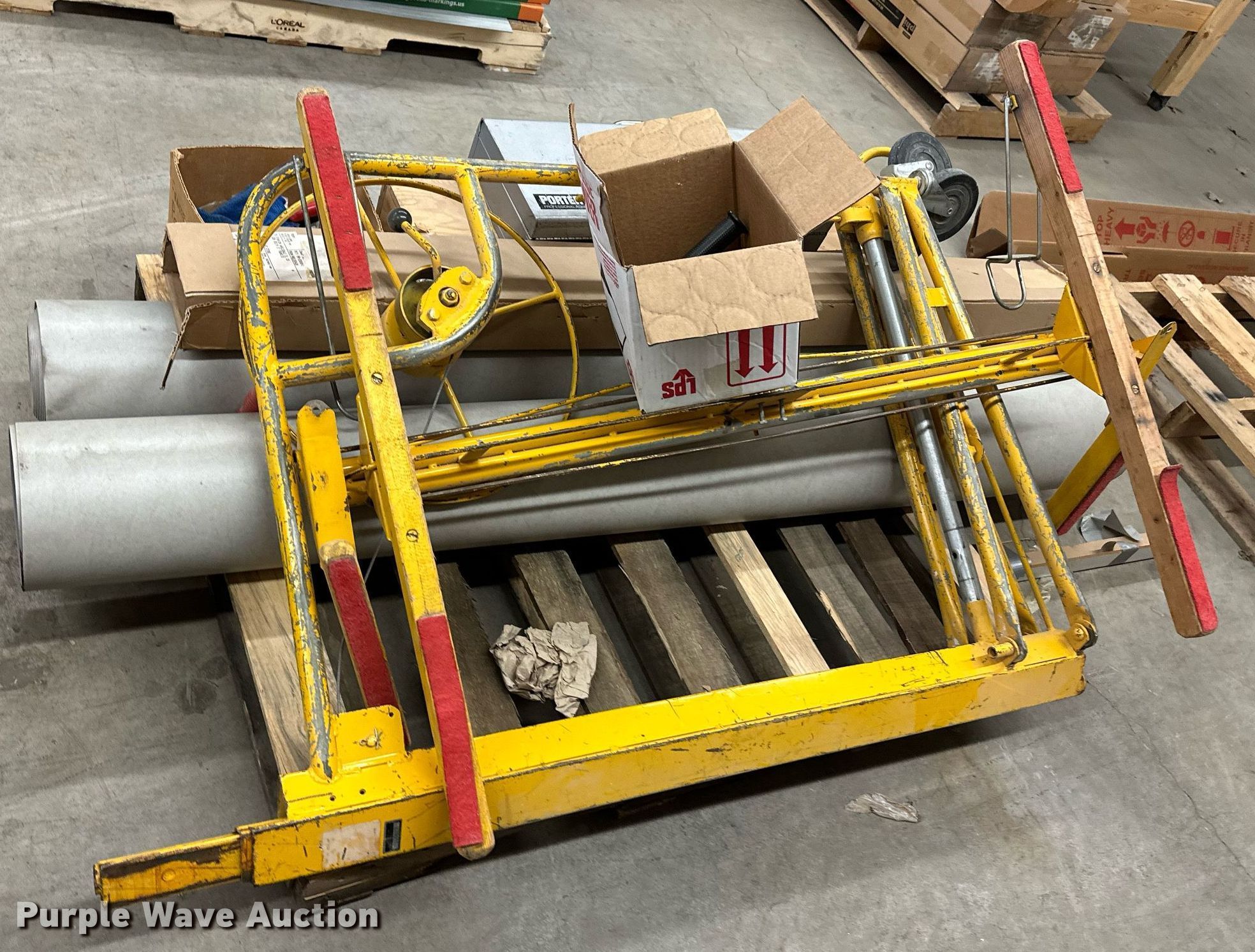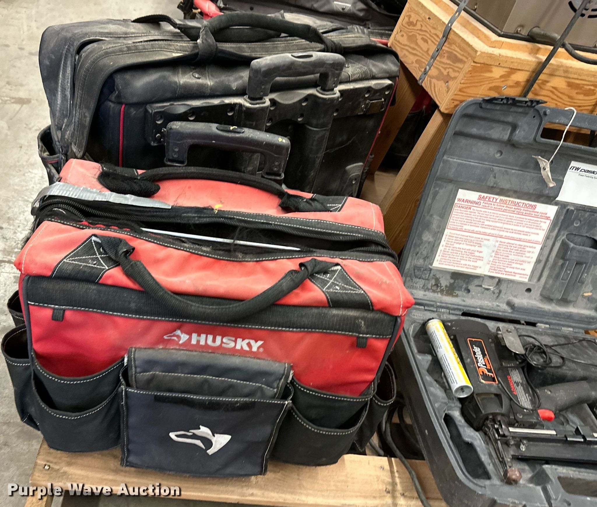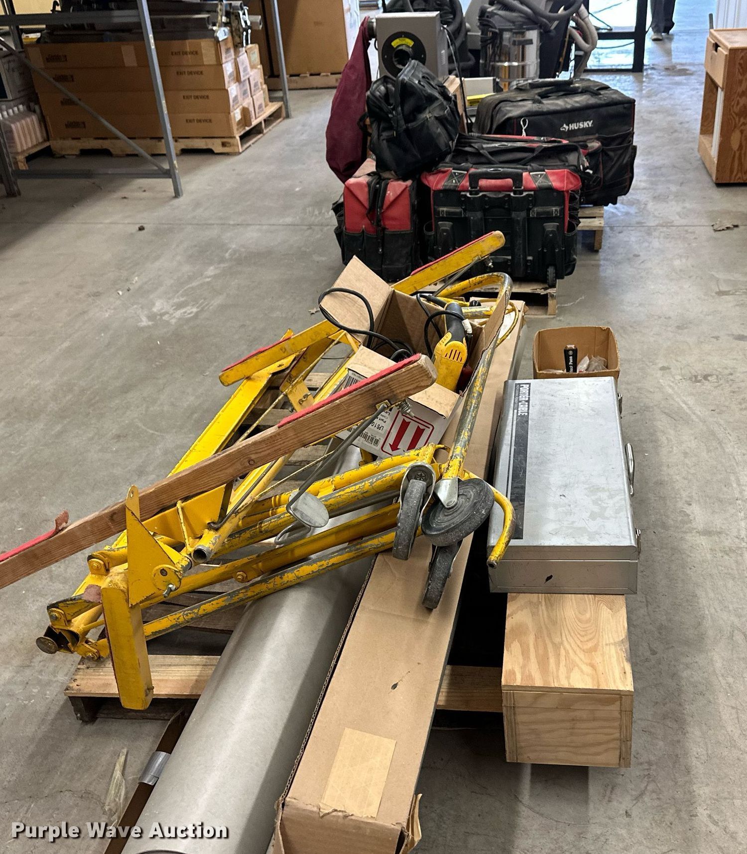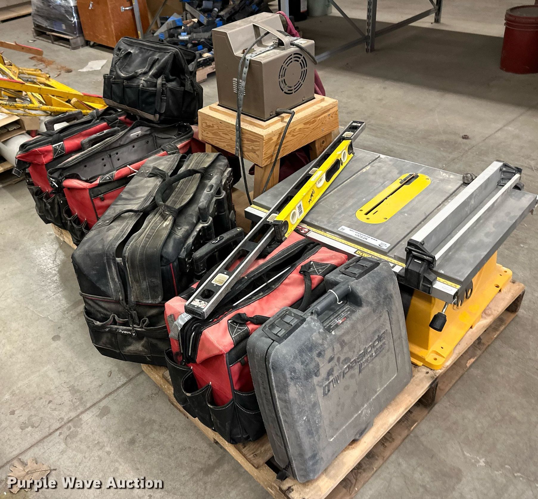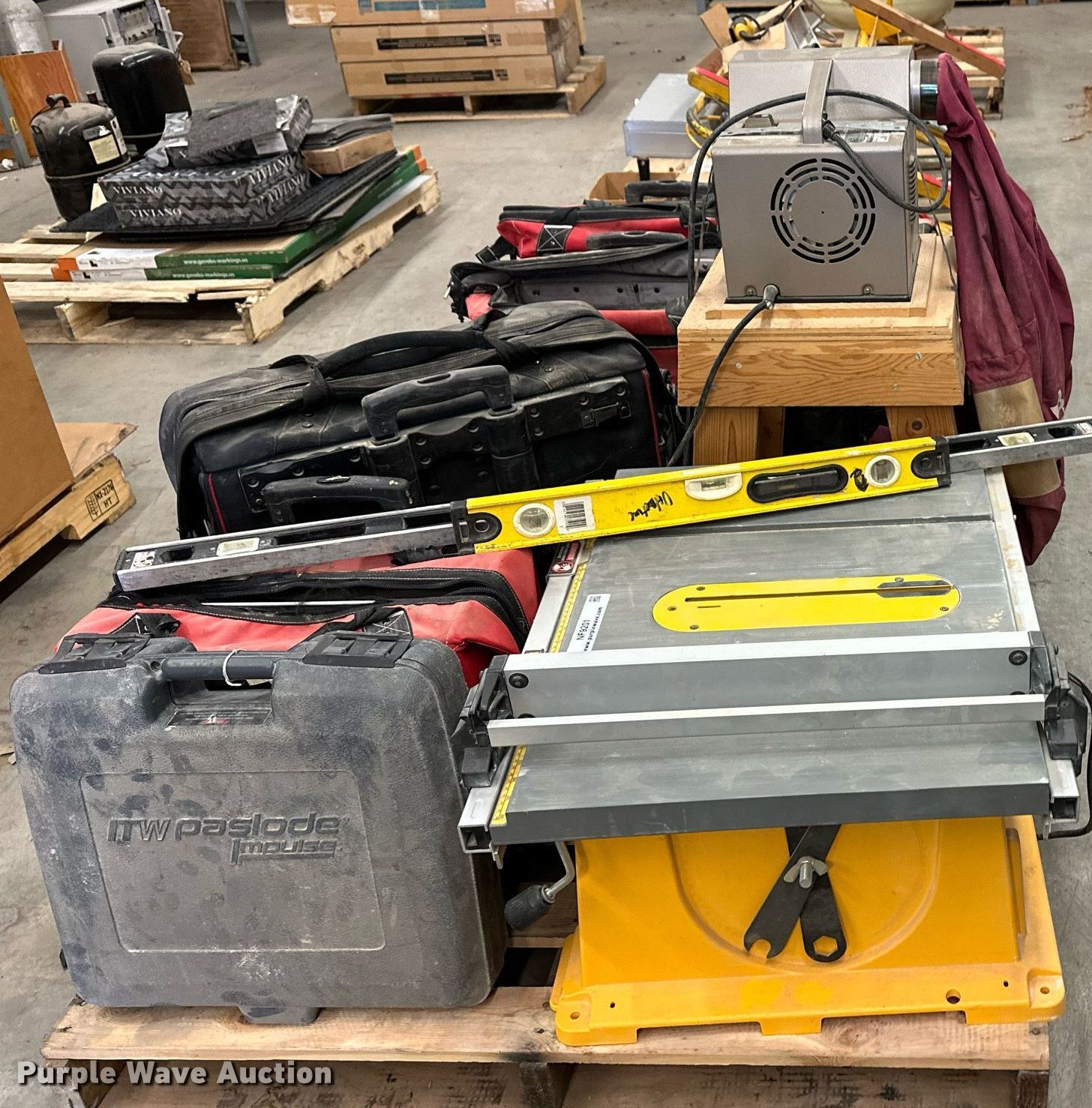 Purple Wave is selling a used Tools in Kansas. This item is a Tools with the following: Dewalt DW744 table saw, Makita model 410 dust collection system, Paslode nail gun, Drywall jack, (3) drills, Delta planer components, Roller, (4) blades, (4) lock bars, (2) rolls of vinyl flooring and more