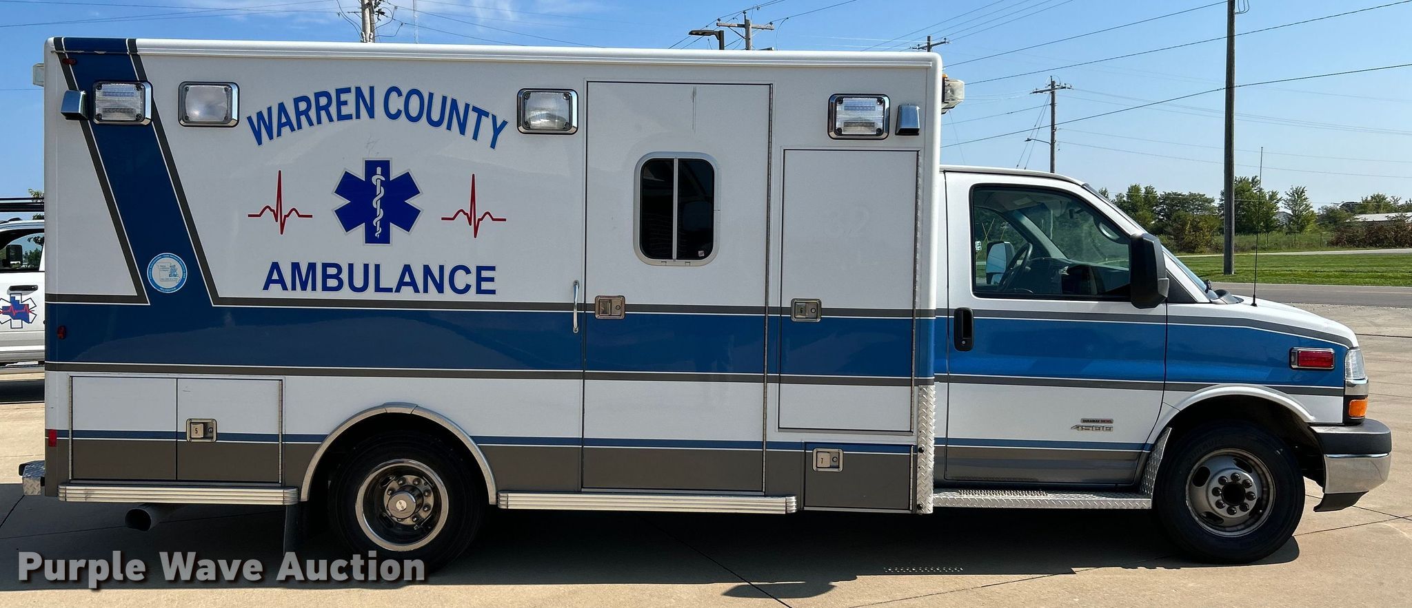 2014 Chevrolet Express 4500 ambulance. Miles: 162,208 on odometer, Hours: 7,008 on meter, VIN: 1GB6G5CL6E1203246. Engine Displacement: 6.6 V8 OHV, Cylinders: 8, Fuel type: Diesel. Transmission Automatic. Chassis Axles: Single, Suspension: Spring, Brakes: Hydraulic, GVWR: 14,200 lbs, Wheelbase: 163". Interior AC, Heat, Power windows, Power locks, Cruise control. Features Ambulance body Life line, PA/ siren controls, Oxygen hookups. Tires Size: 225/75R16. Notes Decals will be removed prior to auction, Possible AC issues, may need charged. Missouri title. Title distribution may be delayed up to 14 days from verification of funds. Warren County Ambulance District. Wright City, MO 63390