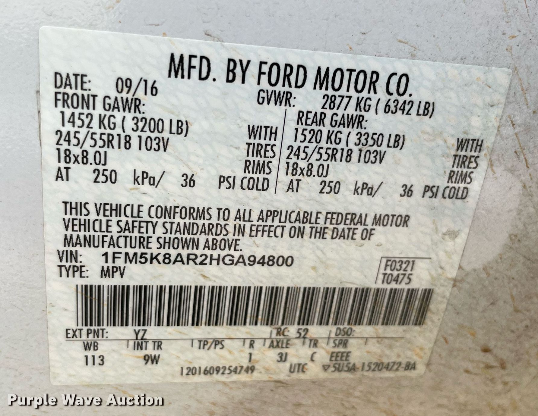 • VIN: 1FM5K8AR2HGA94800
