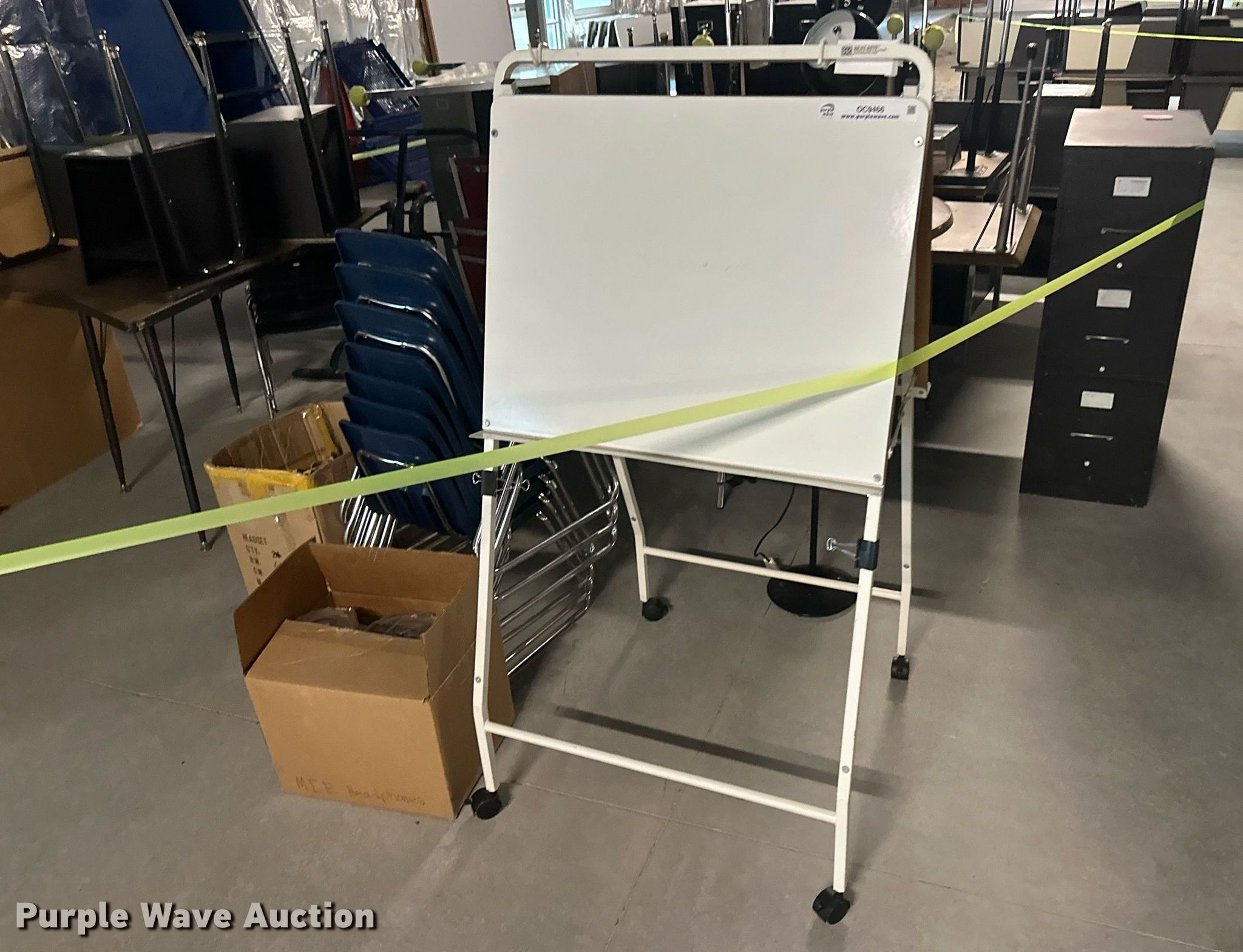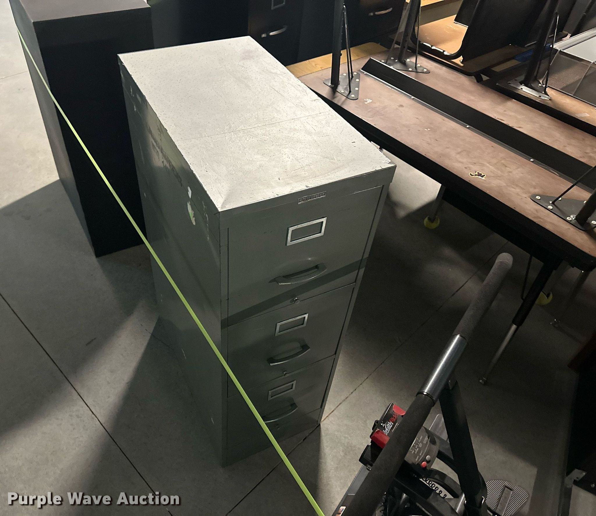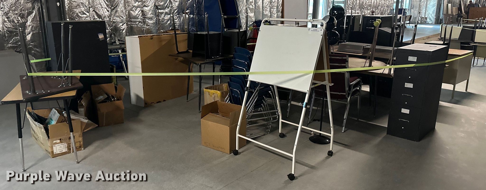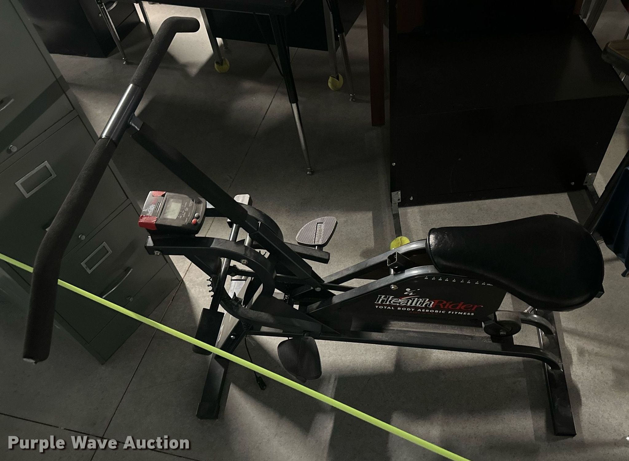 Purple Wave is selling a used Furniture in Kansas. This item is a Furniture with the following: (17) desks, (6) filing cabinets, (16) chairs, Easel, Health Rider stationary bike