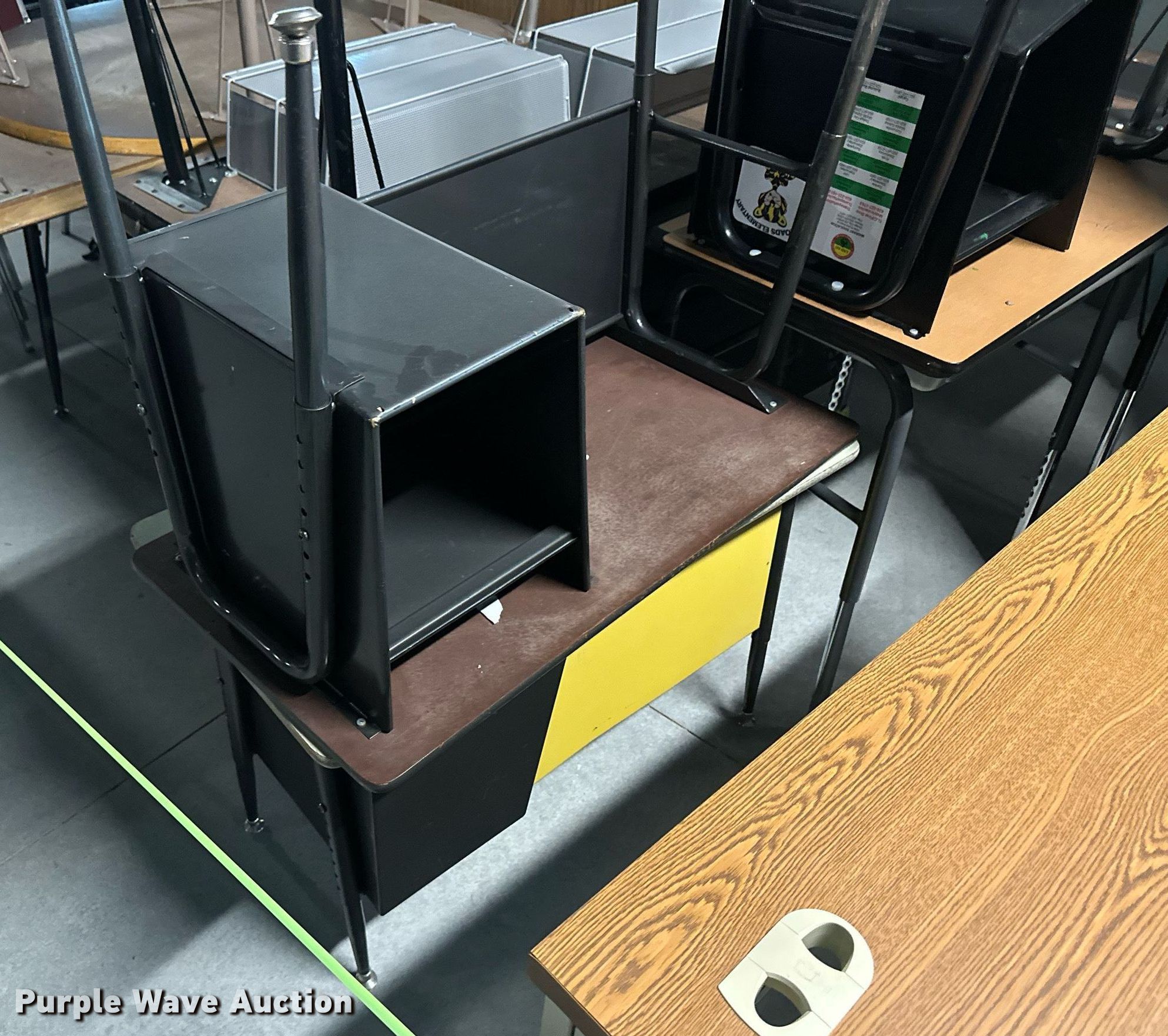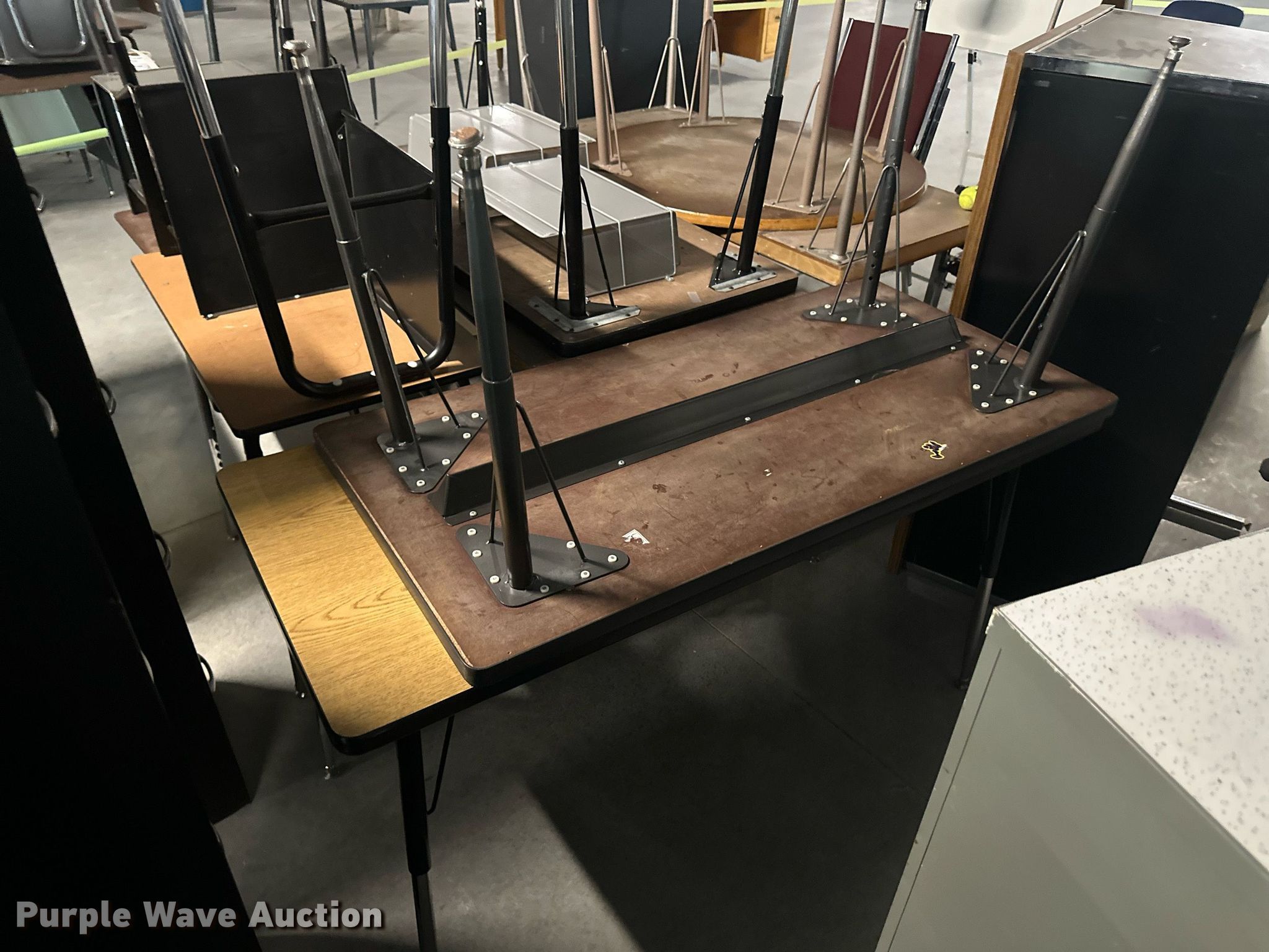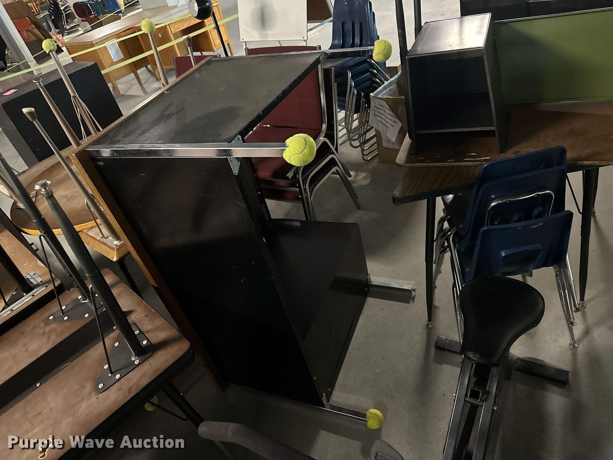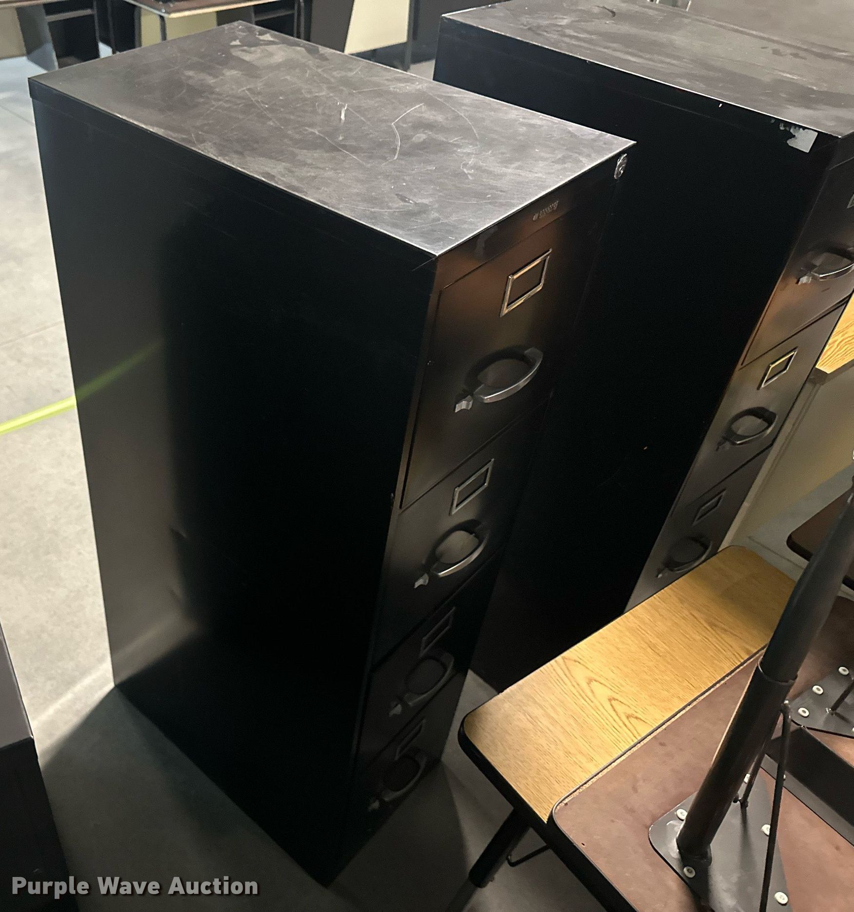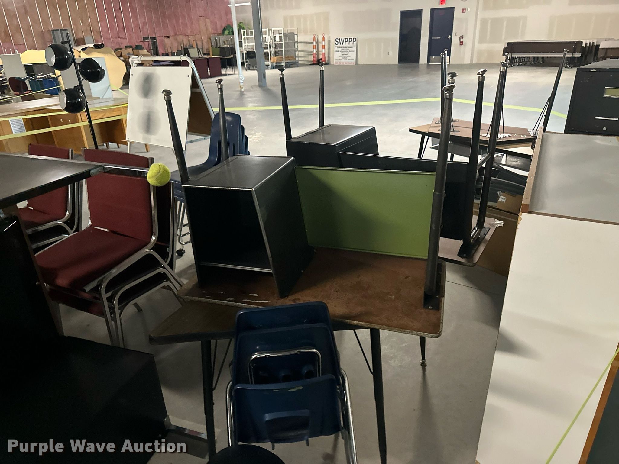 Purple Wave is selling a used Furniture in Kansas. This item is a Furniture with the following: (17) desks, (6) filing cabinets, (16) chairs, Easel, Health Rider stationary bike