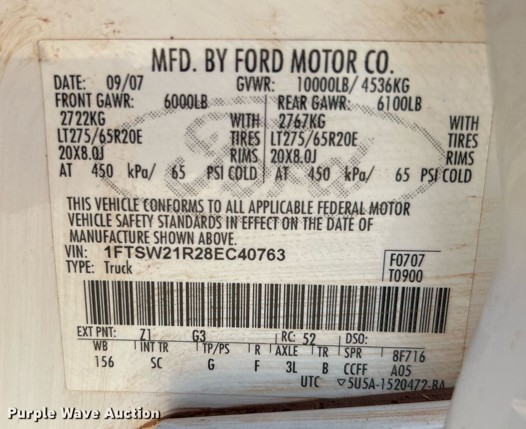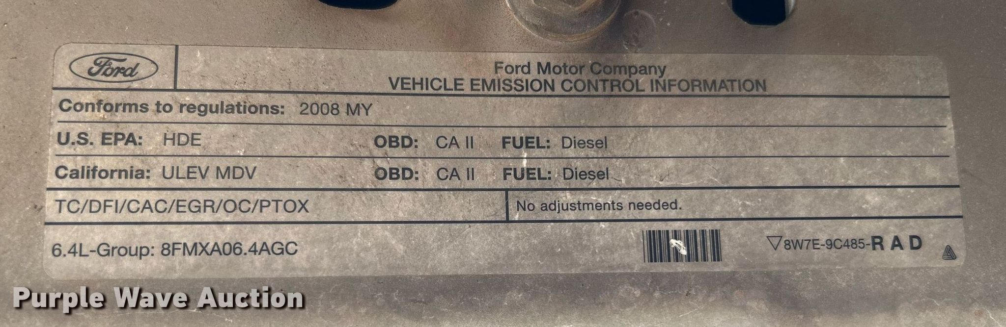 2008 Ford F250 Super Duty Lariat King Ranch Crew Cab pickup truck. Miles: 254,515 on odometer, VIN: 1FTSW21R28EC40763. Engine Displacement: 6.4L V8 OHV, Cylinders: 8, Fuel type: Diesel. Transmission Automatic, Four wheel drive. Interior AC, Heat, Seat: Heated, Power driver, Power passenger, Heated mirrors, Power windows, Power locks, Cruise control, Backup camera, Sunroof. Features Hitch: Gooseneck. Tires Size: LT275/65R20. Notes Dash warning indicator: TPMS, Windshield chipped or cracked. Oklahoma title. Title distribution may be delayed up to 14 days from verification of funds. 2902 West 6th Avenue. Stillwater, OK 74074