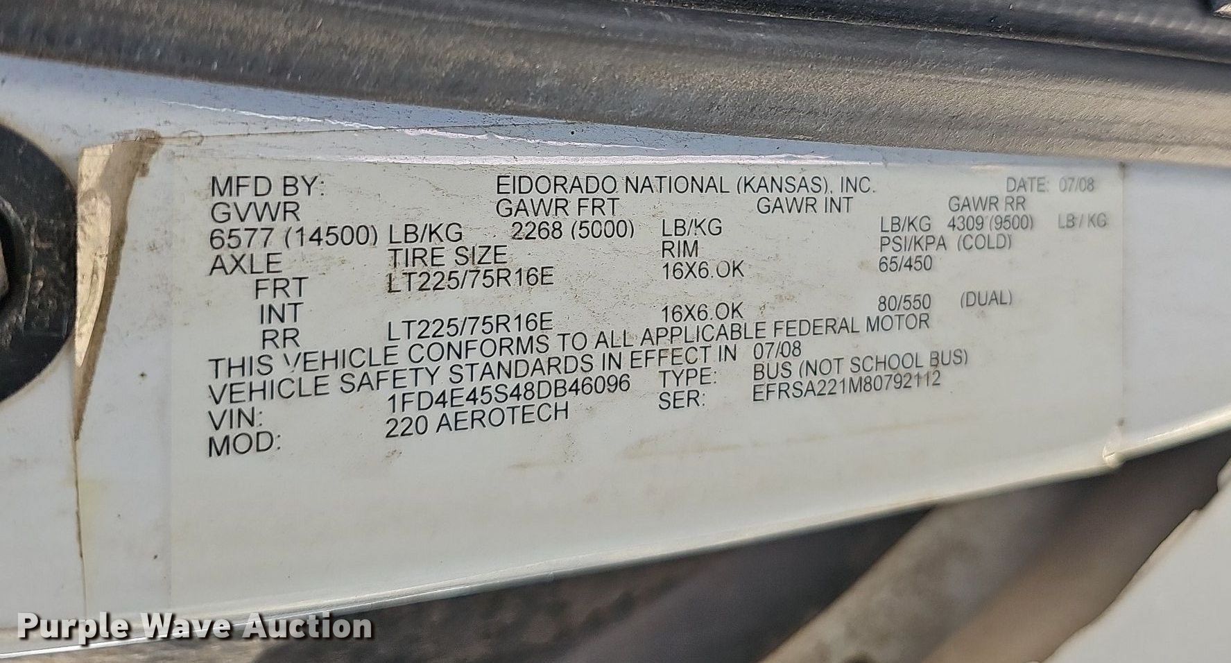 Purple Wave is selling a used Bus in Kansas. This item is a 2008 Ford E450 Super Duty shuttle bus with the following: Miles: 176,654 on odometer, VIN: 1FD4E45S48DB46096