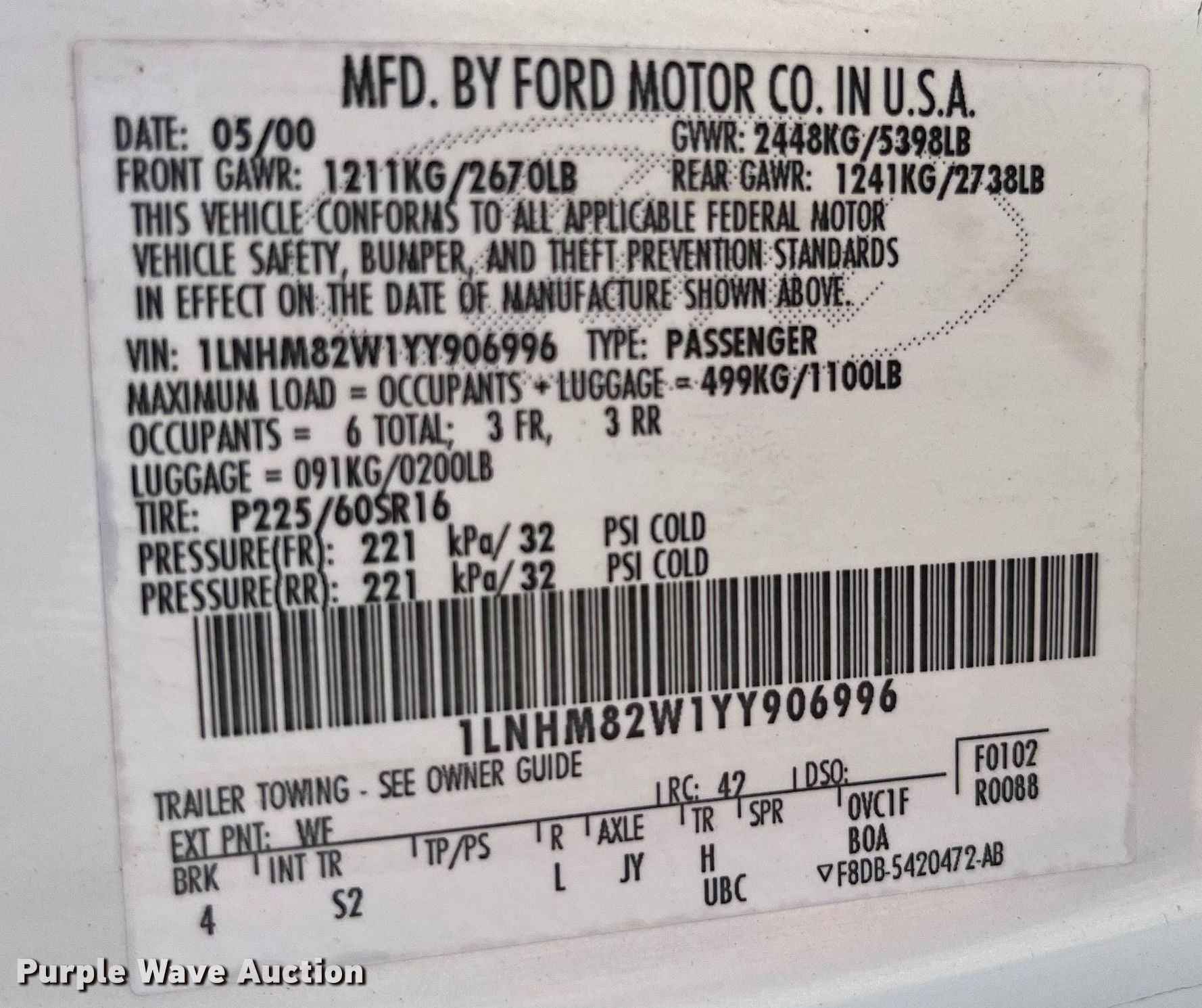 Purple Wave is selling a used Passenger Vehicle in Iowa. This item is a 2000 Lincoln Town Car with the following: Miles: 196,687 on odometer, VIN: 1LNHM82W1YY906996