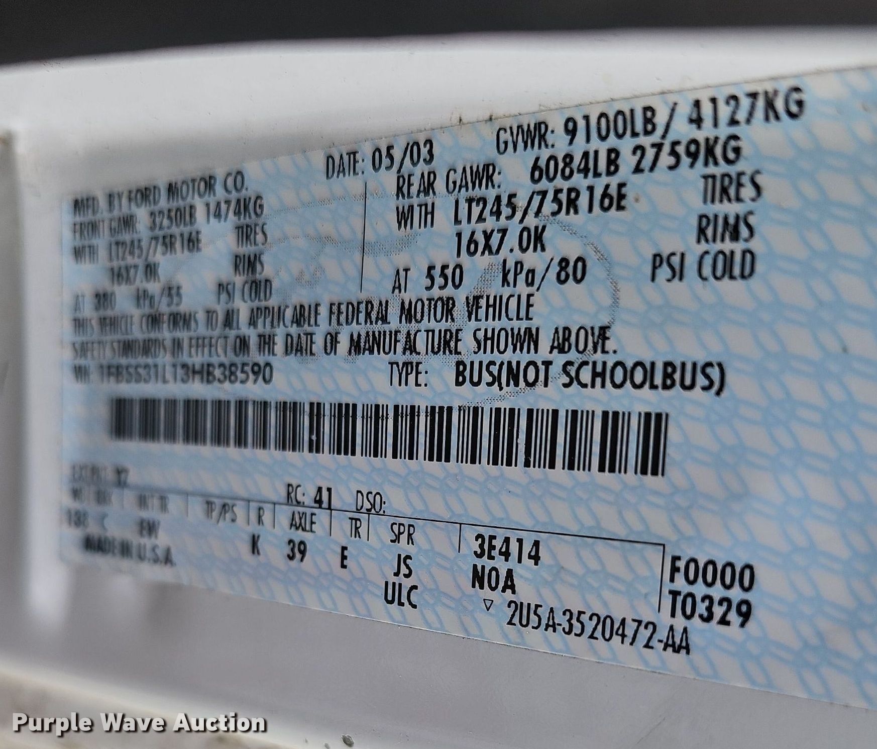 Purple Wave is selling a used Passenger Vehicle in Nebraska. This item is a 2003 Ford E350 XLT Super Duty van with the following: Miles: 158,892 on odometer, VIN: 1FBSS31L13HB38590
