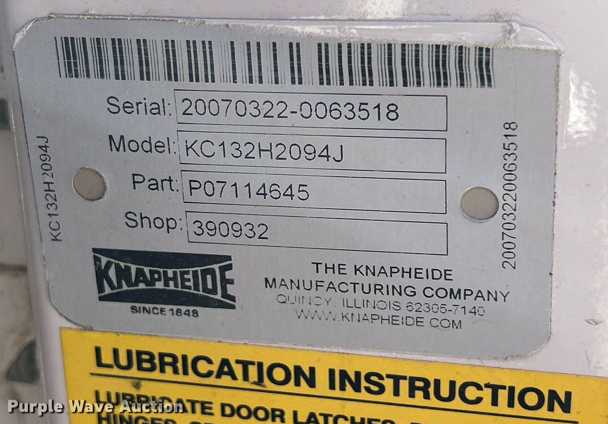 Purple Wave is selling a used Truck Part and Attach. in Iowa. This item is a Knapheide KC132H2094J Utility bed with the following: Serial: 20070322-0063518