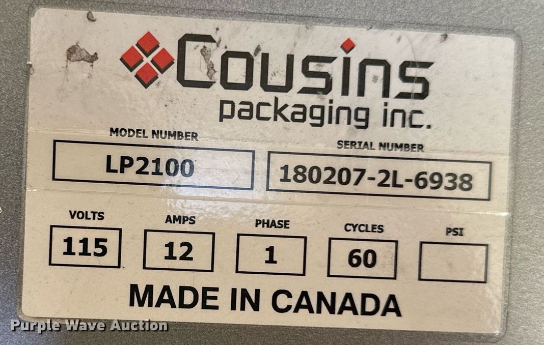 Cousins LP2100 shrink wrap machine. Serial: 180207-2L-6938. Electric Motor Volts: 115, Phase: Single. Tonganoxie, KS 66086