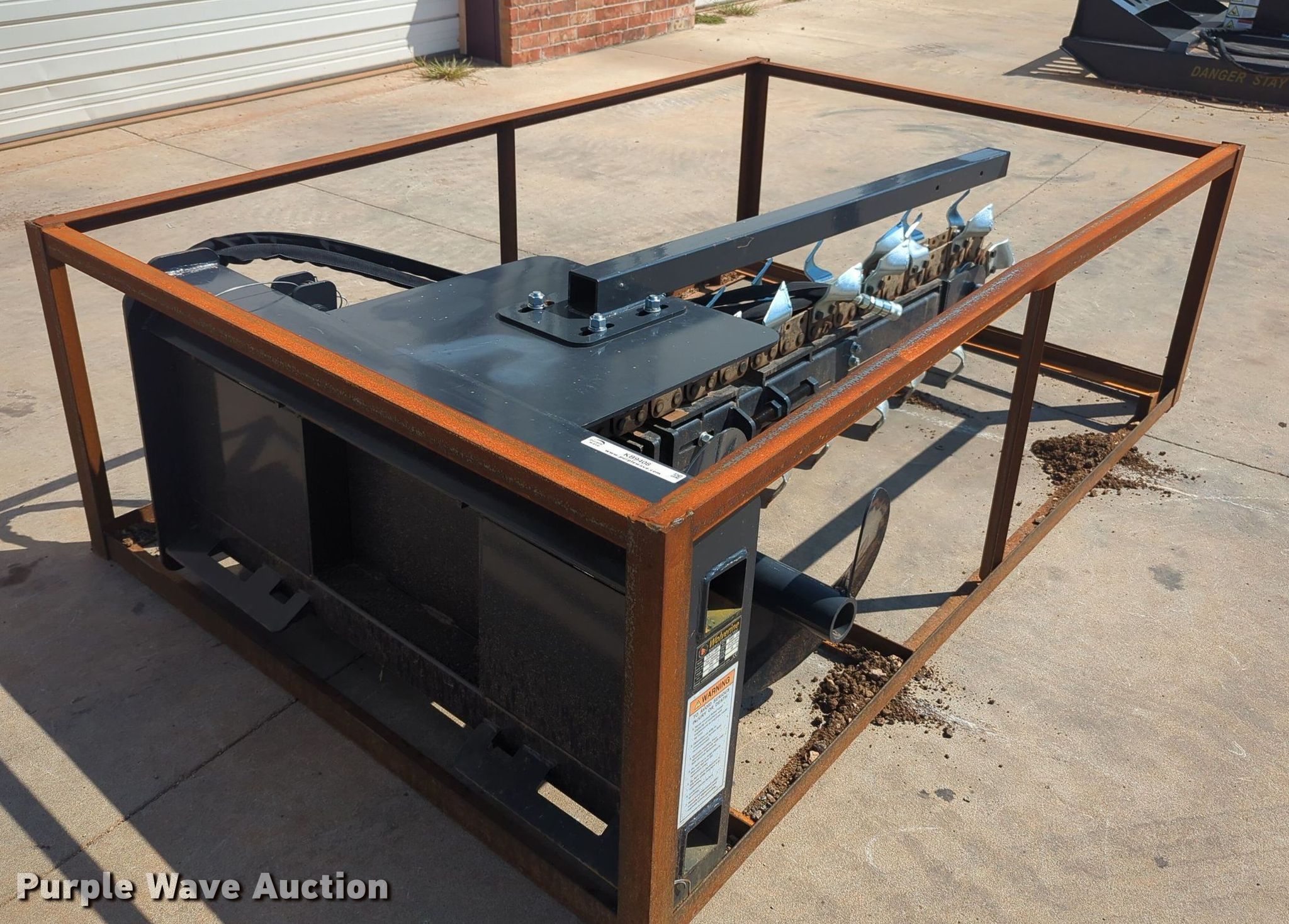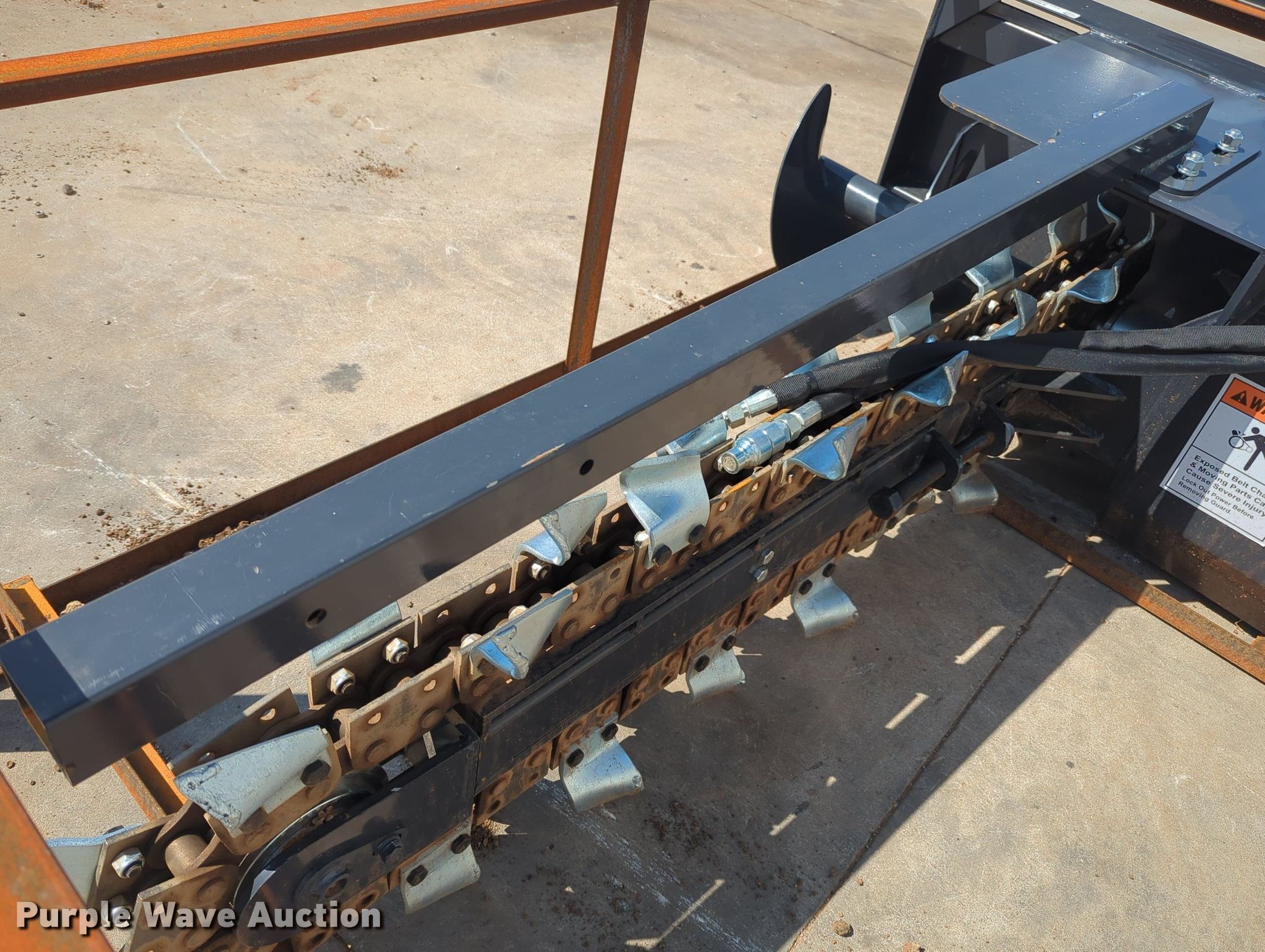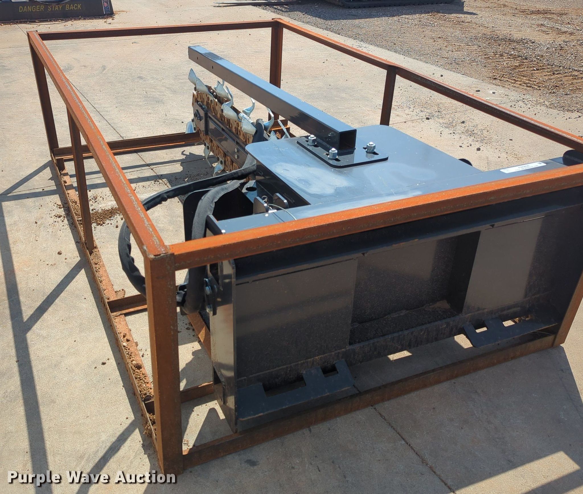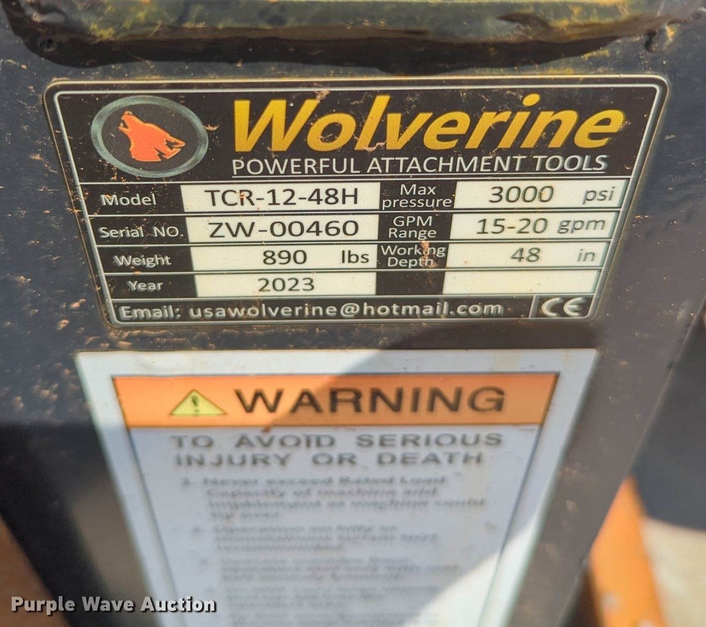 Purple Wave is selling a used Skid Steer Attach. in Oklahoma. This item is a Wolverine TCR-12-48H skid steer trencher with the following: Serial: ZW-00460, Estimated dig depth: 48", Cutting width: 4.5", Unused