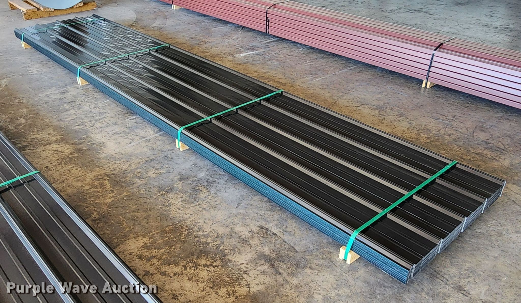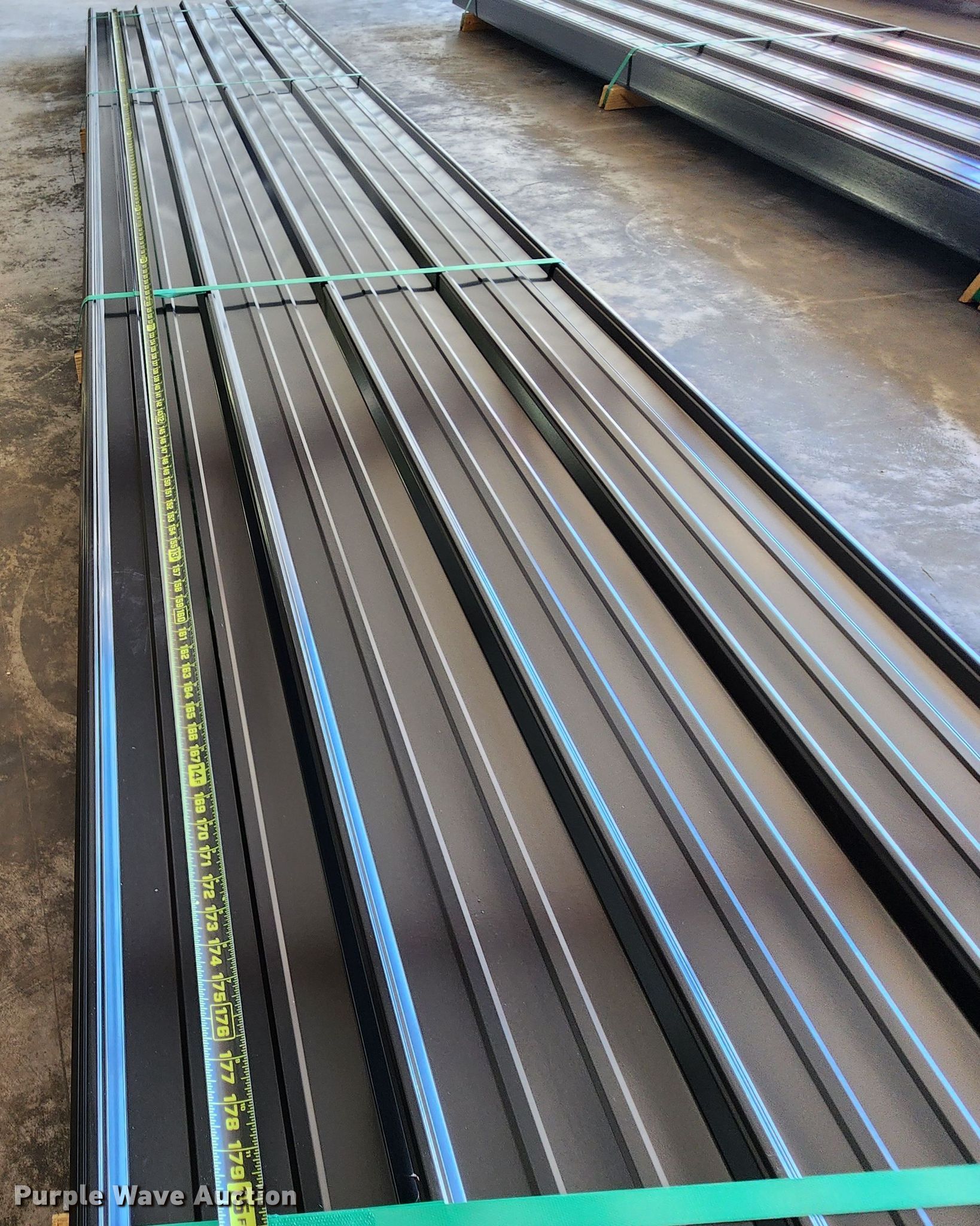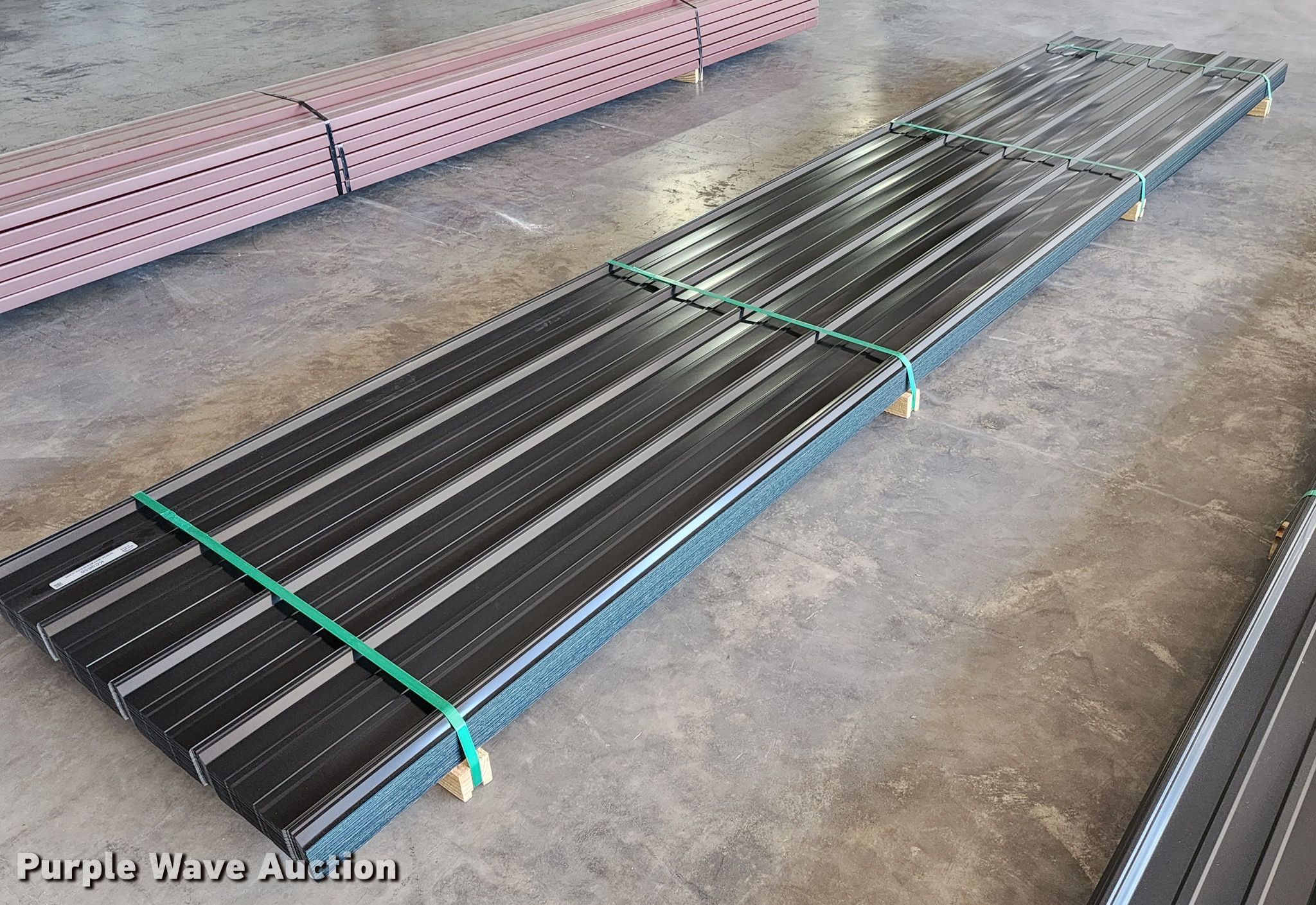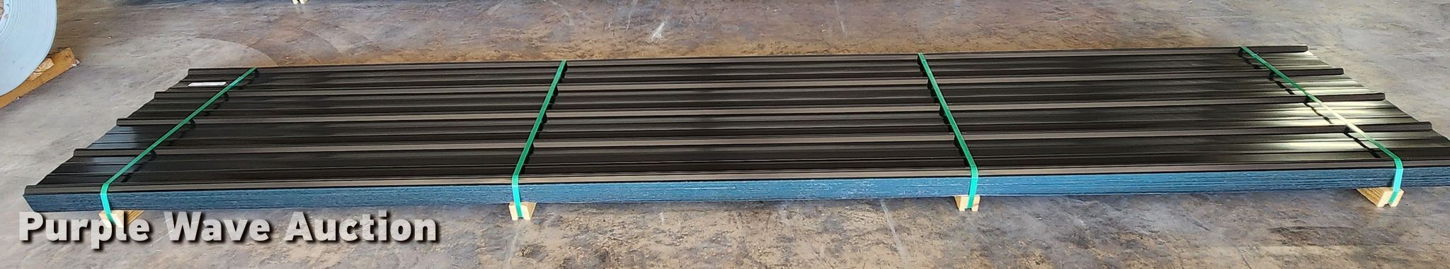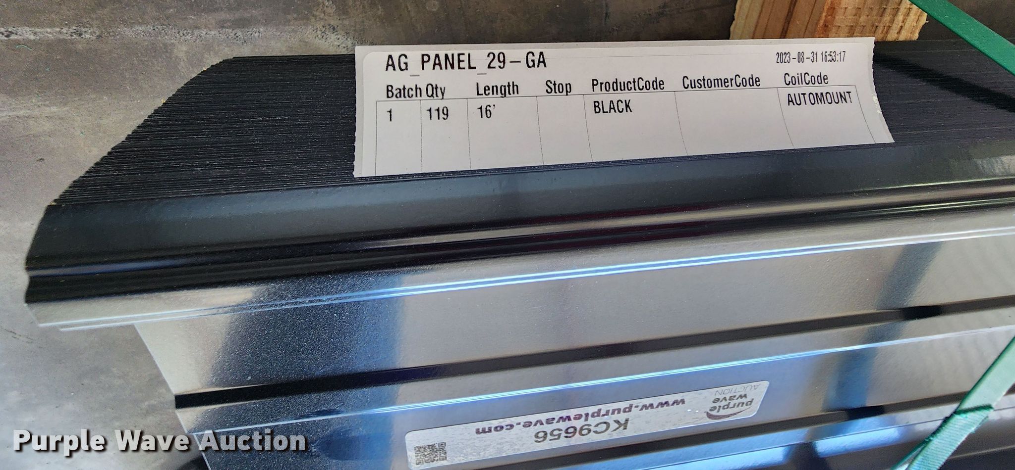 Purple Wave is selling a used Building Materials in Texas. This item is a (119) sheets of Doerkson Metal Components metal siding/roofing with the following: 16' L x 36" W overlap coverage, AG panel profile, 29 gauge, Color: Black, Possible blemishes