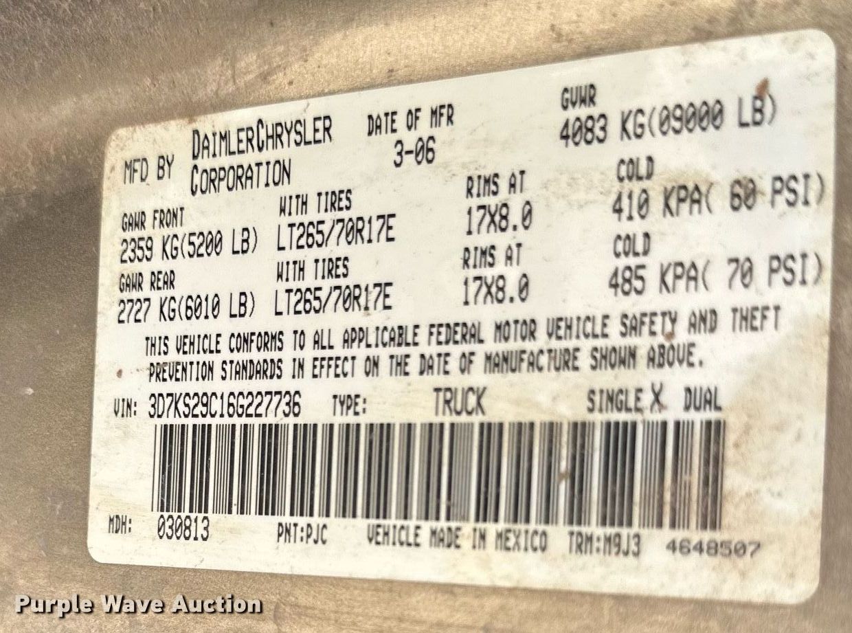 Purple Wave is selling a used 3/4 or 1 Ton Pickup or Van in Texas. This item is a 2006 Dodge Ram 2500 Mega Cab pickup truck with the following: Miles: Unknown, VIN: 3D7KS29C16G227736