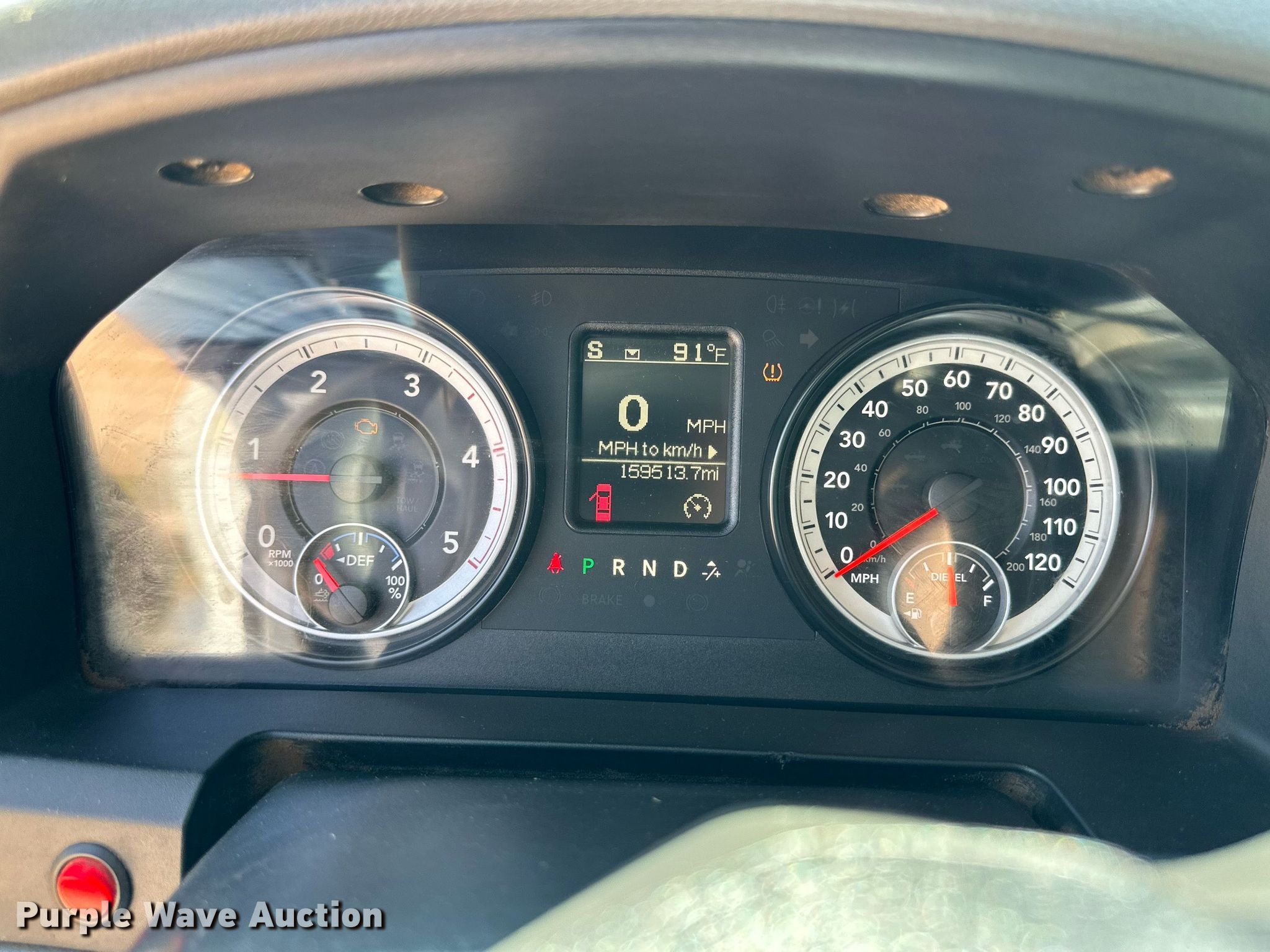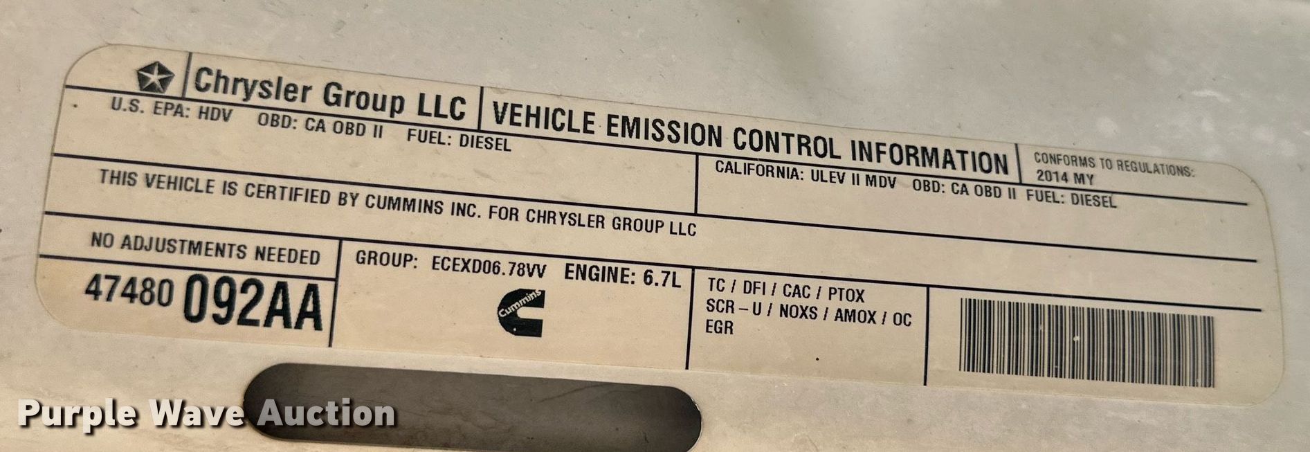 2014 Dodge Ram 2500HD utility bed pickup truck. Miles: 159,514 on odometer, VIN: 3C6MR4AL0EG223477. Engine Displacement: 6.7L L6 OHV, Cylinders: 8, Fuel type: Diesel. Transmission Automatic. Interior AC, Heat, Heated mirrors, Power windows, Power locks, Cruise control. Features Utility bed 9' 8" L x 80" W. Tires Size: 33/12.5R18. Notes Dash warning indicator: Check engine, TPMS, Windshield chipped or cracked. Texas title. Title distribution may be delayed up to 14 days from verification of funds. United Ag LLC. Plainview, TX 79072