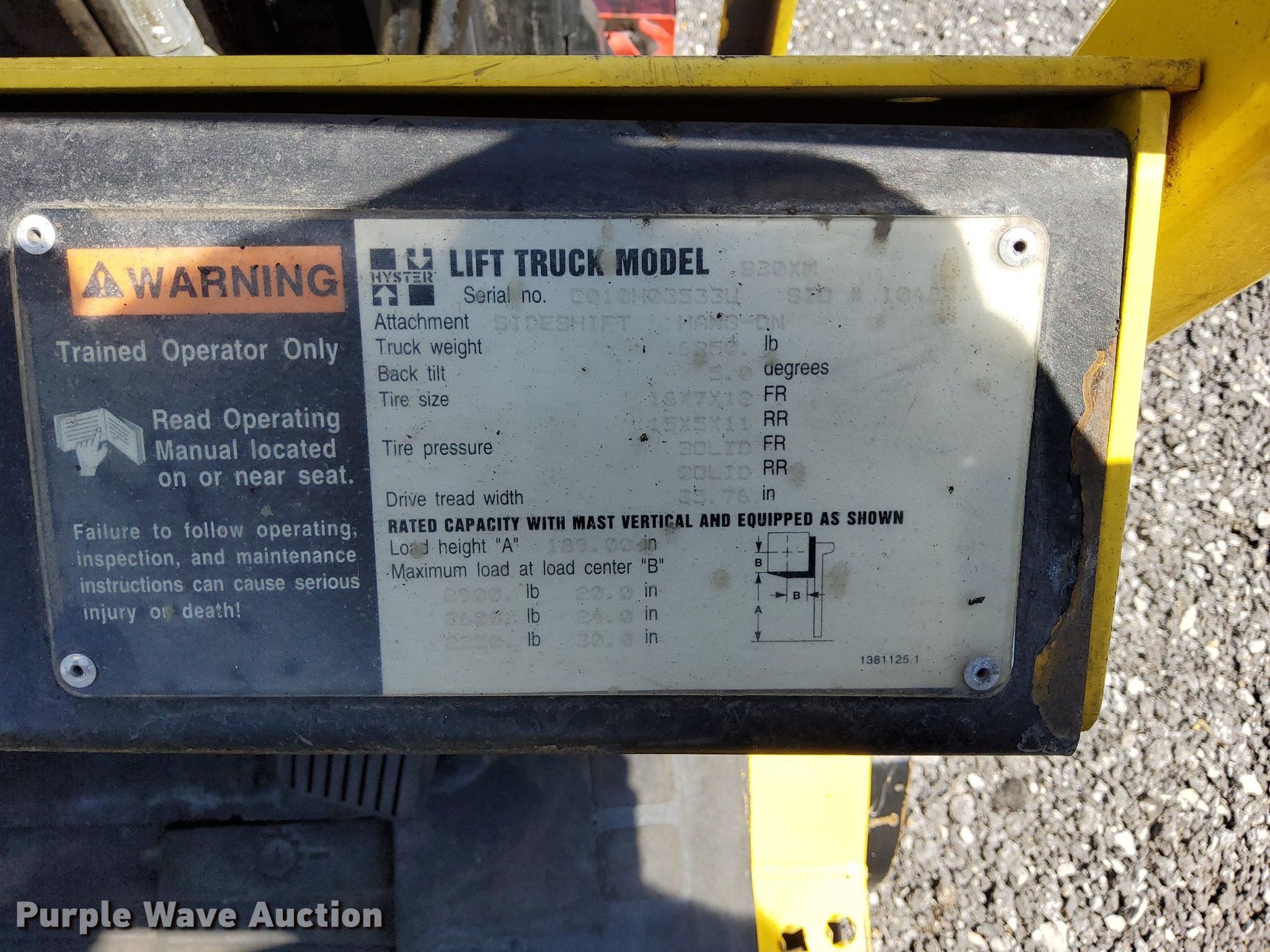 Purple Wave is selling a used Warehouse Forklift in Oklahoma. This item is a Hyster 30 forklift with the following: Hours: Unknown