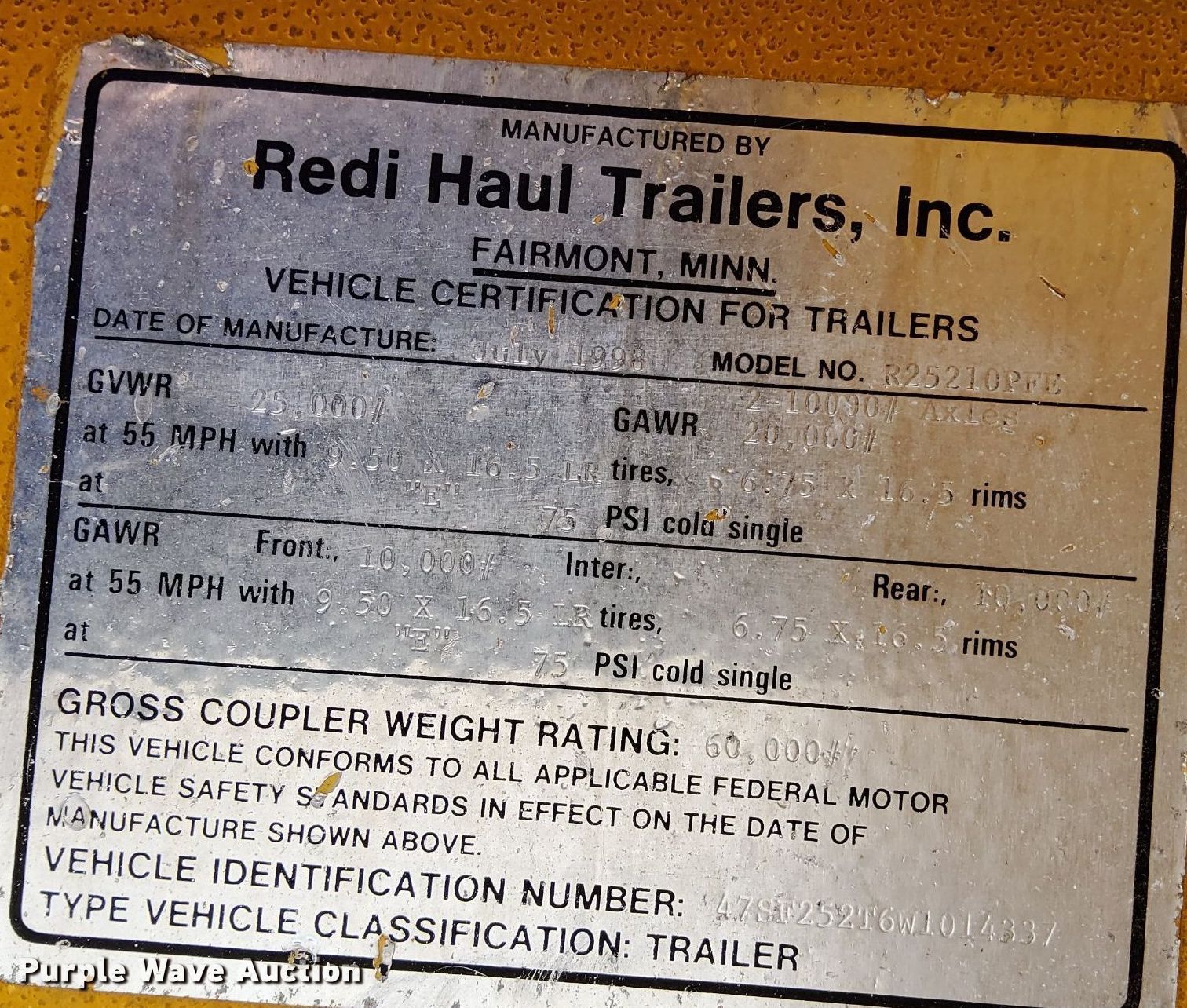 1998 Redi Haul R25210PFE equipment trailer. VIN: 47SF252T6W1014337. Dimensions Overall: 30' L x 96" W, Deck: 20' L x 92" W, Tail length: 5', Ramps: Manual Length: 5'. Features Deck type: Wood. Chassis Hitch: Pintle, Landing gear: Dual, Suspension: Spring, Brakes: Electric, Axles: Tandem, GVWR: 25,000 lbs, GAWR: 10,000 lbs. Tires Steel wheels, Size: 9.50R16.5. Notes Holes in deck. Oklahoma title. Title distribution may be delayed up to 14 days from verification of funds. 15107 North 137th East Avenue. Collinsville, OK 74021