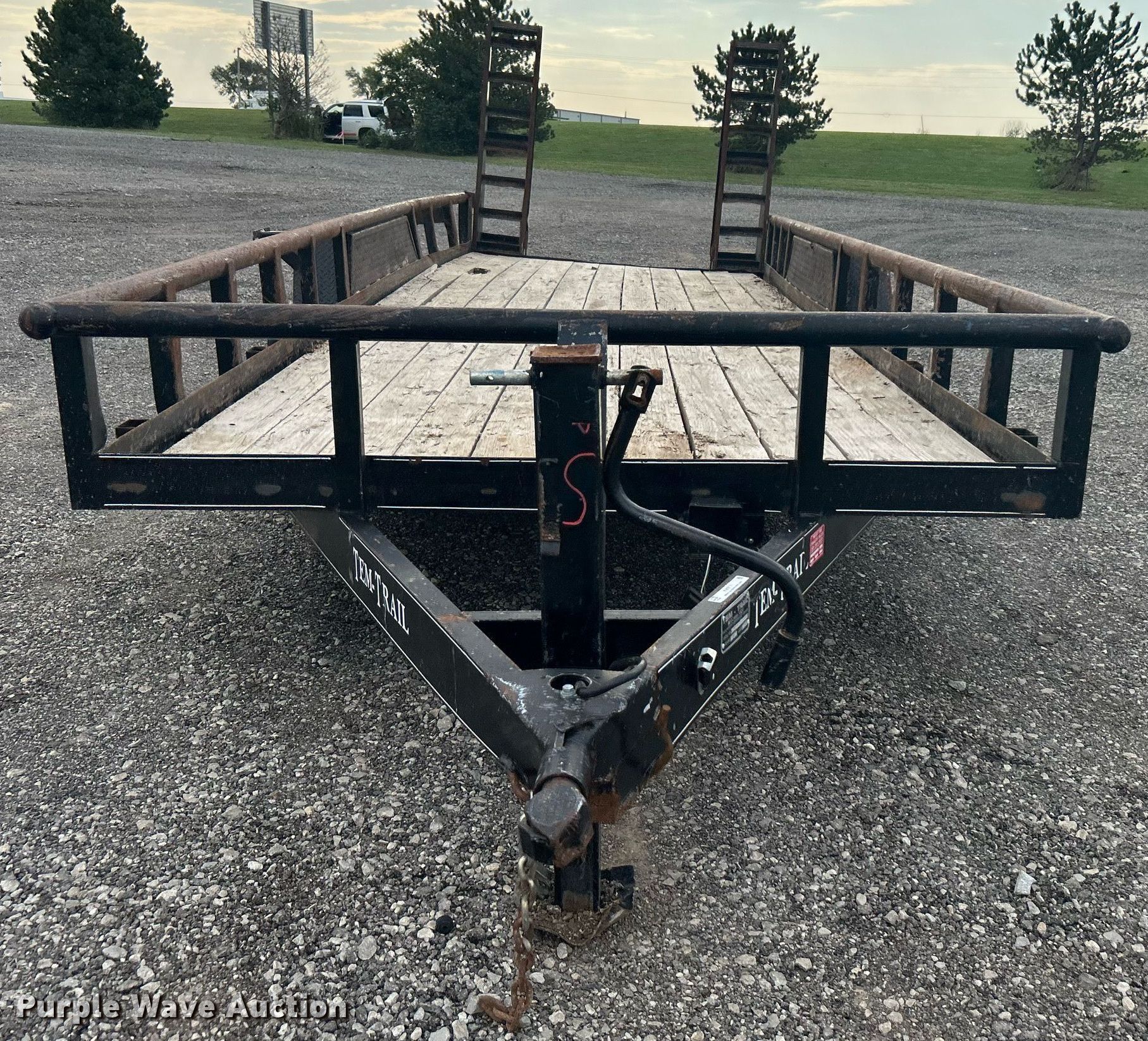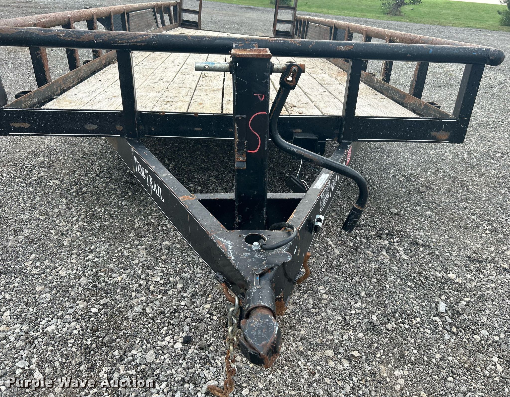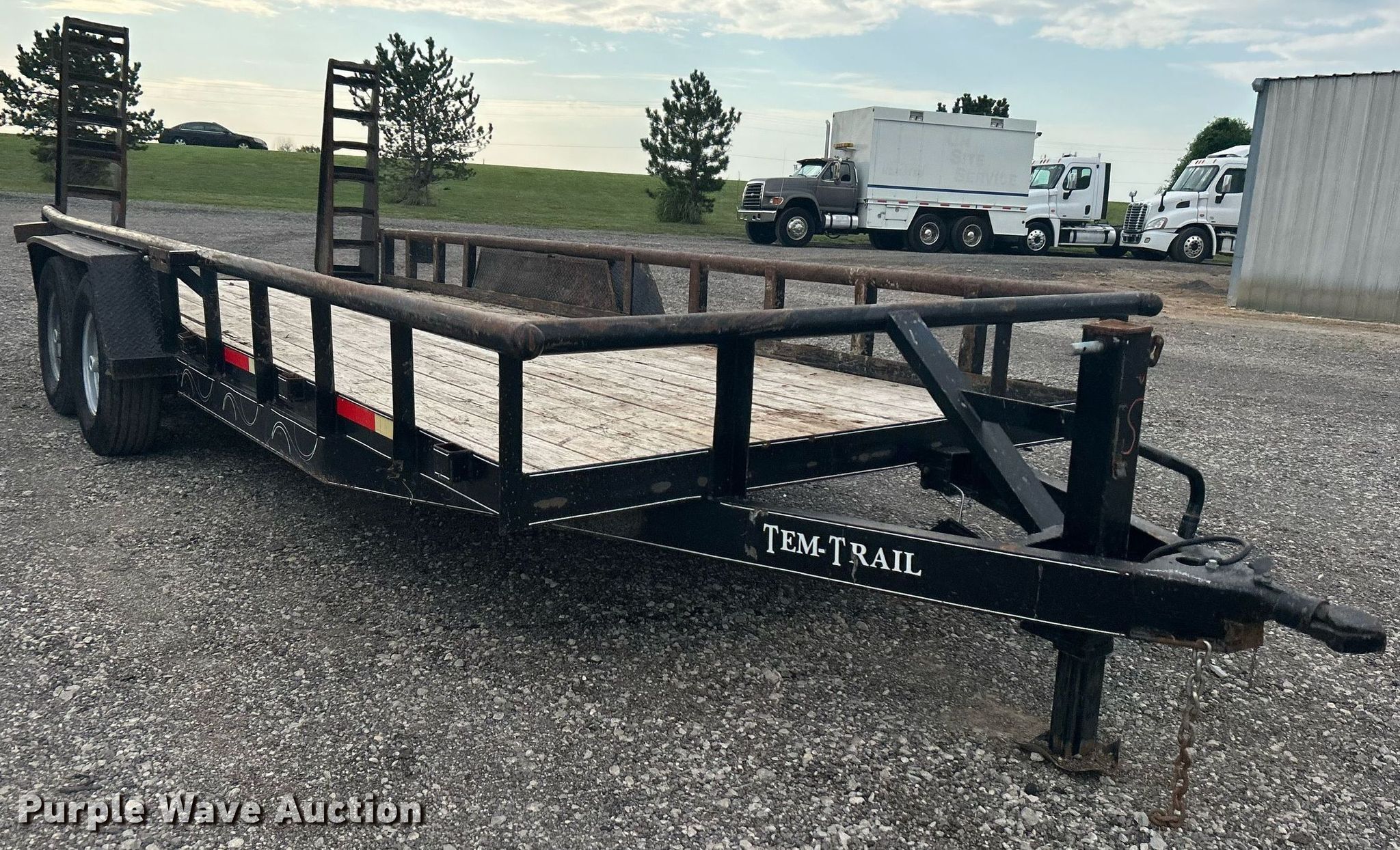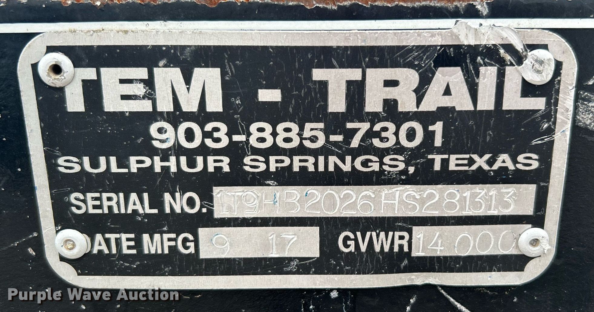 2017 Tem-Trail utility trailer. VIN: 1T9HB2026HS281313. Dimensions Overall: 24' L x 105" W, Deck: 20' L x 82" W, Ramps: Manual Length: 5'. Features Deck type: Wood. Chassis Ball hitch: 2 5/16", Landing gear: Single, Suspension: Spring, Brakes: Electric, Axles: Tandem, GVWR: 14,000 lbs. Tires Steel wheels, Size: 235/80R16. Notes Tongue twisted. Oklahoma title. Title distribution may be delayed up to 14 days from verification of funds. 15107 North 137th East Avenue. Collinsville, OK 74021