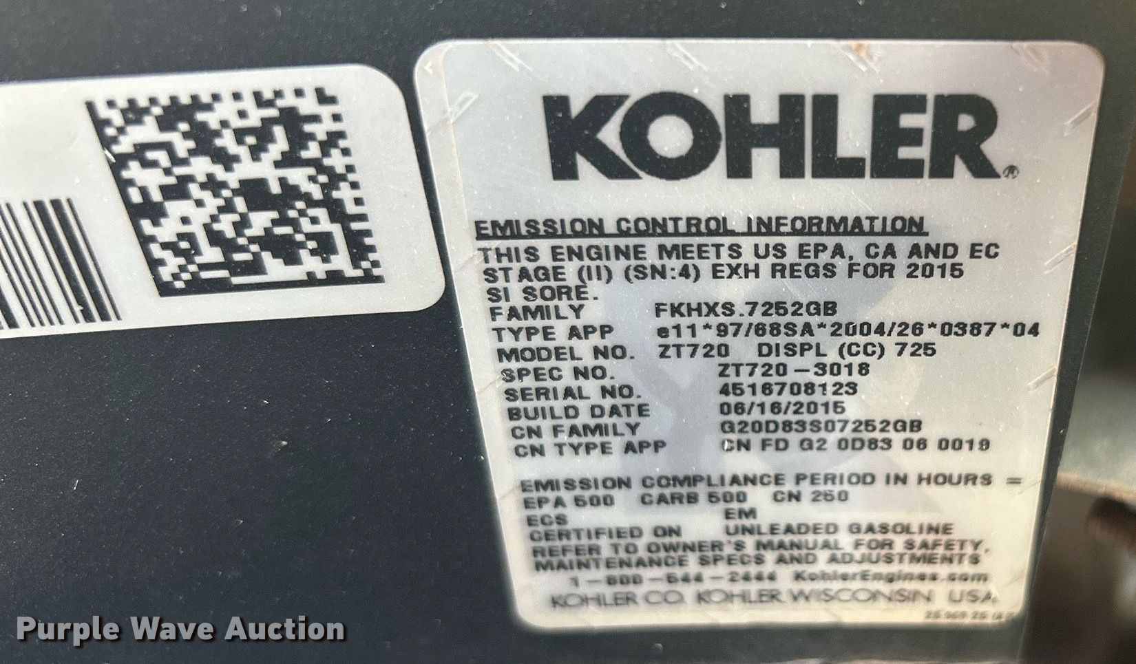 Toro ZX Series ZTR lawn mower. Hours: 228 on meter, Cutting width: 48", Serial: 316000381. Engine Kohler Confidant, Displacement: 725 cc, Cylinders: 2, Fuel type: Gas, HP: 21. Transmission Hydrostatic. Operators station OROPS. Tires Front: 13x5.00-6, Rear: 22x9.50-10 NHS. Kinnunen Sales & Service. 620 East 6th Avenue. Stillwater, OK 74074