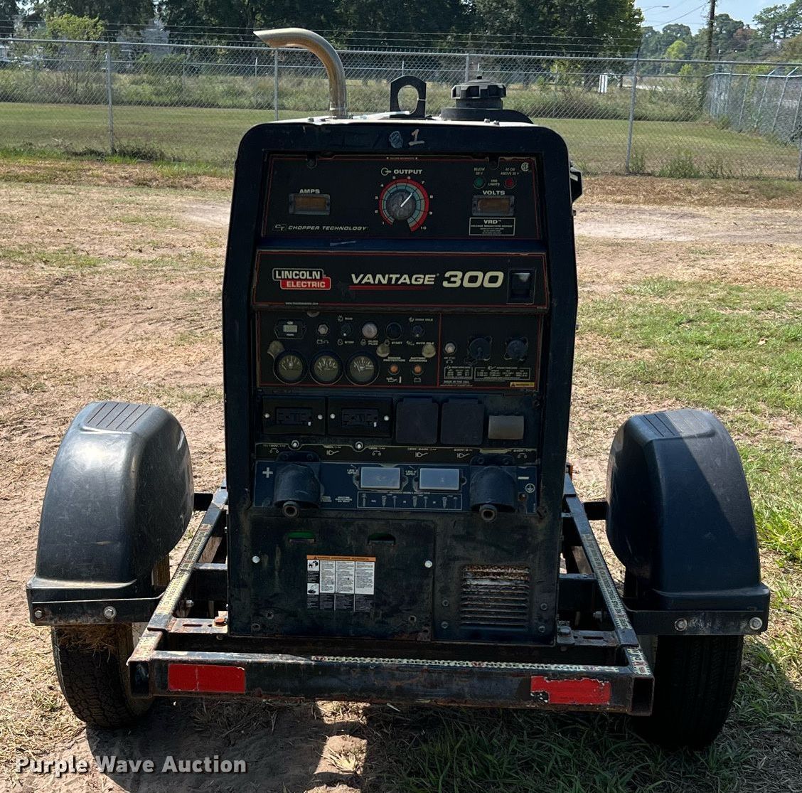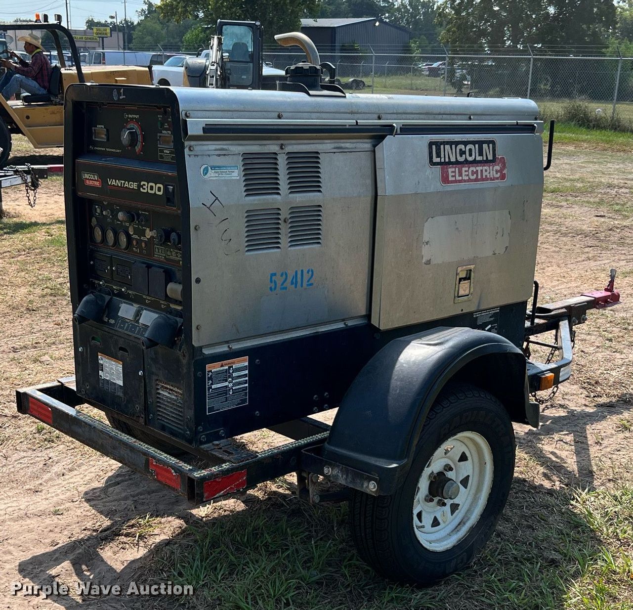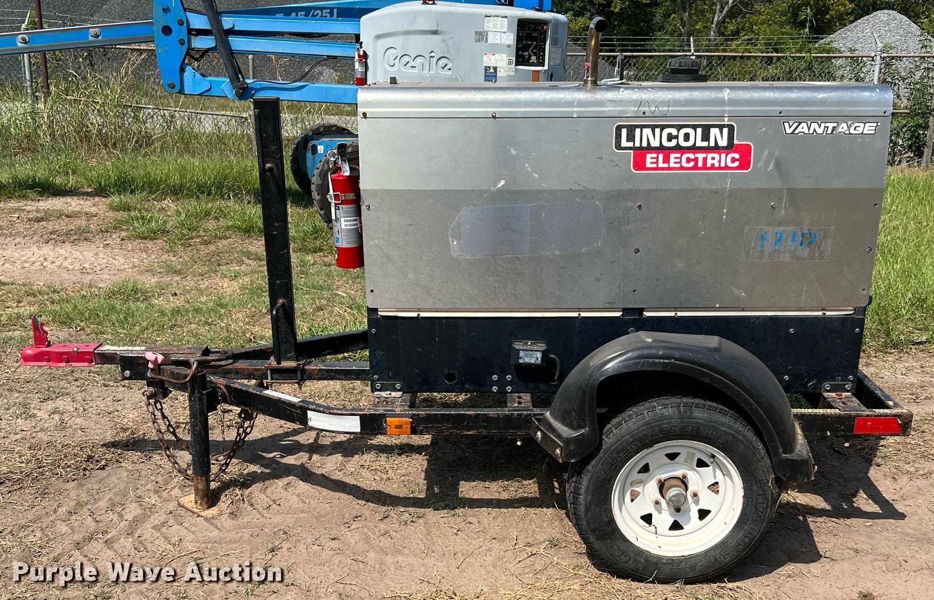 2017 Lincoln Electric Vantage 300 welder/generator. Hours: 5,378 on meter, Serial: U1170801938. Engine Kubota V1505, Displacement: 1.5L, Cylinders: 4, Fuel type: Diesel. Features Welder Capabilities: CC, CV, DC, Wire, TIG, Stick, Fuel tank, Trailer mounted, Generator Watts: 10,000, Phase: Single, Three, 240V outlets: 2, 120V outlets: 4. Trailer 9.5' L x 62" W, Ball hitch size: 2", Suspension: Spring, Axles: Single, Tire size: 175/80D13. This is worksite support equipment and will not come with a title. Transfer of ownership documentation will be a bill of sale. Plunkett Enterprises. 995 South Front Street. Angleton, TX 77515
