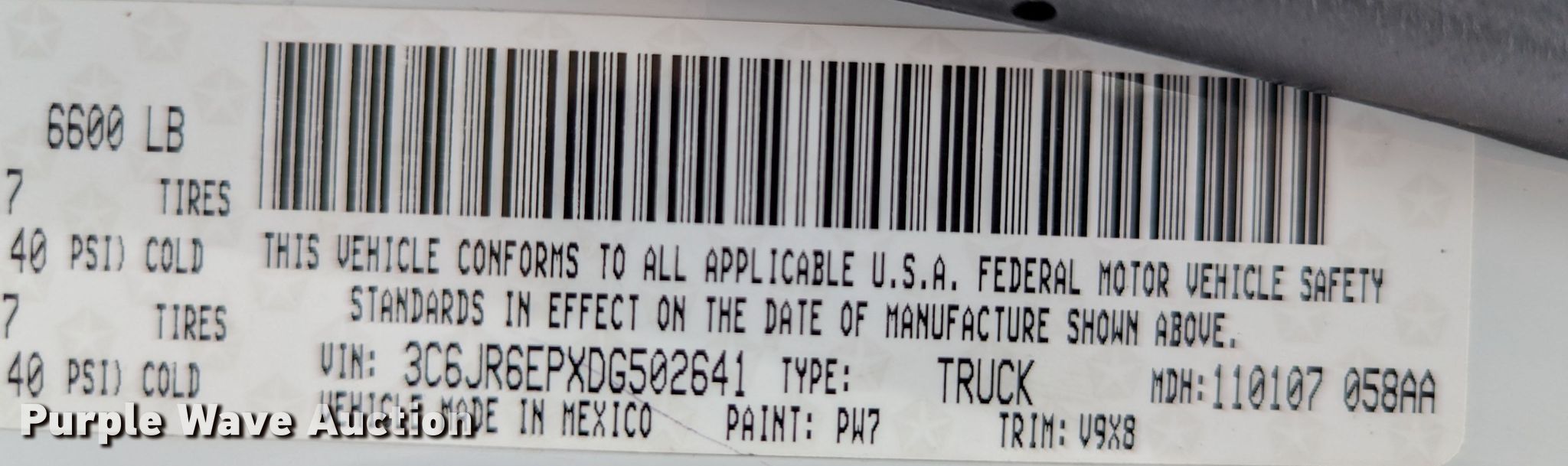 2013 Dodge Ram 1500 SLT pickup truck. Miles: 48,528 on odometer, VIN: 3C6JR6EPXDG502641. Engine Displacement: 4.7L V8 SOHC, Cylinders: 8, Fuel type: Gas. Transmission Automatic. Interior AC, Heat, Heated mirrors, Power windows, Power locks, Cruise control. Tires Size: 265/70R17. Notes Dash warning indicator: Airbag. Oklahoma title. Title distribution may be delayed up to 30 days from verification of funds. 7600 North Bryant Avenue. Oklahoma City, OK 73121