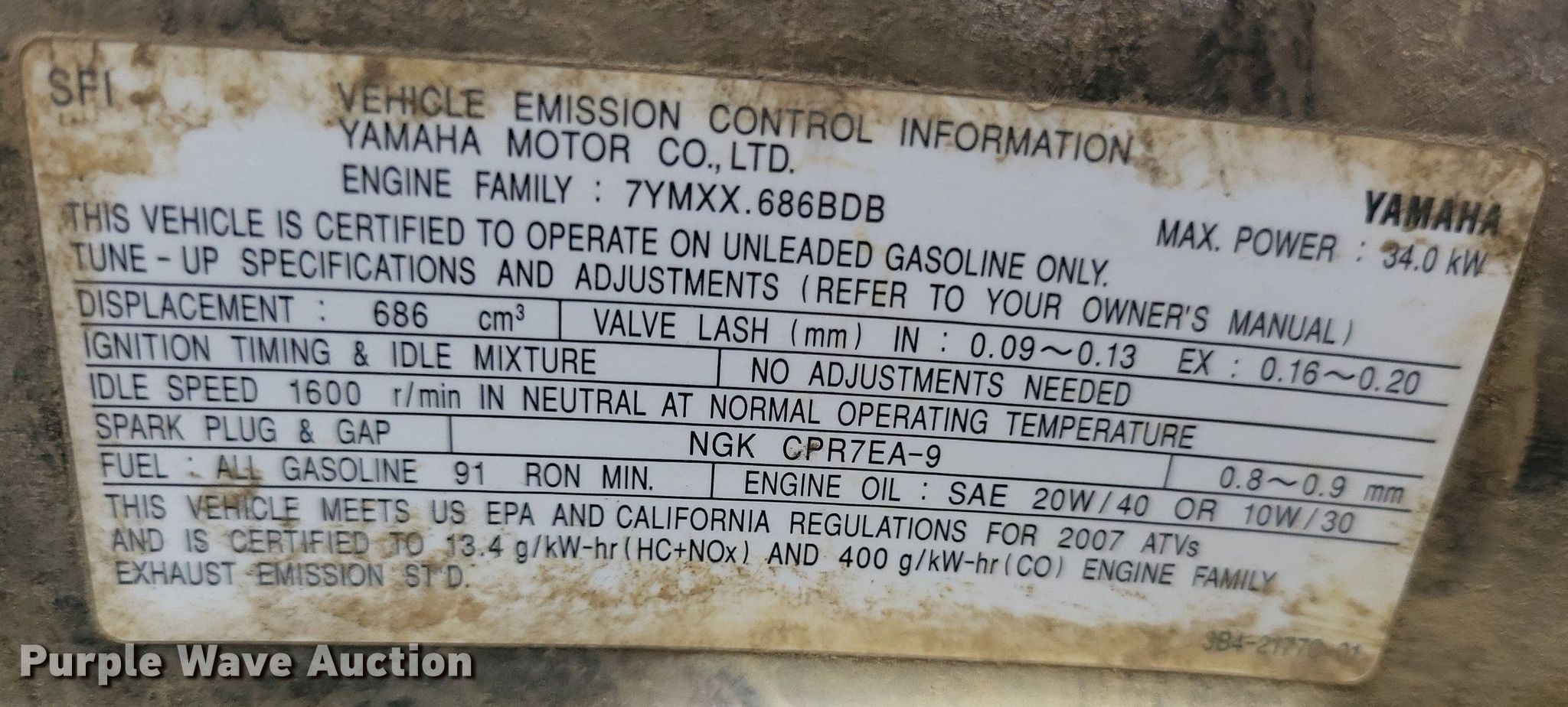 Purple Wave is selling a used ATV in Missouri. This item is a 2007 Yamaha Grizzly 700FI ATV with the following: Hours: 523 on meter, VIN: JY4AM09Y370005721