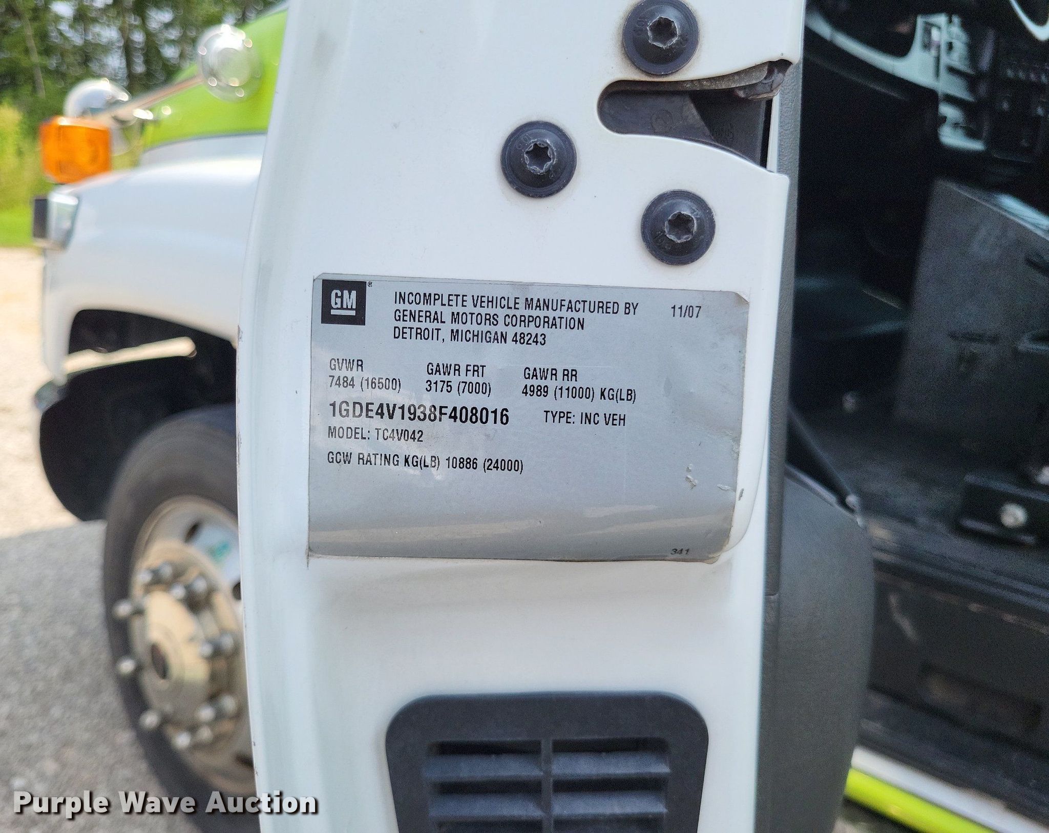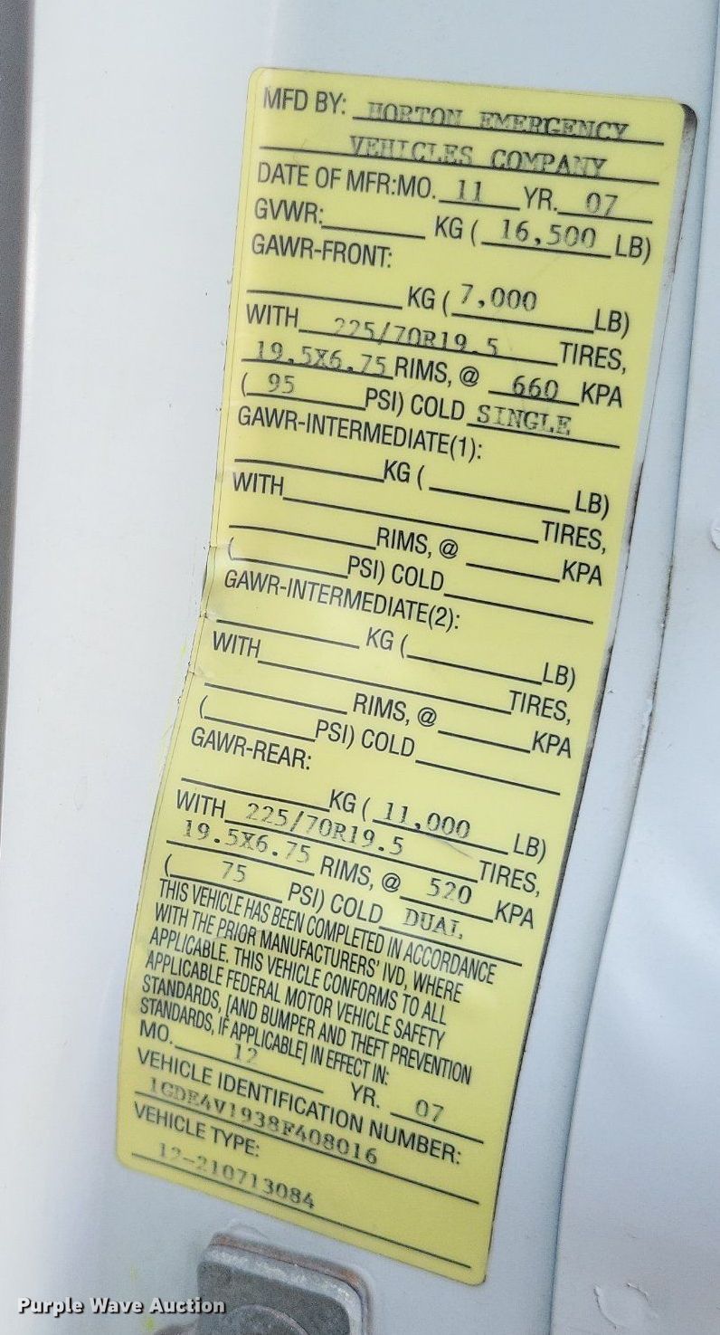 2008 GMC C4500 ambulance. Miles: 110,359 on odometer, VIN: 1GDE4V1938F408016. Engine Displacement: 6.6L, Cylinders: 8, Fuel type: Diesel, HP: 300. Transmission Automatic. Chassis Axles: Single, Suspension: Spring, Brakes: Hydraulic, GVWR: 16,500 lbs. Interior AC, Heat, Heated mirrors, Power windows, Power locks, Auxiliary controls. Features Ambulance body Horton 555C-III, PA/ siren controls, Oxygen hookups. Tires Size: 225/70R19.5. Notes Automatic tire chains , Rear door glass broken. Missouri title. Title distribution may be delayed up to 30 days from verification of funds. South 61 LLC. 111 South Kingshighway. Perryville, MO 63775