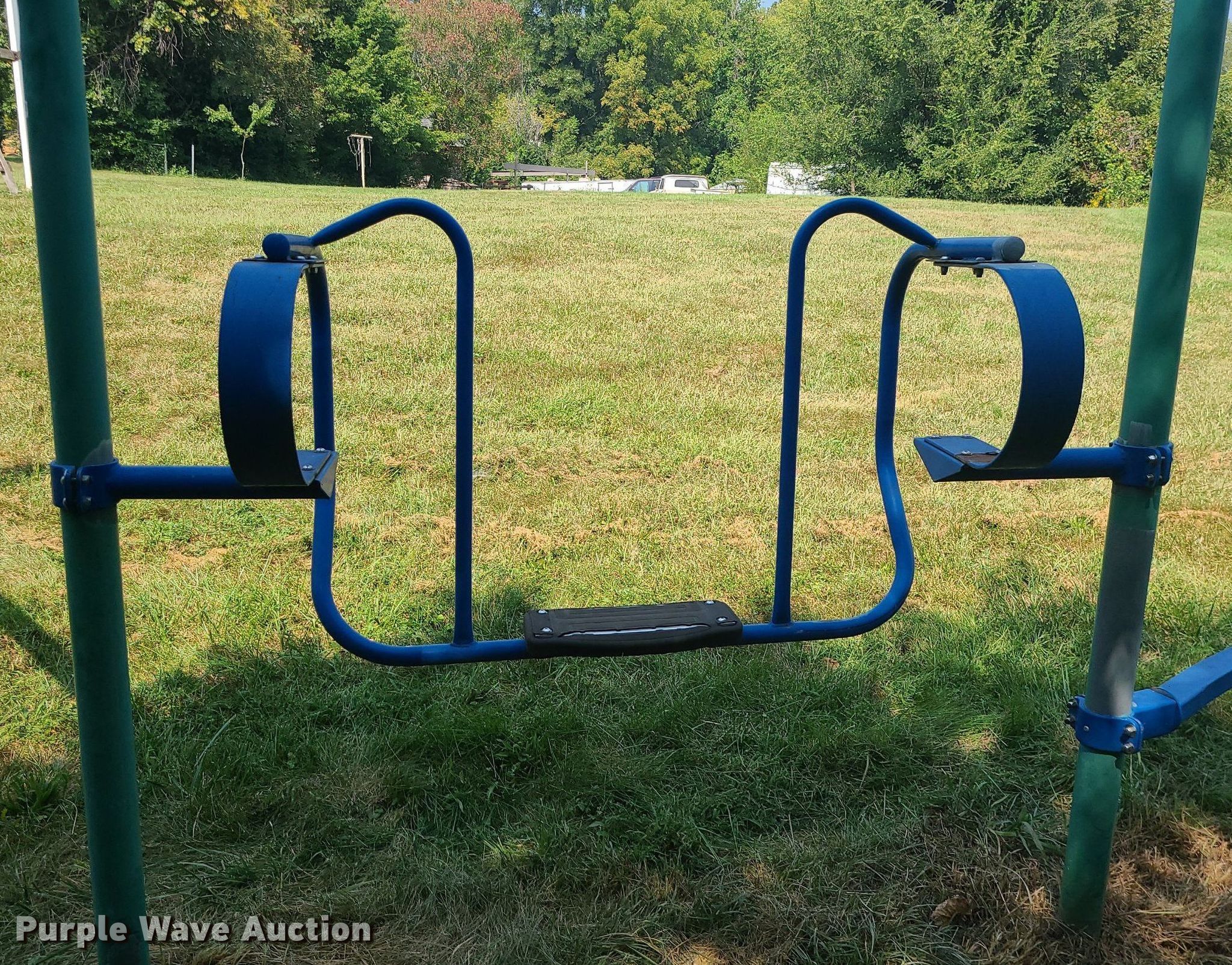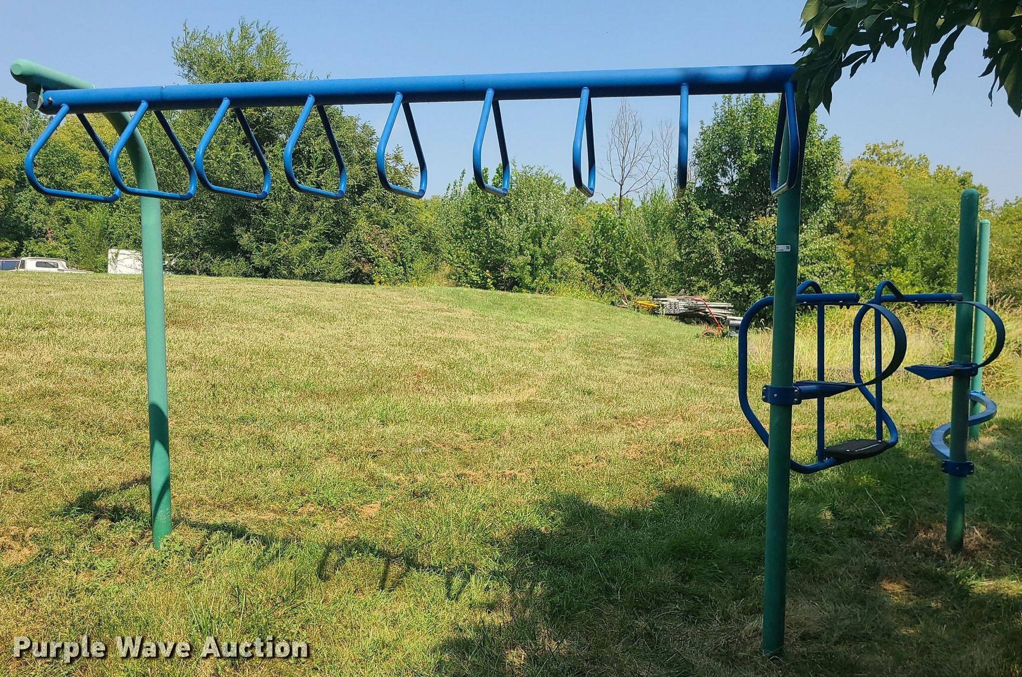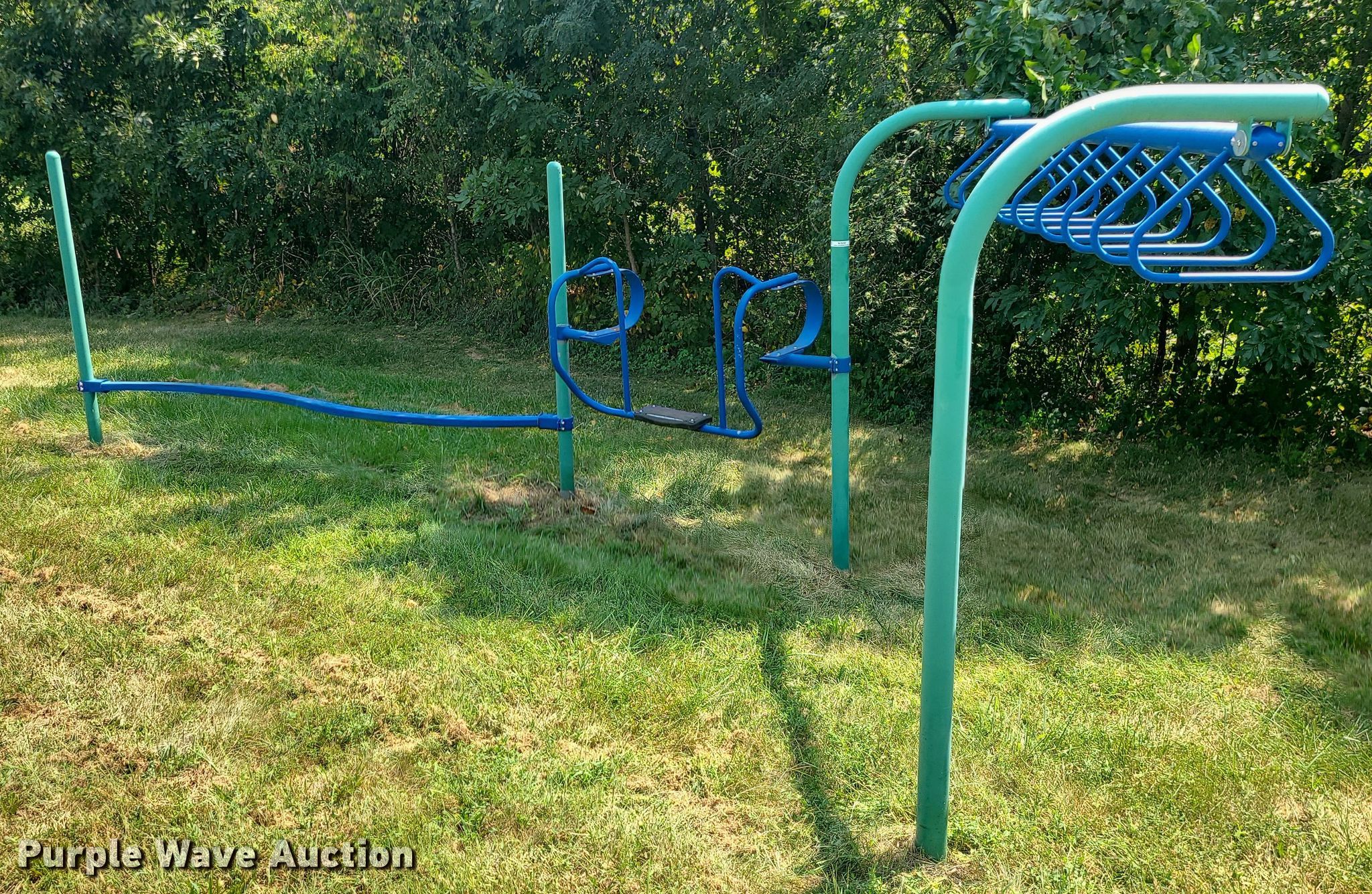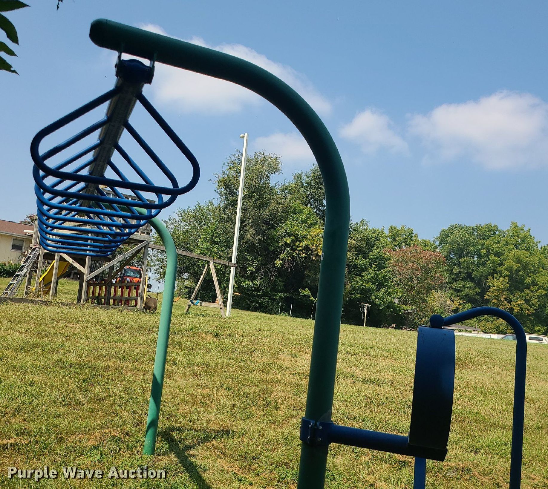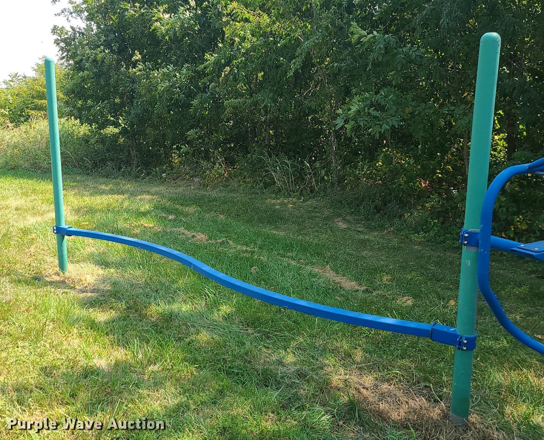 Purple Wave is selling a used Sporting Goods in Missouri. This item is a Playground with the following: Monkey bars, Spring swing, Balance beam