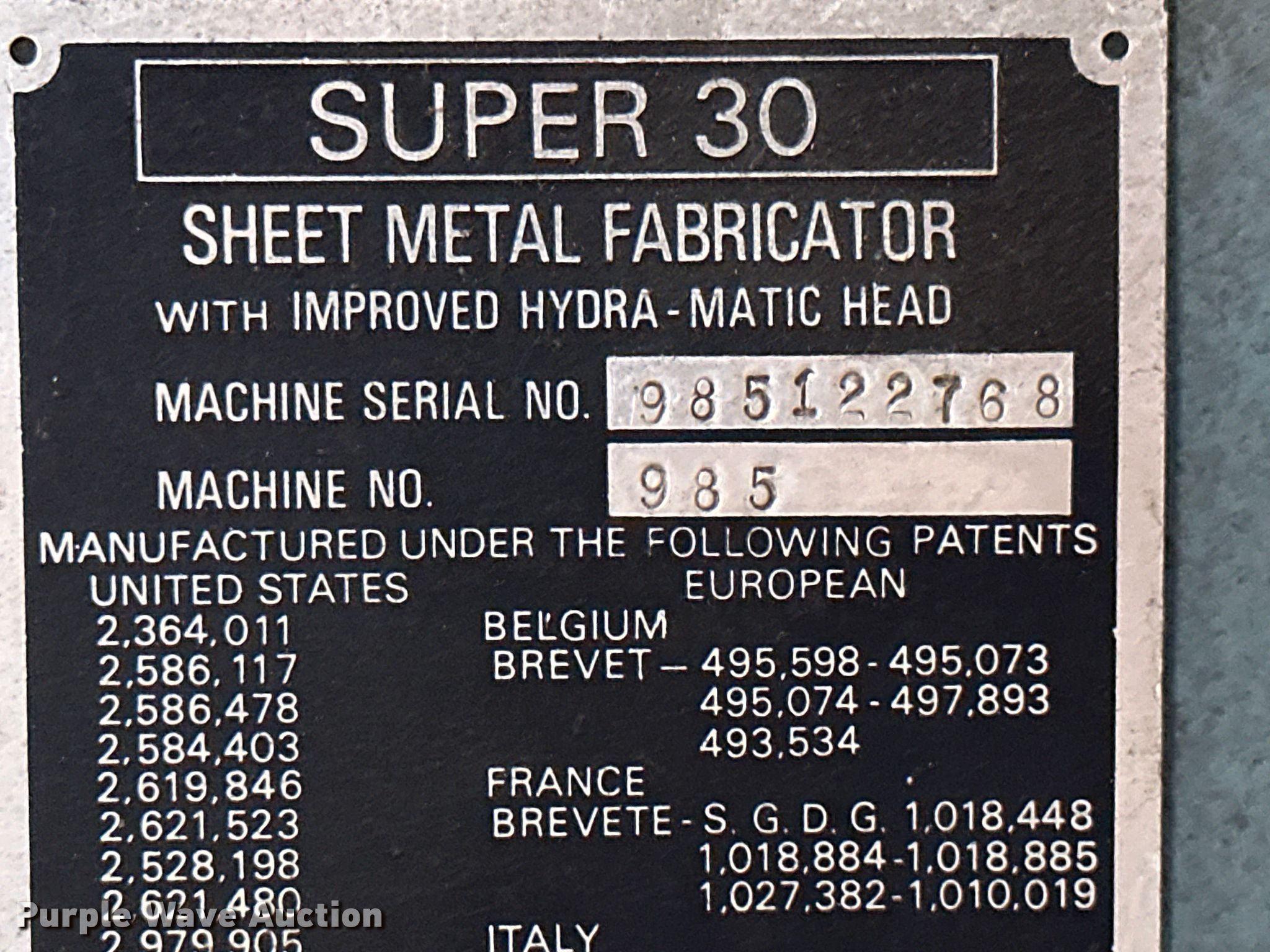 Purple Wave is selling a used Machine Shop Tools and Equip. in Oklahoma. This item is a Strippit Super 30/30 punch with the following: Serial: 985122768