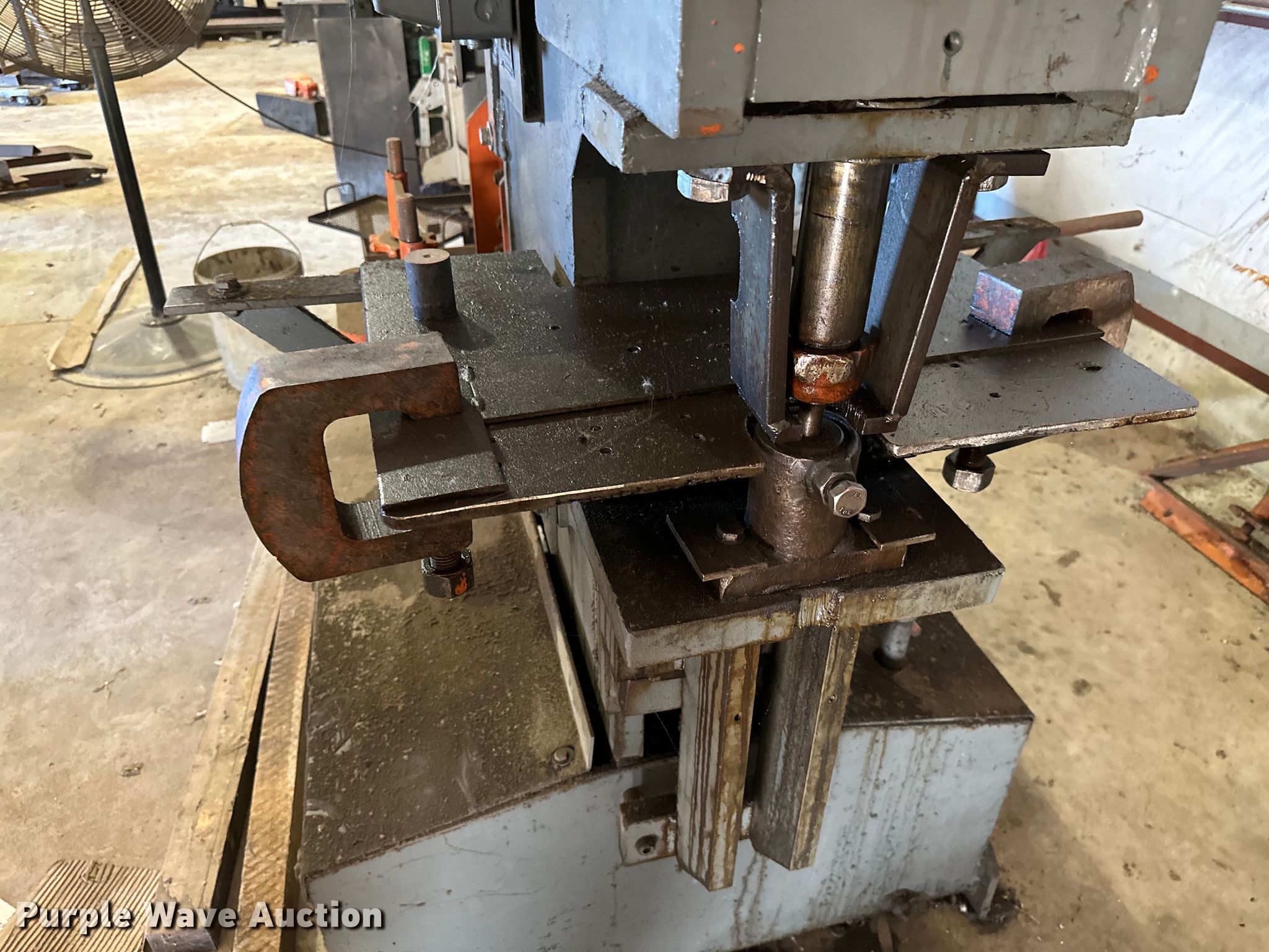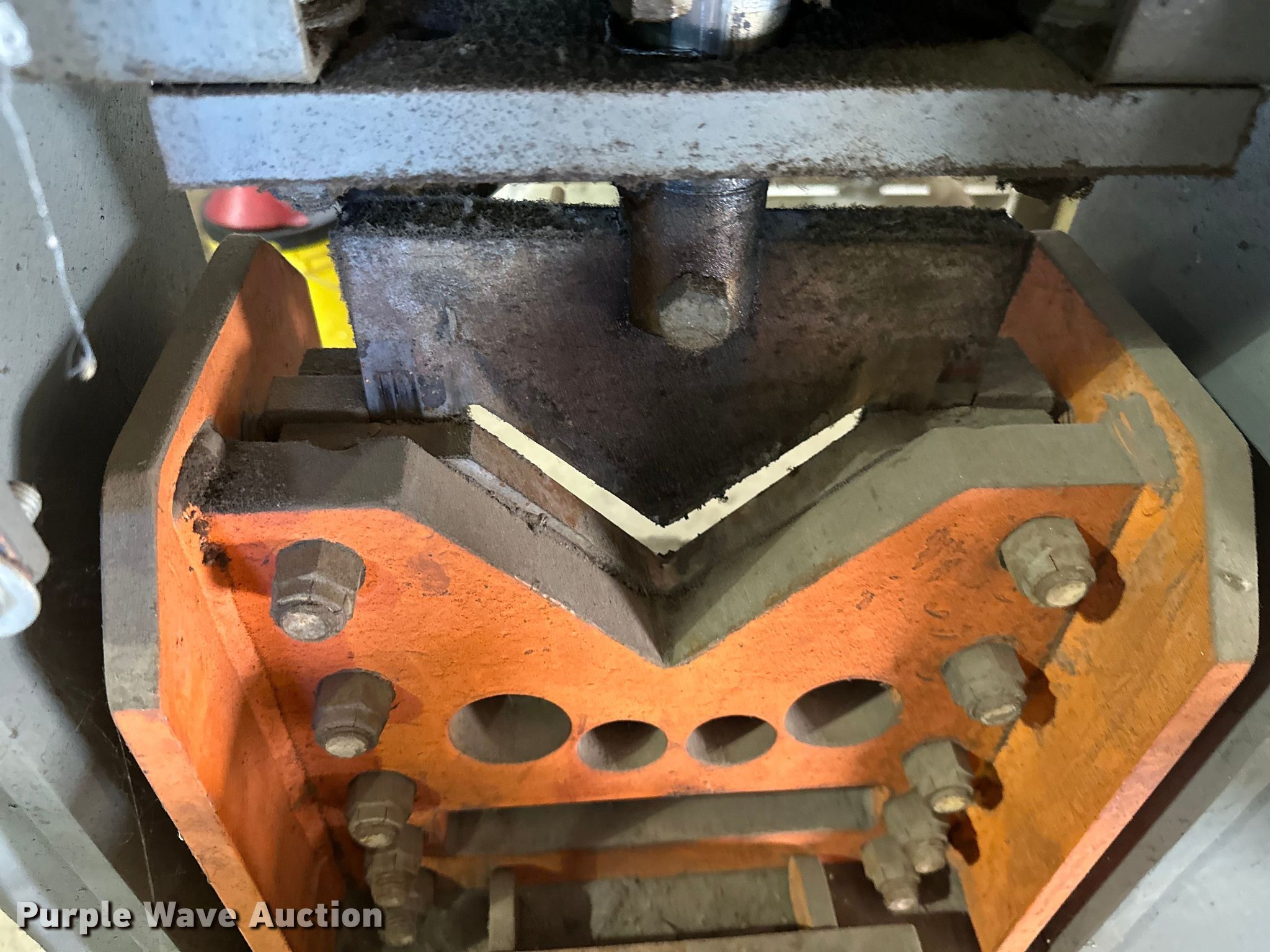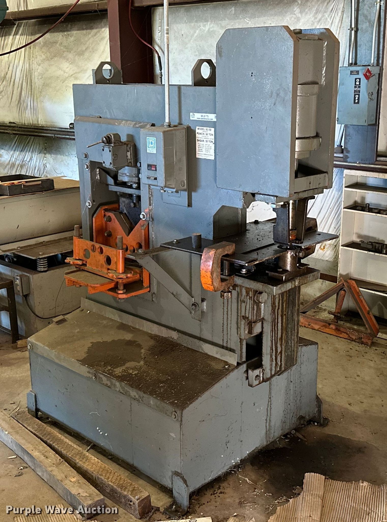 Honeoye Model 50/50 shear. Electric Motor. Phase: Three. Features Punch Capacity: 50 ton , Stroke: 4" , 1 1/4" hole through 1/2" mild steel, Shear Capacity: 50 ton, Capacities: 90 degree angle: 4 x 4 x 3/8", 40 degree miter: 3 x 3 x 3/8", Flat bar: 3/4" x 8", Round: 1 3/8", Square: 1 1/4". Claremore, OK 74018
