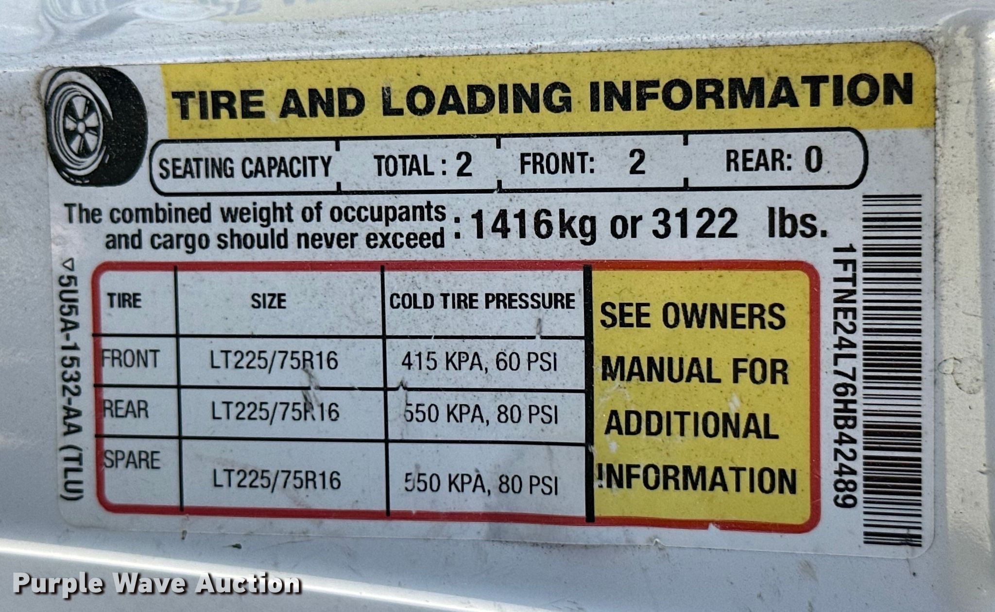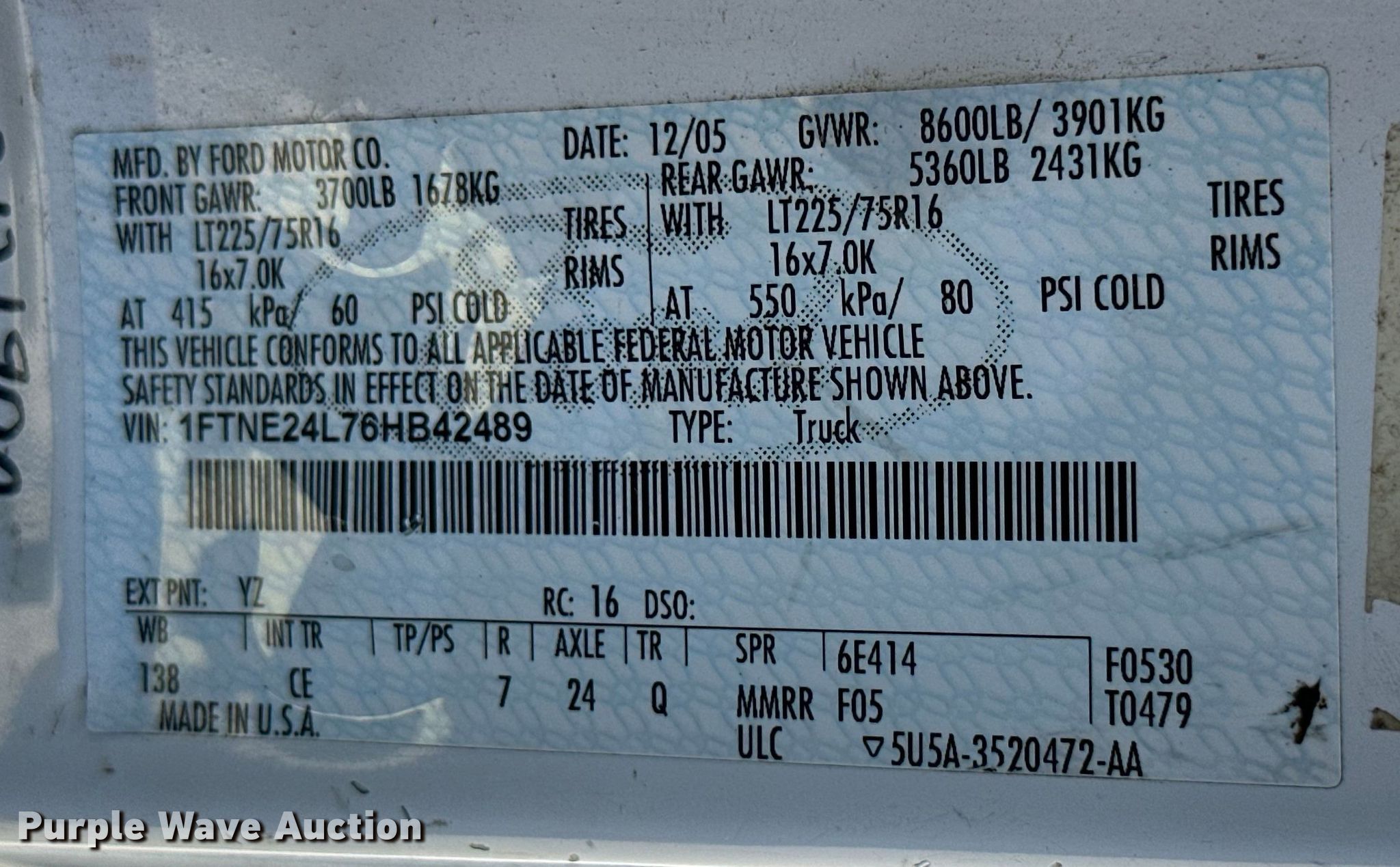 2006 Ford E250 van. Miles: 131,073 on odometer, VIN: 1FTNE24L76HB42489. Engine Displacement: 5.4L V8 SOHC, Cylinders: 8, Fuel type: Gas. Transmission Automatic. Interior AC, Heat. Tires Size: 245/75R16. Notes Dead battery. Oklahoma title. Title distribution may be delayed up to 14 days from verification of funds. 4120 Webb Street. Pryor, OK 74361