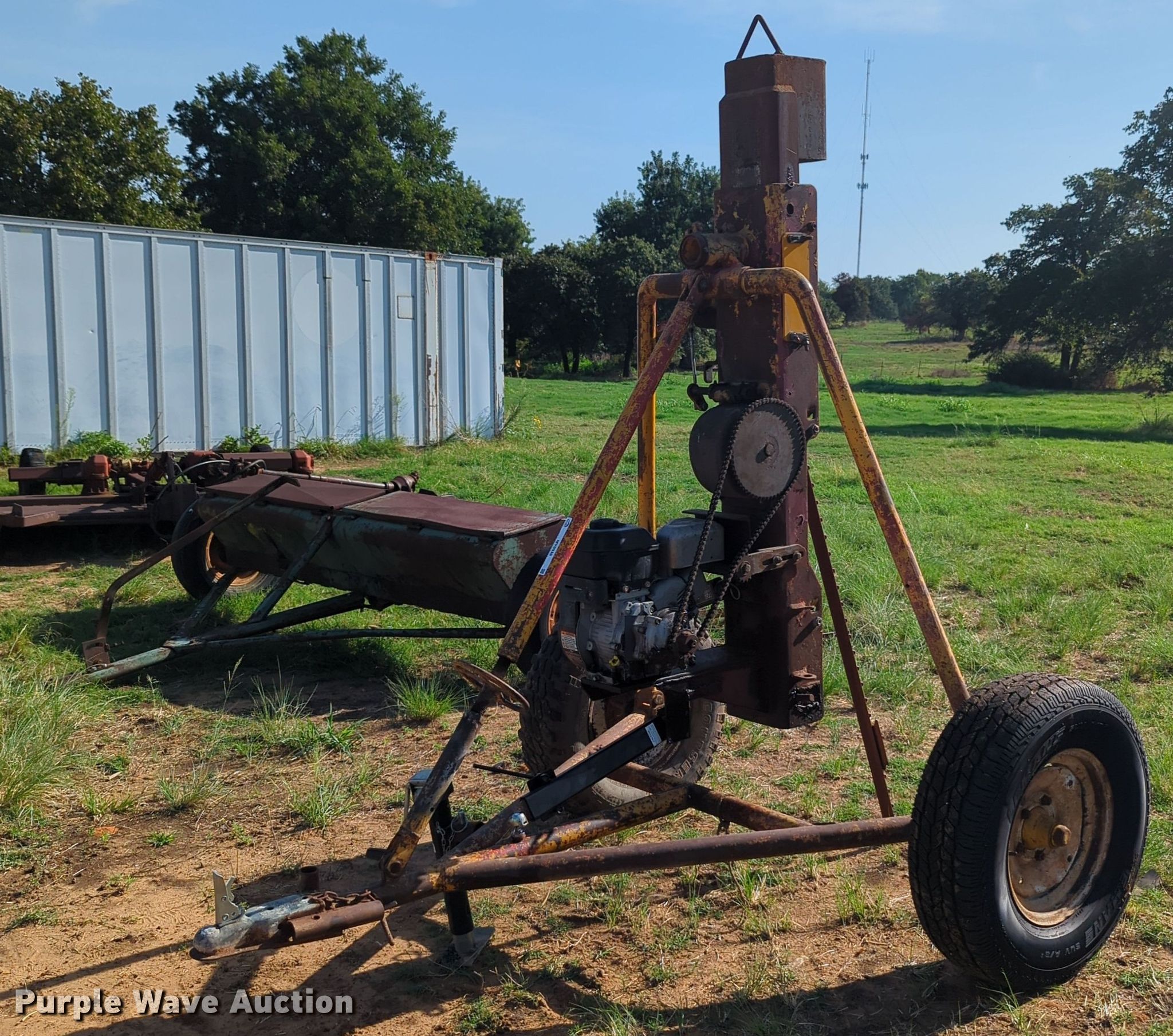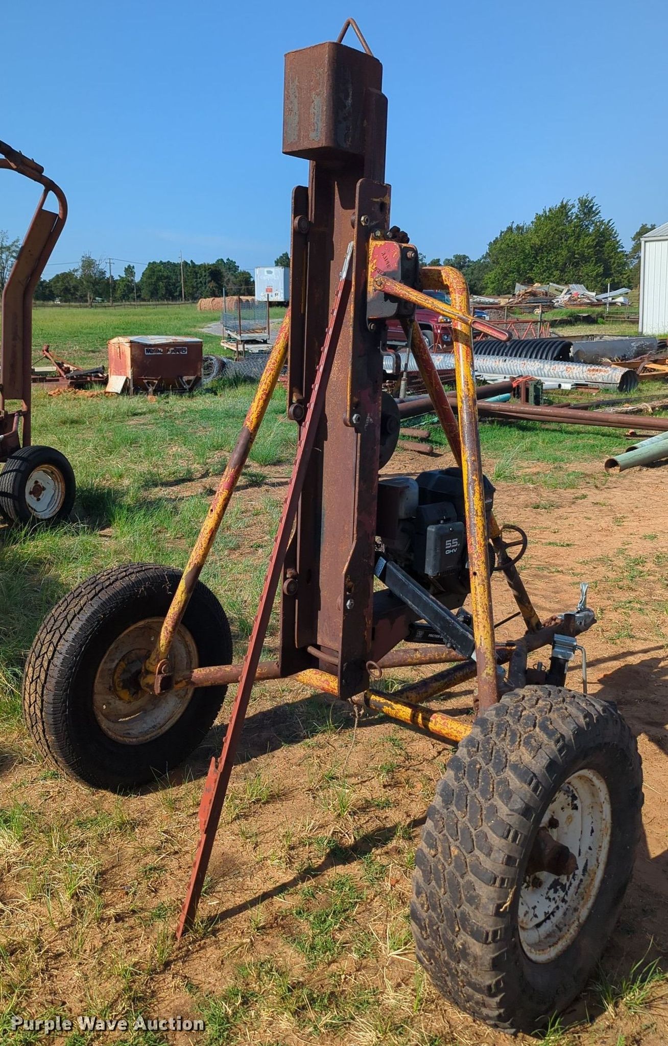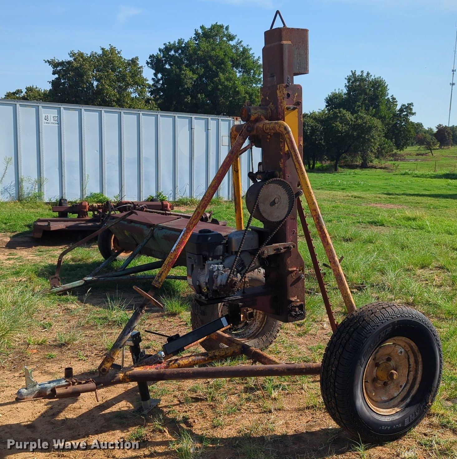 Purple Wave is selling a used Ag Equip. Other in Oklahoma. This item is a Post driver with the following: Single cylinder gas engine, Hydraulic driven, 2" ball hitch, 16" tires