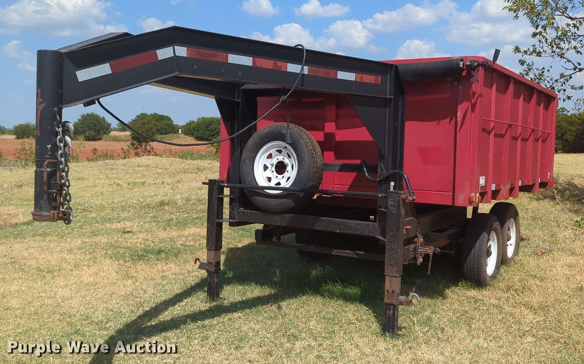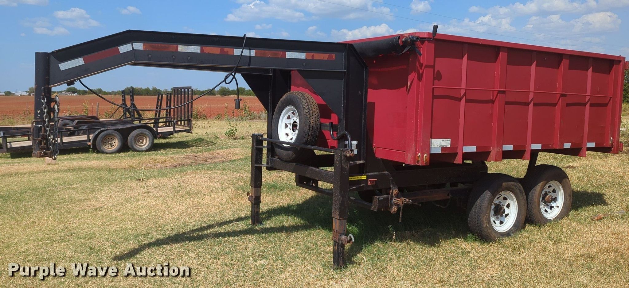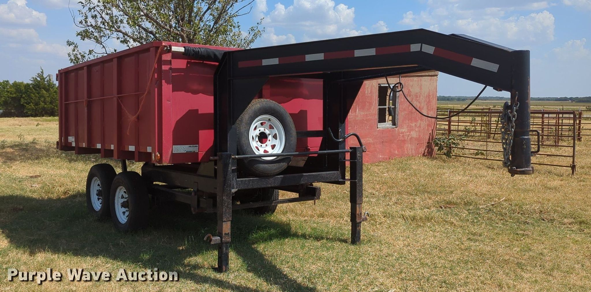 2012 All Right Steel dump trailer. VIN: 1A9HD2020CC857099. Dimensions Overall: 19' L x 102" W, Body: 10' L x 102" W, Sideboard height: 36". Features Body type: Steel, Ram: Single, End gate: Manual Grain door. Chassis Hitch: Gooseneck, Landing gear: Dual, Suspension: Spring, Brakes: Electric, Axles: Tandem, GVWR: 14,000 lbs. Tires Size: 225/80R16. Transfer of ownership documentation will be a bill of sale. 5102 SW 11th St. Lawton, OK 73501
