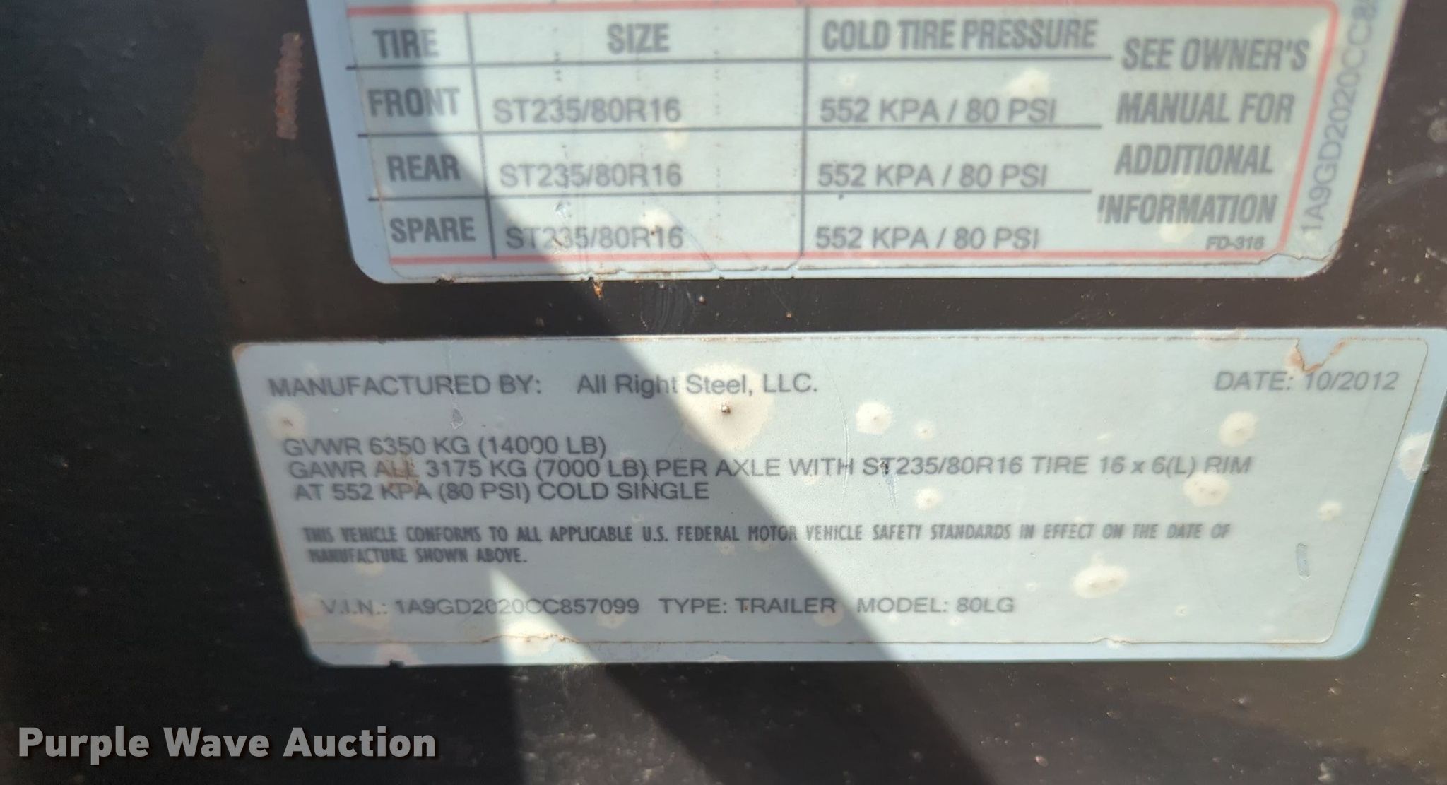Purple Wave is selling a used Dump Trailer in Oklahoma. This item is a 2012 All Right Steel dump trailer with the following: VIN: 1A9HD2020CC857099