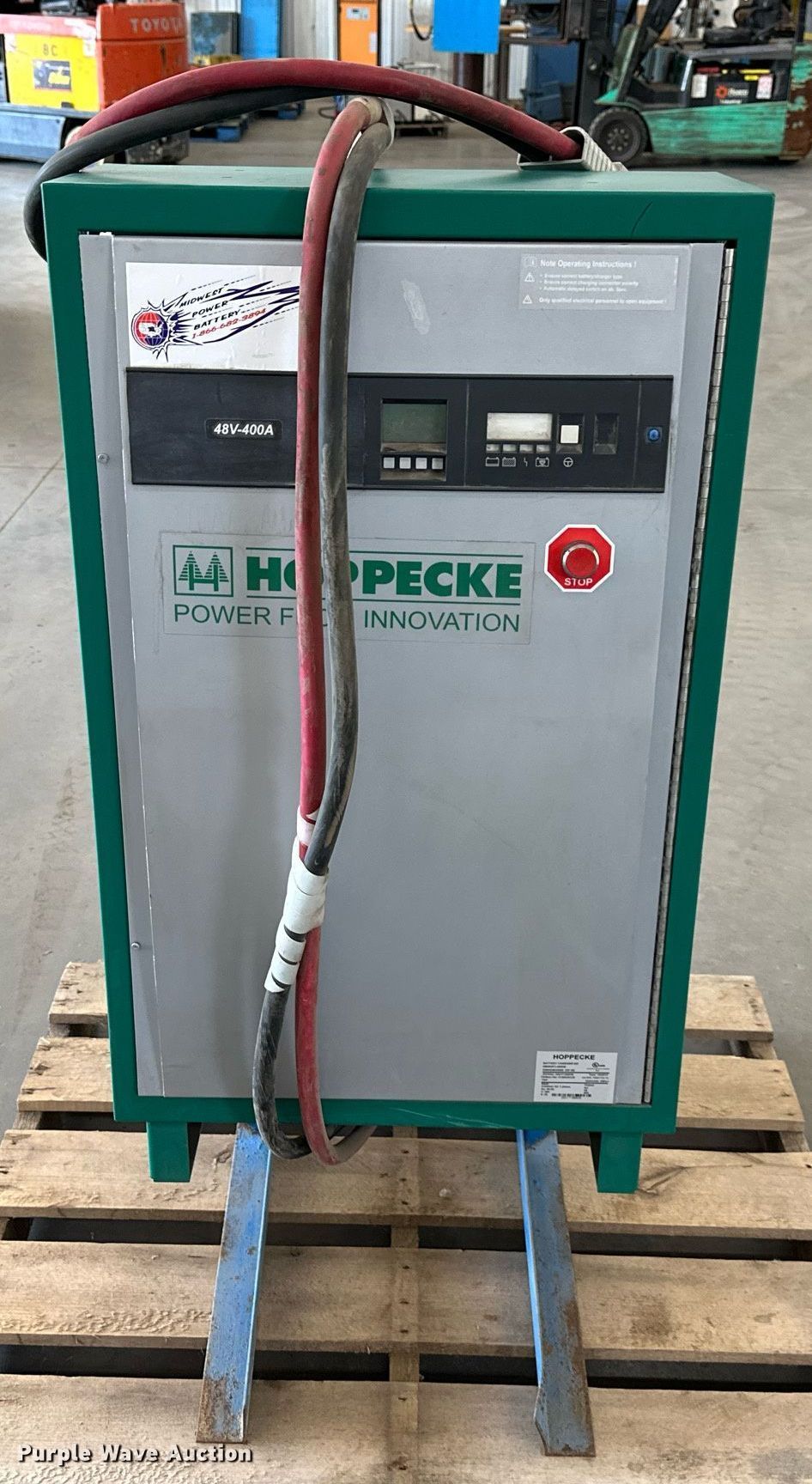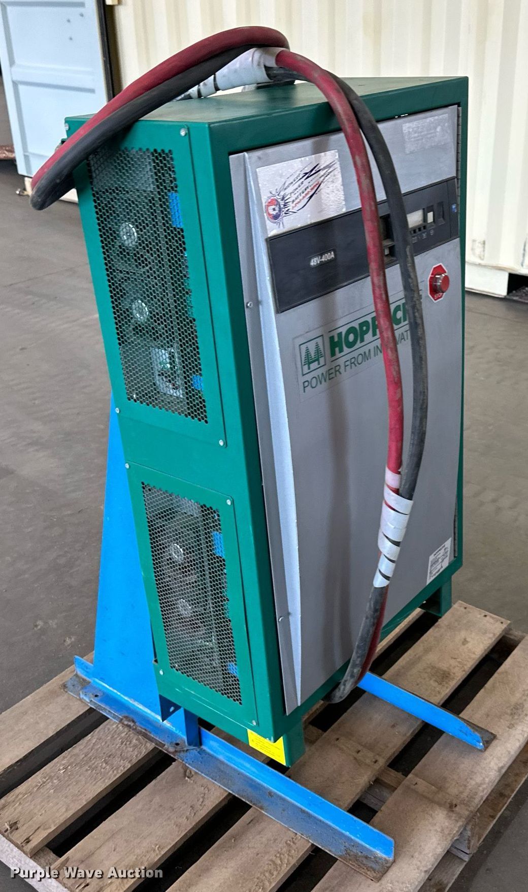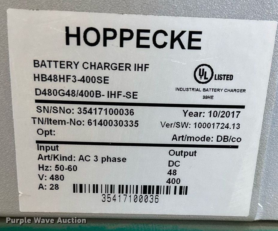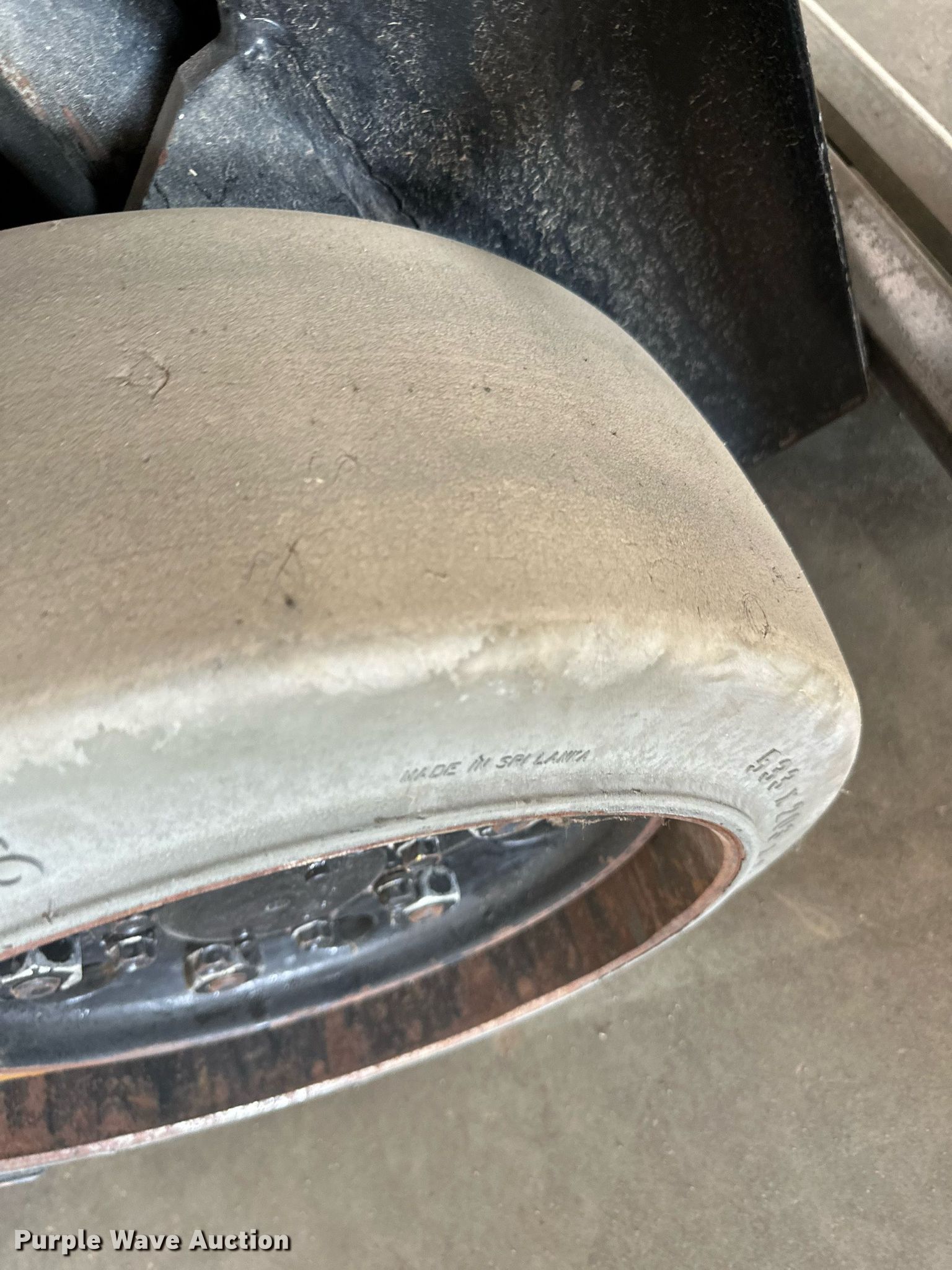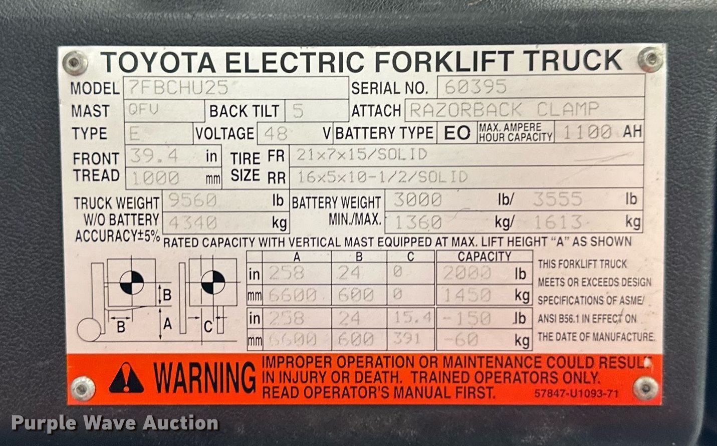 Toyota 7FBCHU25 forklift. Hours: 549 on meter, Serial: 60395. Electric Motor Charger: Hoppecke 480V, Three phase. Transmission Shuttle shift. Features Maximum lift capacity: 2,000 lbs, Maximum lift height: 258", Mast stages: 4, Side shift, Mast tilt, Fork length: 42". Tires Front: 21x7x15, Rear: 16x5x10 1/2, Solid. American Equipment. 1723 E 1500 Rd. Lawrence, KS 66044