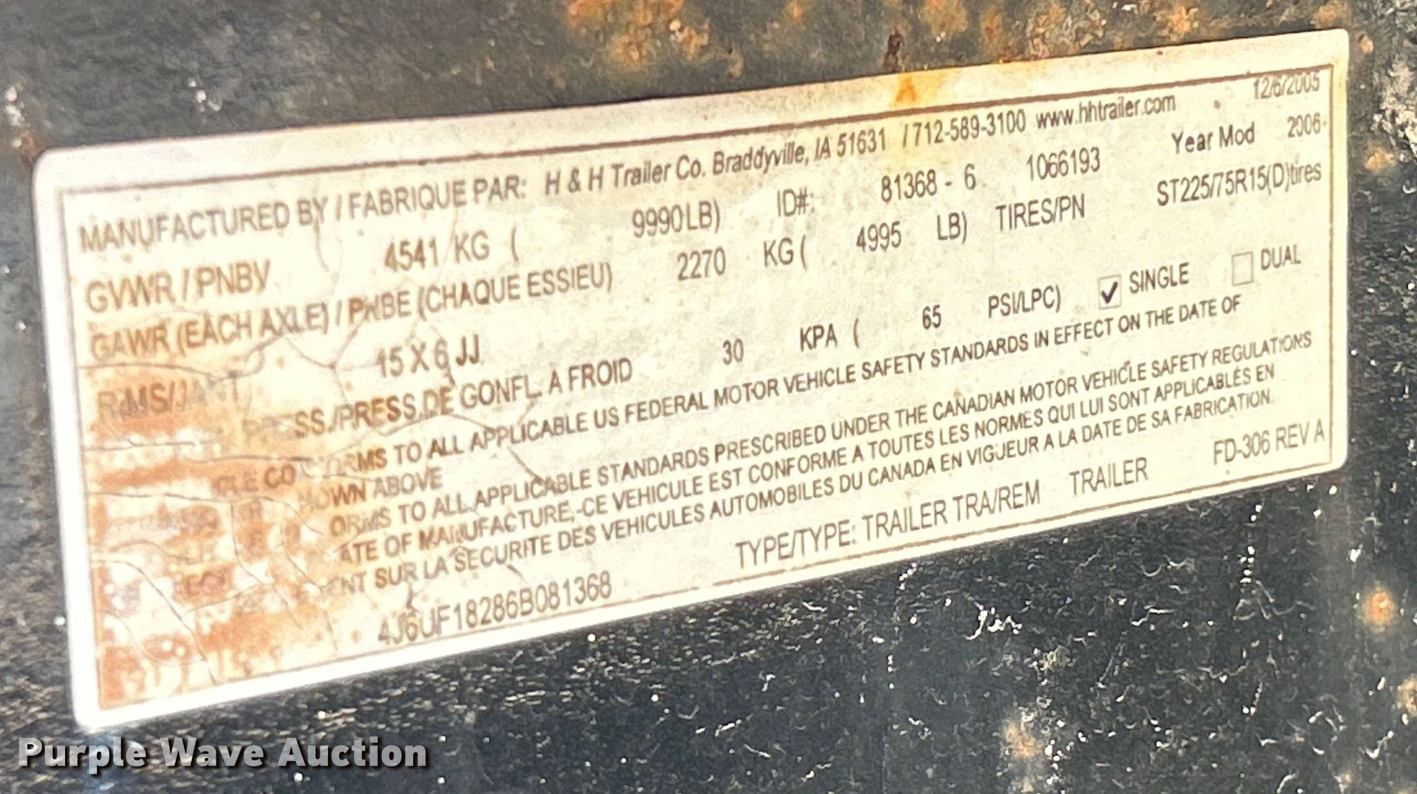 Purple Wave is selling a used Car or Utility Trailer in Missouri. This item is a 2006 H&H Trailer FD-306 REV A utility trailer with the following: VIN: 4J6UF18286B081368