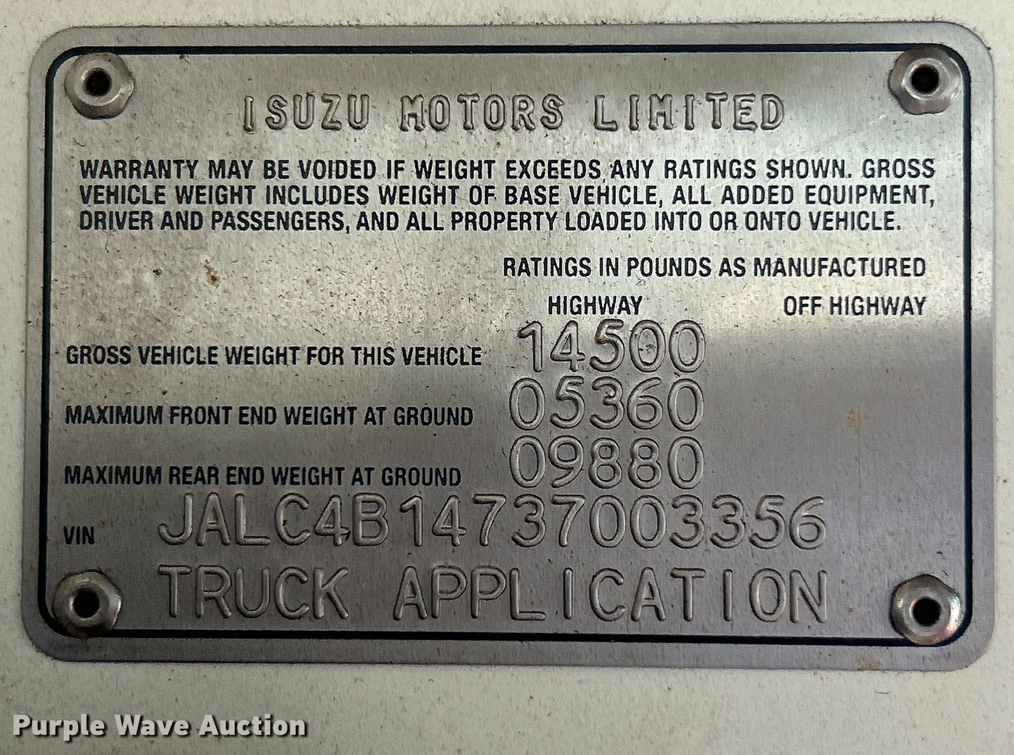 2003 Isuzu NPR HD box truck. Miles: 175,552 on odometer, VIN: JALC4B14737003356. Engine Isuzu, Displacement: 4.75L, Cylinders: 4, Fuel type: Diesel. Transmission Automatic. Chassis Axles: Single, Suspension: Spring, Brakes: Hydraulic, GVWR: 14,500 lbs. Interior AC, Heat. Features Box bed Morgan GVSD09116096, Serial: MWI02VR24935001, 16' L x 92" W x 92" H, Floor: Wood, End gate lift Maxon.. Tires Size: 215/85R16, Brand: Firestone. Notes Dash warning indicator: A/T oil temp, Windshield chipped or cracked, Non-operational End gate lift. Missouri title. Seller is a Missouri licensed motor vehicle dealer. Title will be assigned and distributed by the dealer. Please contact the seller for distribution questions. Title distribution may be delayed up to 30 days from verification of funds. Northpoint Enterprises, LLC. 100 Manda Ct. Troy, MO 63379