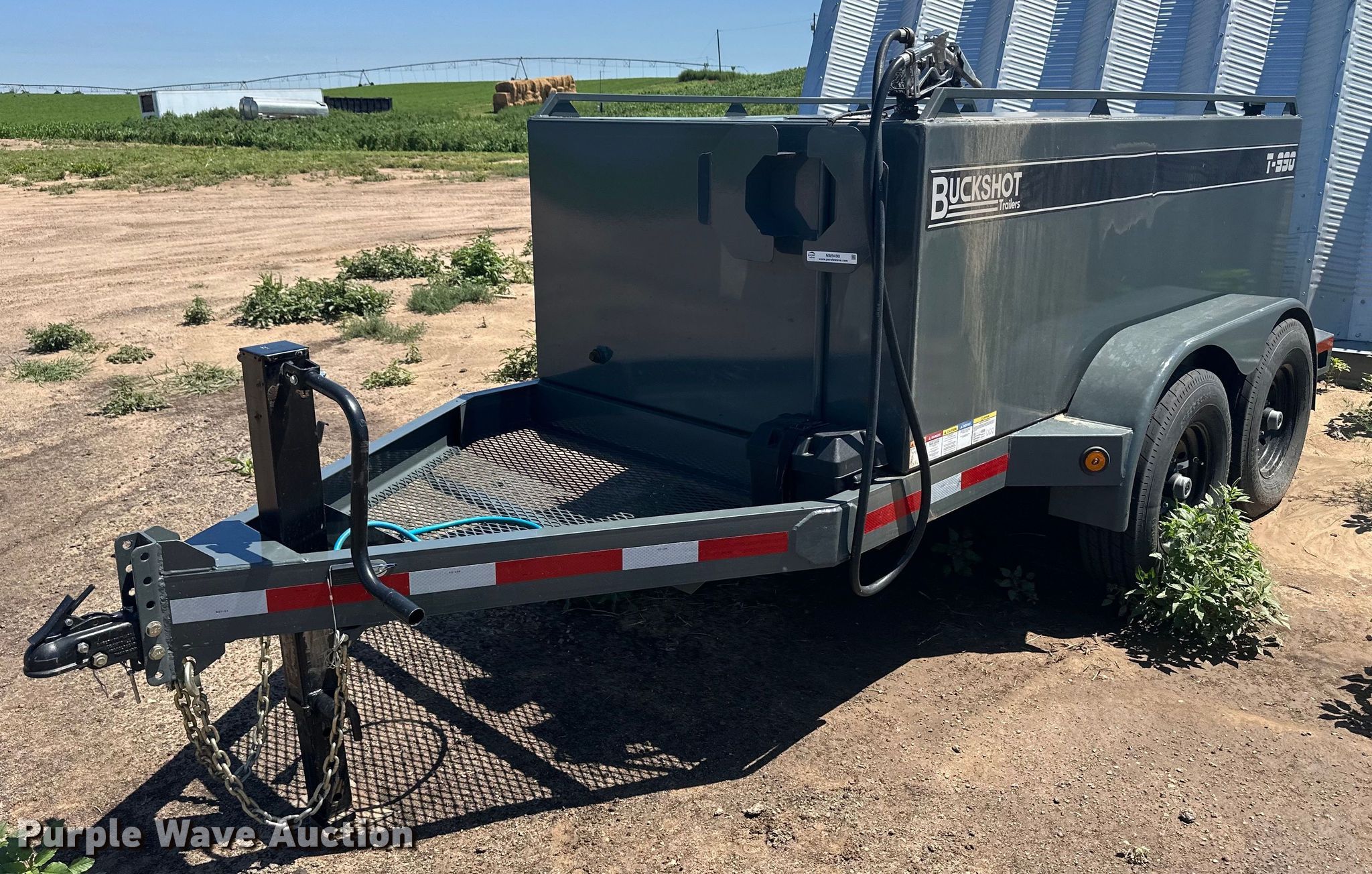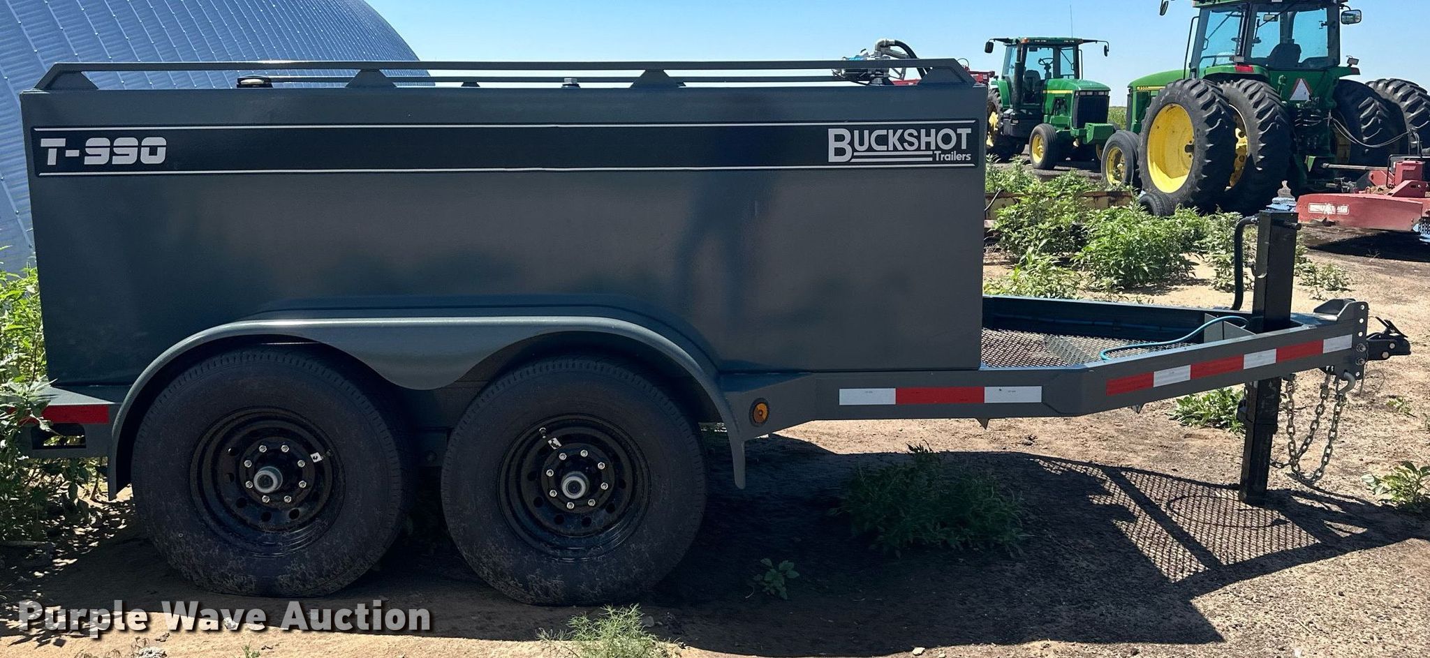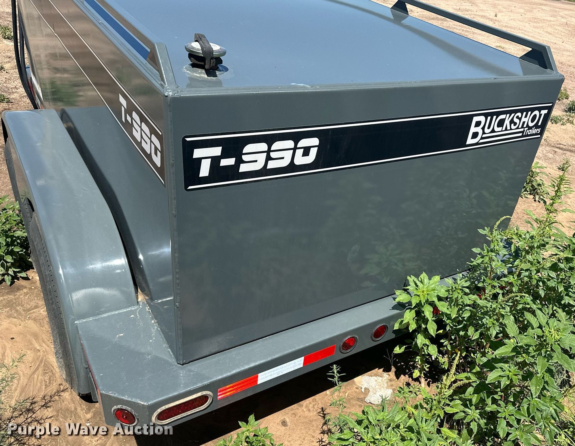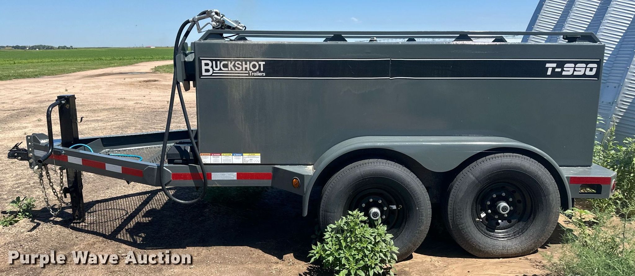 Buckshot T-990 tank trailer. VIN: 4B9BT152XPG250210. Dimensions Overall: 15' L x 82" W. Features Tank type: Steel Capacity: 1,000 gallons, Pump. Chassis Ball hitch: 2 5/16", Landing gear: Single, Suspension: Spring, Brakes: Electric, Axles: Tandem. Tires Steel wheels, Size: 235/80R16. Kansas title. Title distribution may be delayed up to 30 days from verification of funds. Buckshot MFG. Sublette, KS 67877