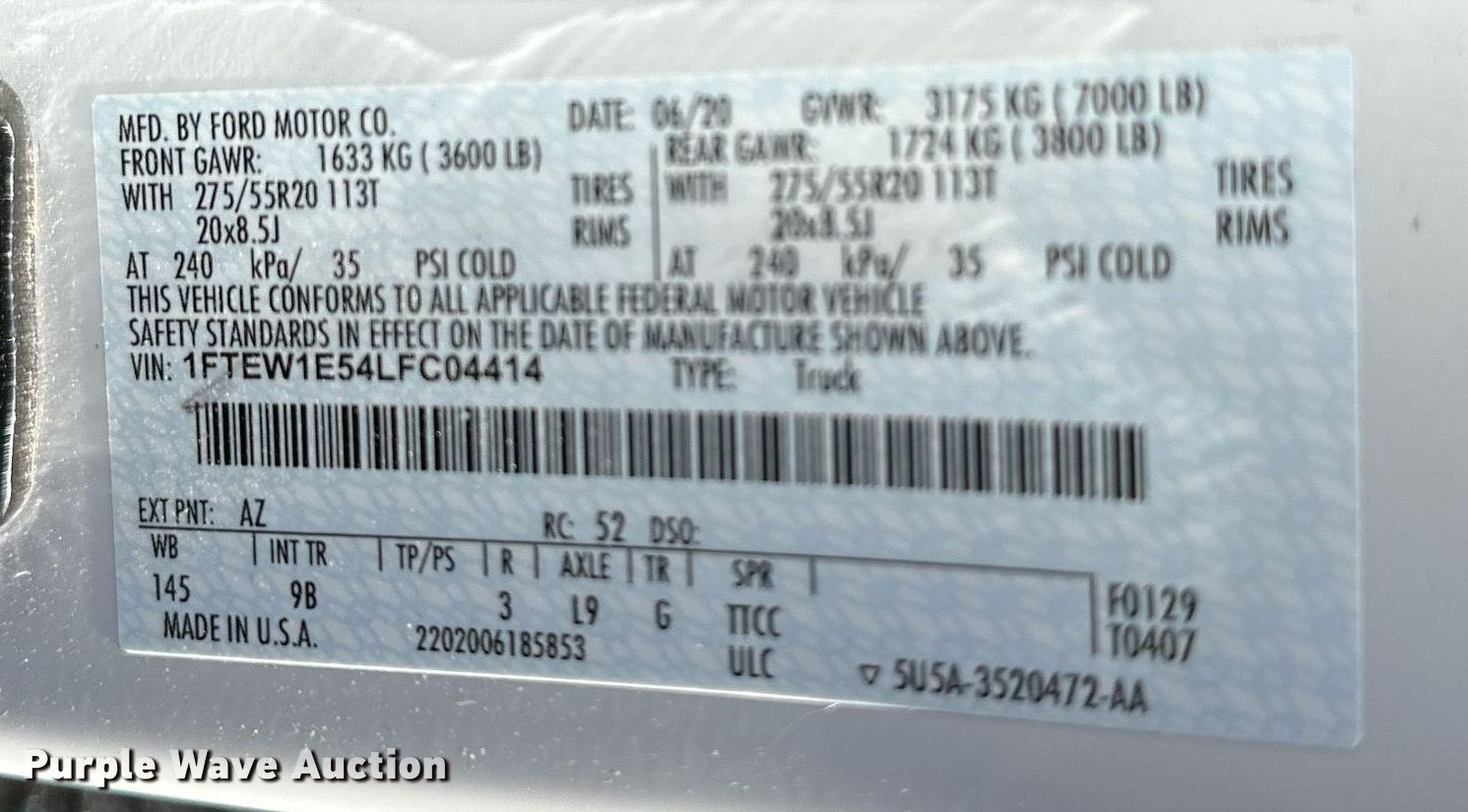 2020 Ford F150 Platinum SuperCrew pickup truck. Miles: 14,817 on odometer, VIN: 1FTEW1E54LFC04414, Unit #: 3-813067. Engine Displacement: 5.0L V8 OHV, Cylinders: 8, Fuel type: Gas. Transmission Automatic, Four wheel drive. Interior AC, Heat, Seat: Heated, Cooled, Power driver, Power passenger, Heated mirrors, Power windows, Power locks, Cruise control, Backup camera, Powered sunroof. Tires Size: 35X12.50R20. Notes Collision damage, Hail damage, Passenger doors damaged. Insurance salvage unit. Oklahoma title. Title distribution may be delayed up to 14 days from verification of funds. Oklahoma Farm Bureau Insurance. Seminole, OK 74868