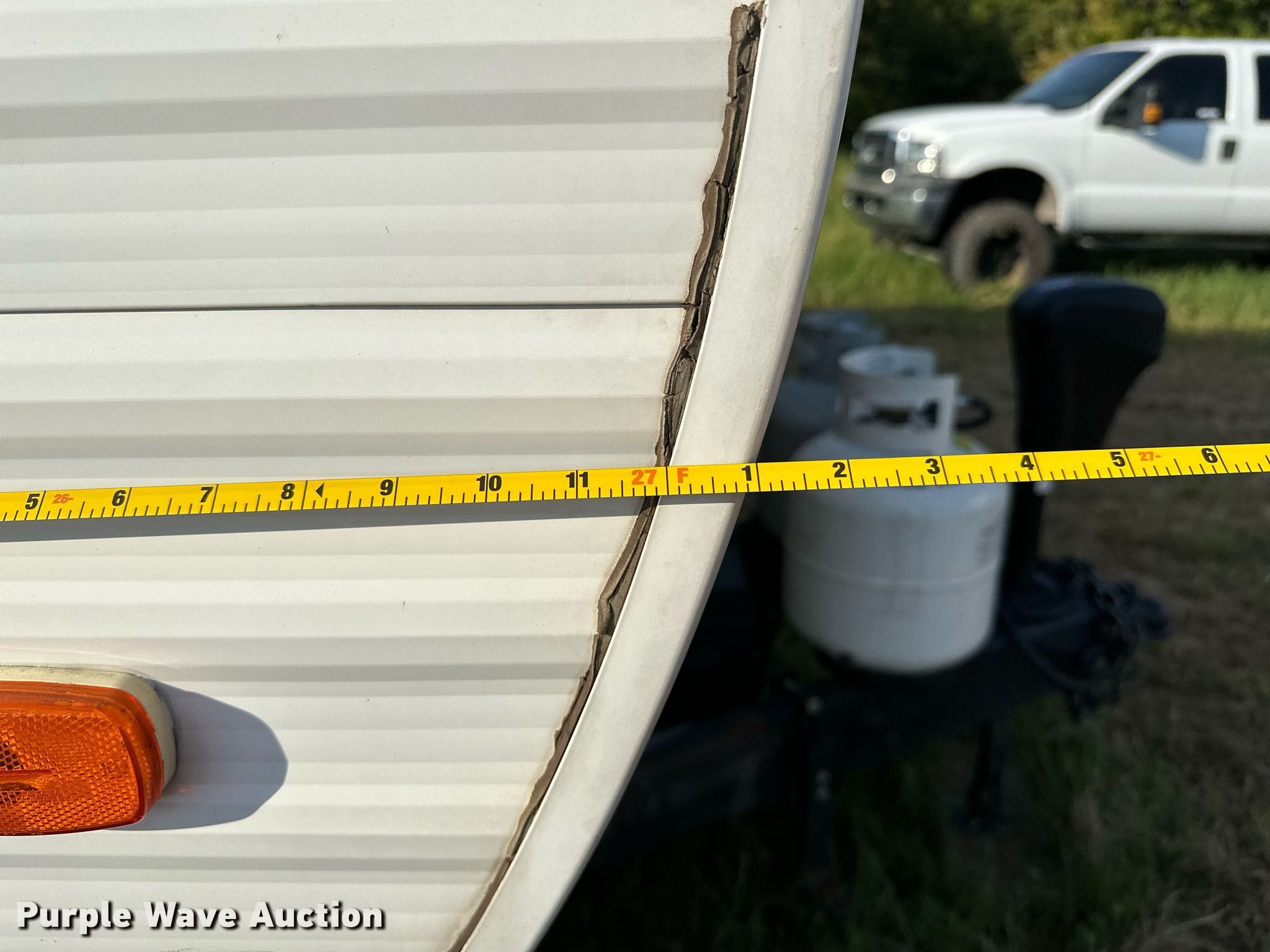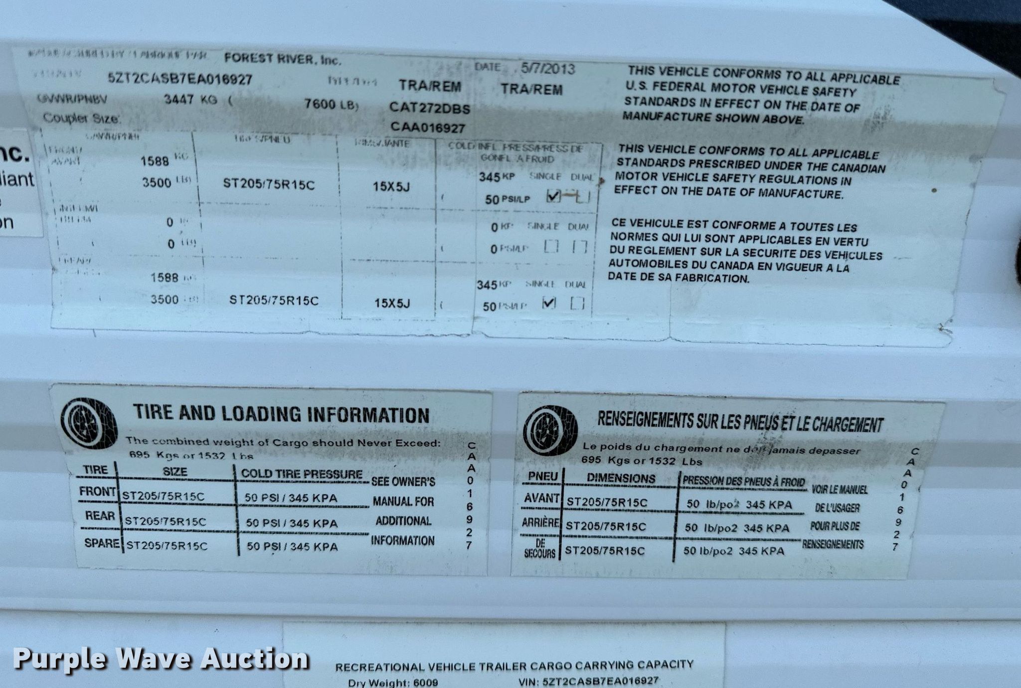 2014 Forest River Coachmen Catalina Santara camper. Camper length: 27', VIN: 5ZT2CASB7EA016927, Claim #: 3-806576. Chassis Axles: Tandem, Suspension: Spring, Brakes: Electric, GVWR: 7,600 lbs, GAWR: 3,500 lbs. Interior Kitchen: Sink, Refrigerator, Freezer, Microwave, Oven, Stove: Propane, Living room: Table, Couch, Pull out couch, Bathroom, Beds: 3 Bed type: Queen, Satellite, Sound system, Heater, AC units: 1. Features Slide outs: 1, Awnings: 1 Awning type: Electric, Ball hitch: 2 5/16". Tires Size: 205/75R15. Notes Hail damage. Insurance salvage unit. Oklahoma title. Title distribution may be delayed up to 14 days from verification of funds. Oklahoma Farm Bureau Insurance. Seminole, OK 74868