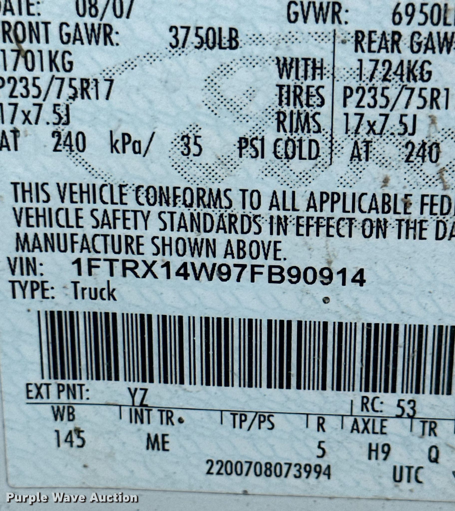 - VIN: 1FTRX14W97FB90914