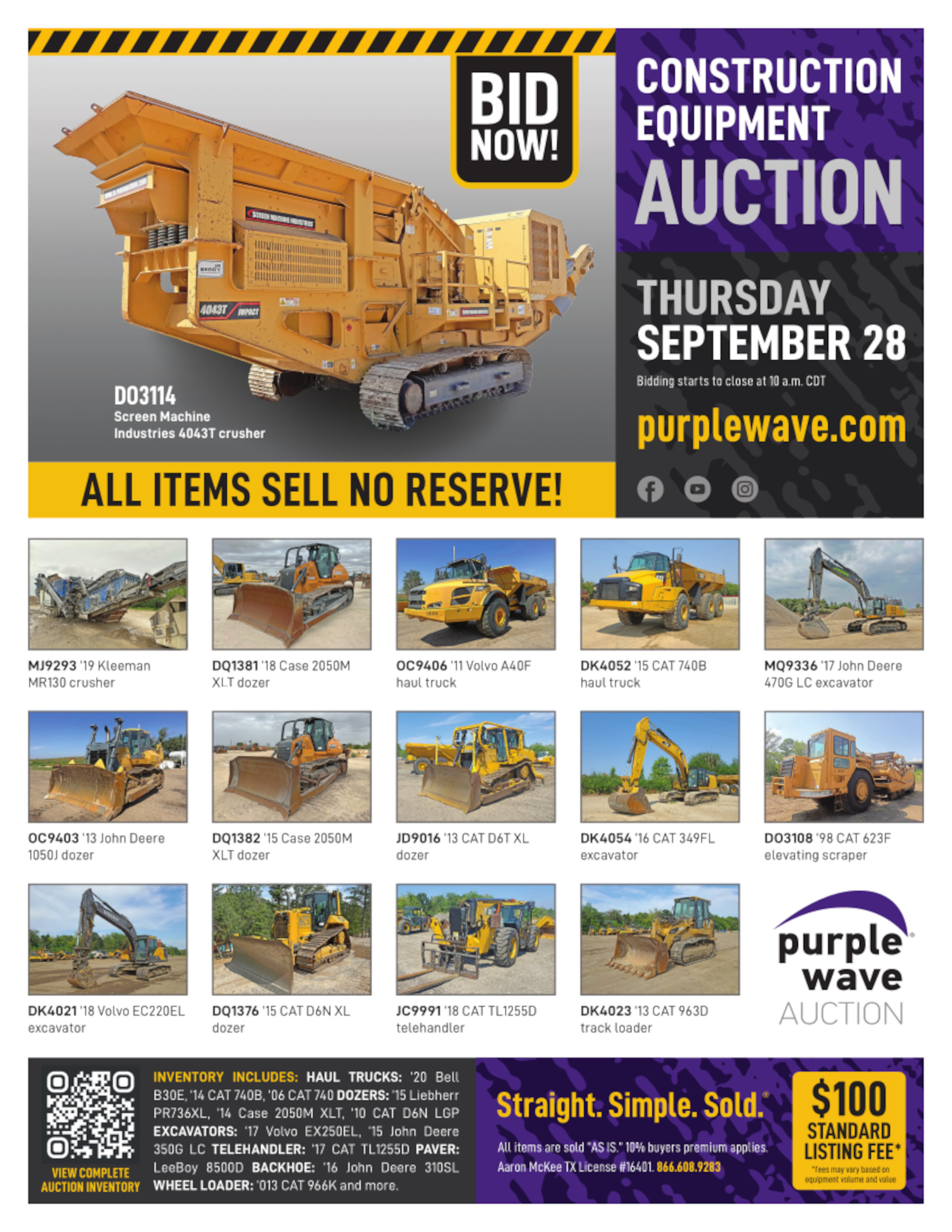 This auction is conducted by Purple Wave, Inc., whose home office is 825 Levee Drive, Manhattan, Kansas. Aaron McKee, Texas auctioneer license # 16401, operates Purple Wave, Inc. Complaints against us may be directed to the Texas Department of Licensing and Regulation, P.O. Box 12157, Austin, Texas 78711, (512) 463-6599. For additional required information, see the attached document.