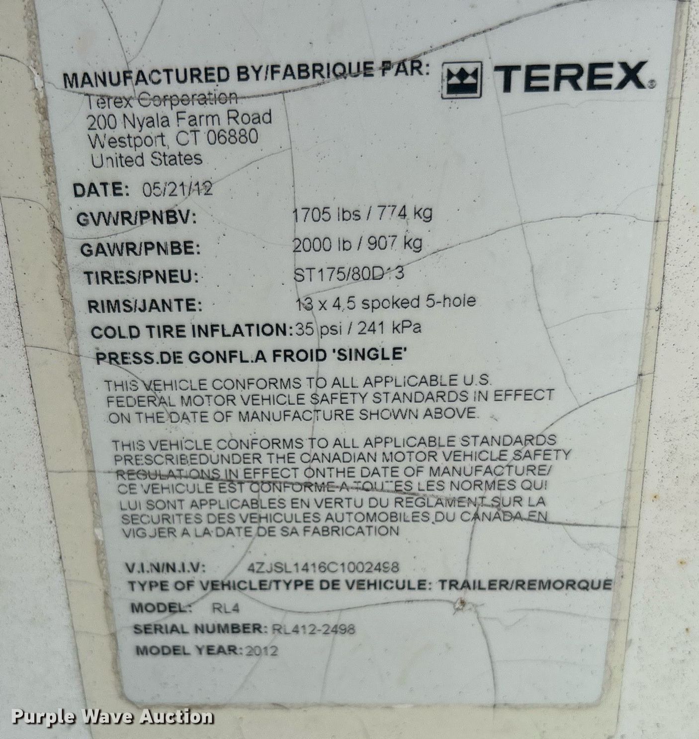 Purple Wave is selling a used Light Plant in Oklahoma. This item is a 2012 Terex RL4 light plant with the following: Hours: 2,619 on meter, VIN: 4ZJSL1416C1002498, Serial: RL412-2498