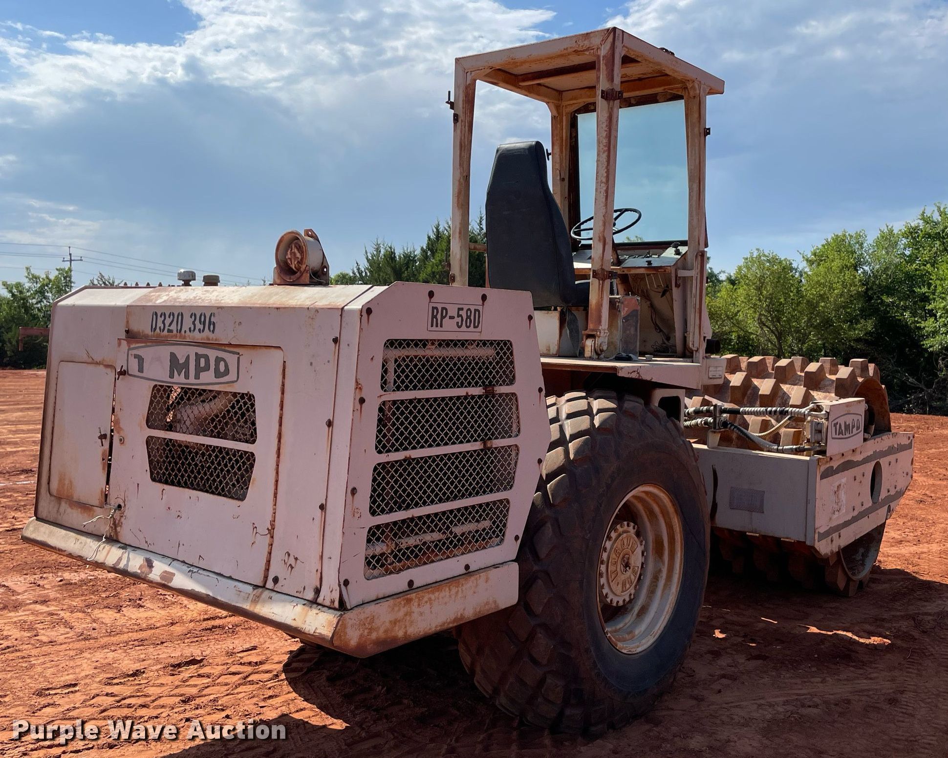 Tampo RP58D single drum vibratory roller. Miles or hours may vary, unit still in use, Serial: 2251425A. Engine Cylinders: 3, Fuel type: Diesel. Transmission Hydrostatic, Two speed travel. Features Drum: Padfoot, Vibratory system: Single, Two speed, Front drum Width: 84", Diameter: 61", Drum scrapers: Front. Tires Size: 23.1-26. Notes Hydraulic issues, unit moves intermittently , Hydraulic leak. 2290 County Road 1240. Blanchard, OK 73010