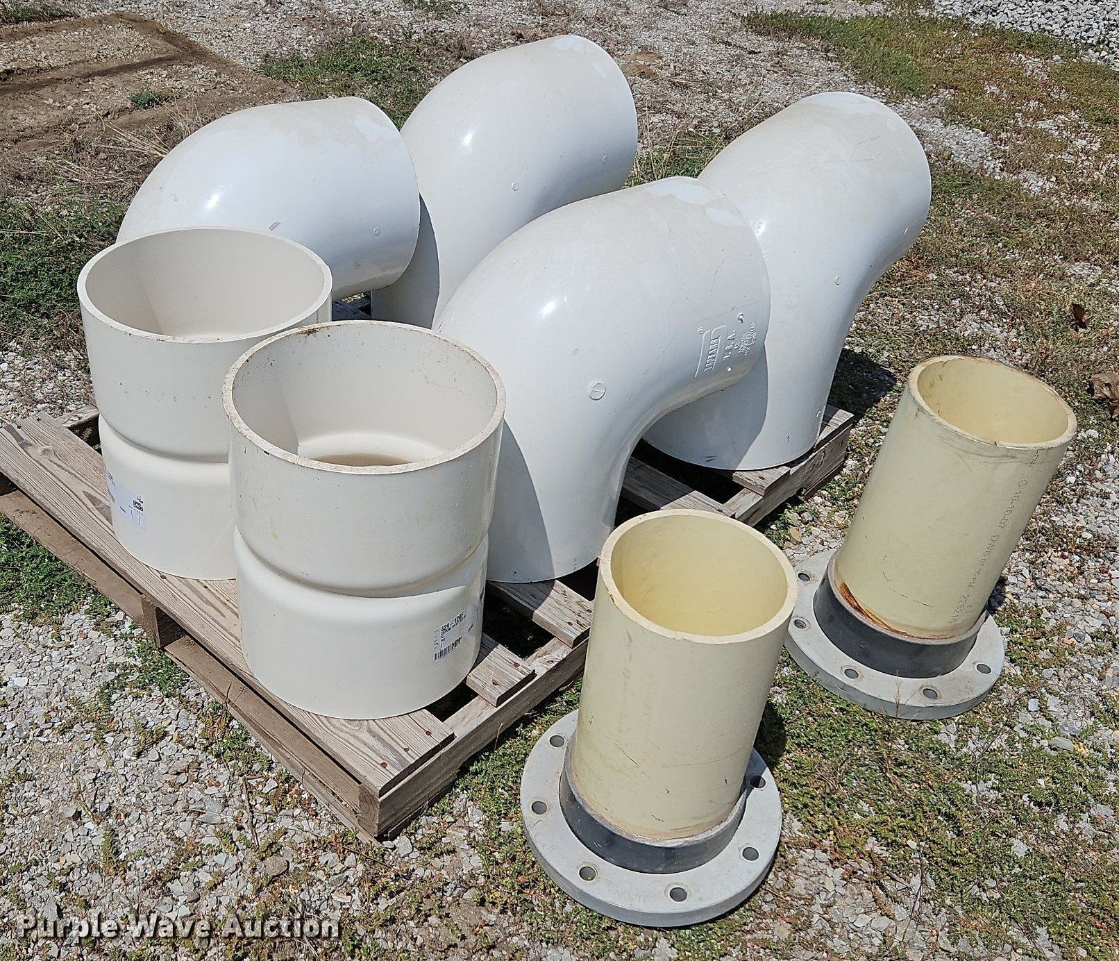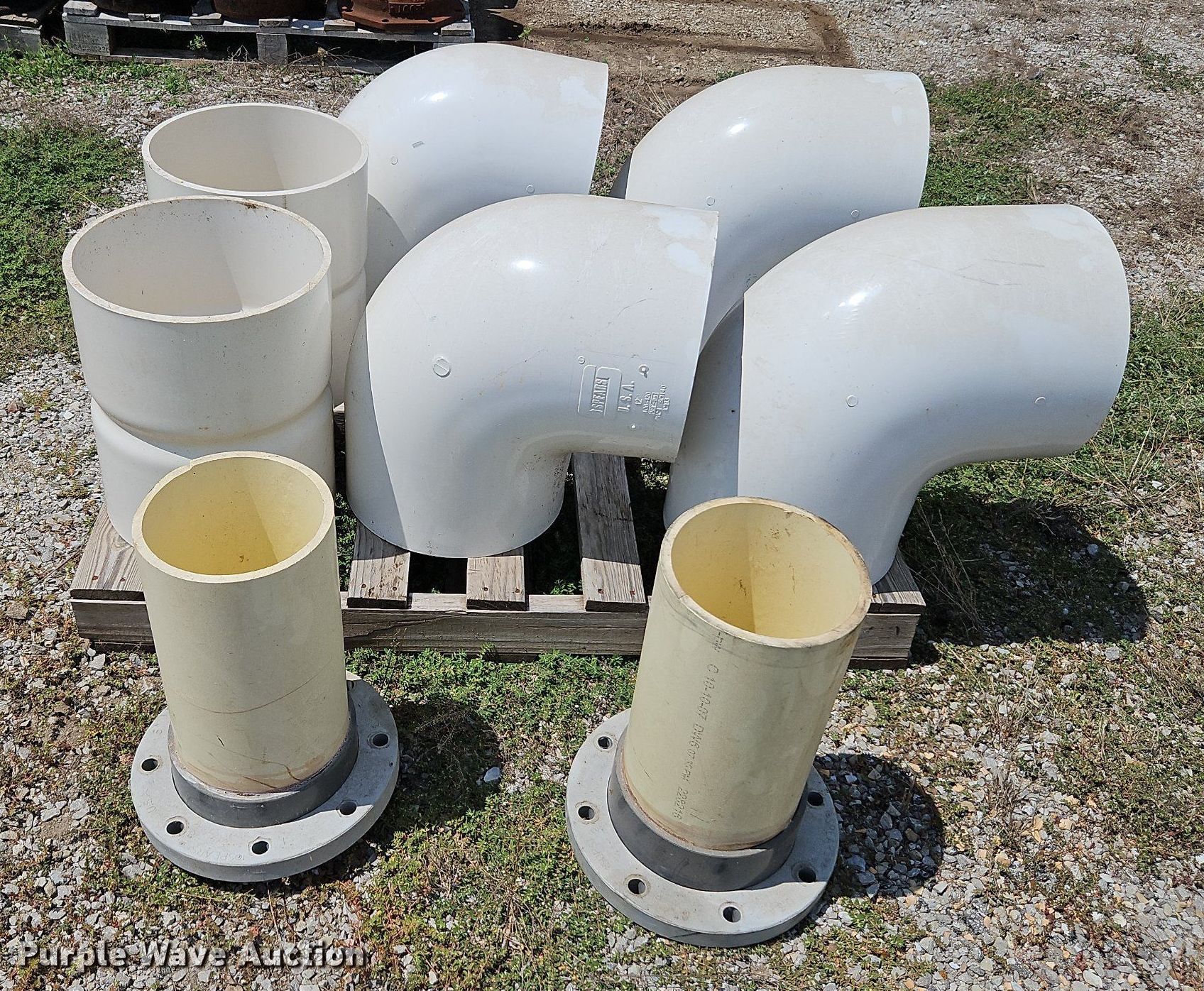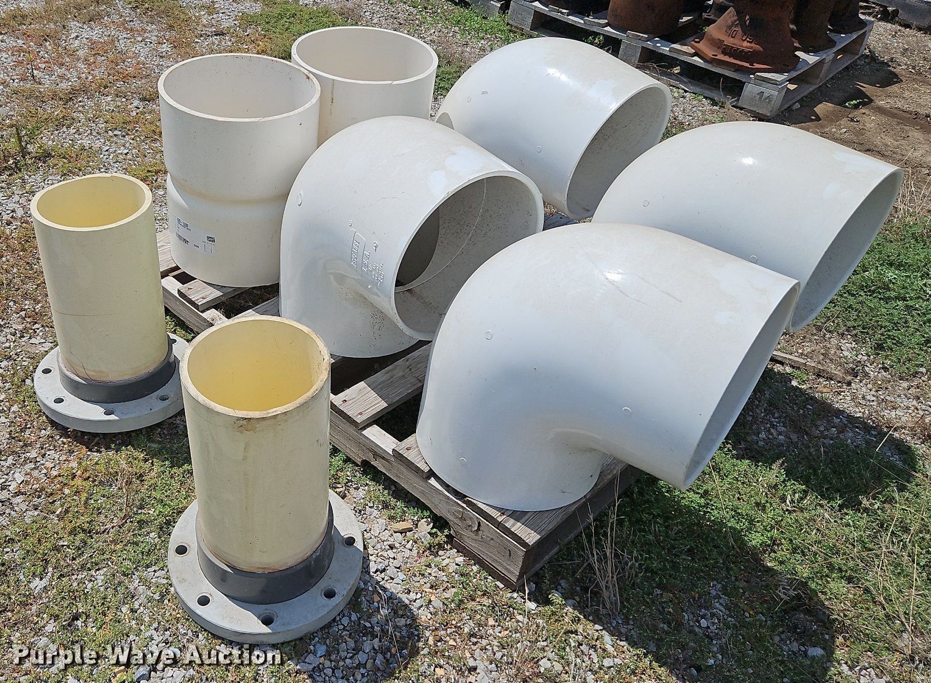 Purple Wave is selling a used Pipe in Missouri. This item is a Solvent weld PVC fittings with the following: (4) 90 degree 12" diameter schedule 40, (2) 12" diameter schedule 40 coupler, (2) 8" diameter FLG x PE adapters