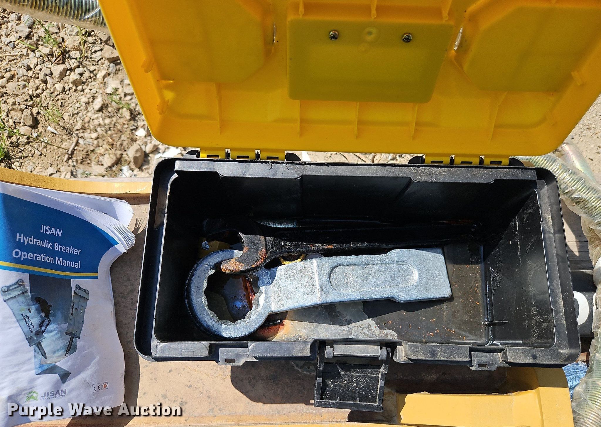 Purple Wave is selling a used Breaker or Hammer in Kansas. This item is a 2022 Jisan JSB800 hydraulic breaker with the following: Serial: JSB502210008, Bit: 100mm, Toolbox and tools included, Fits Caterpillar 311, 312, 314