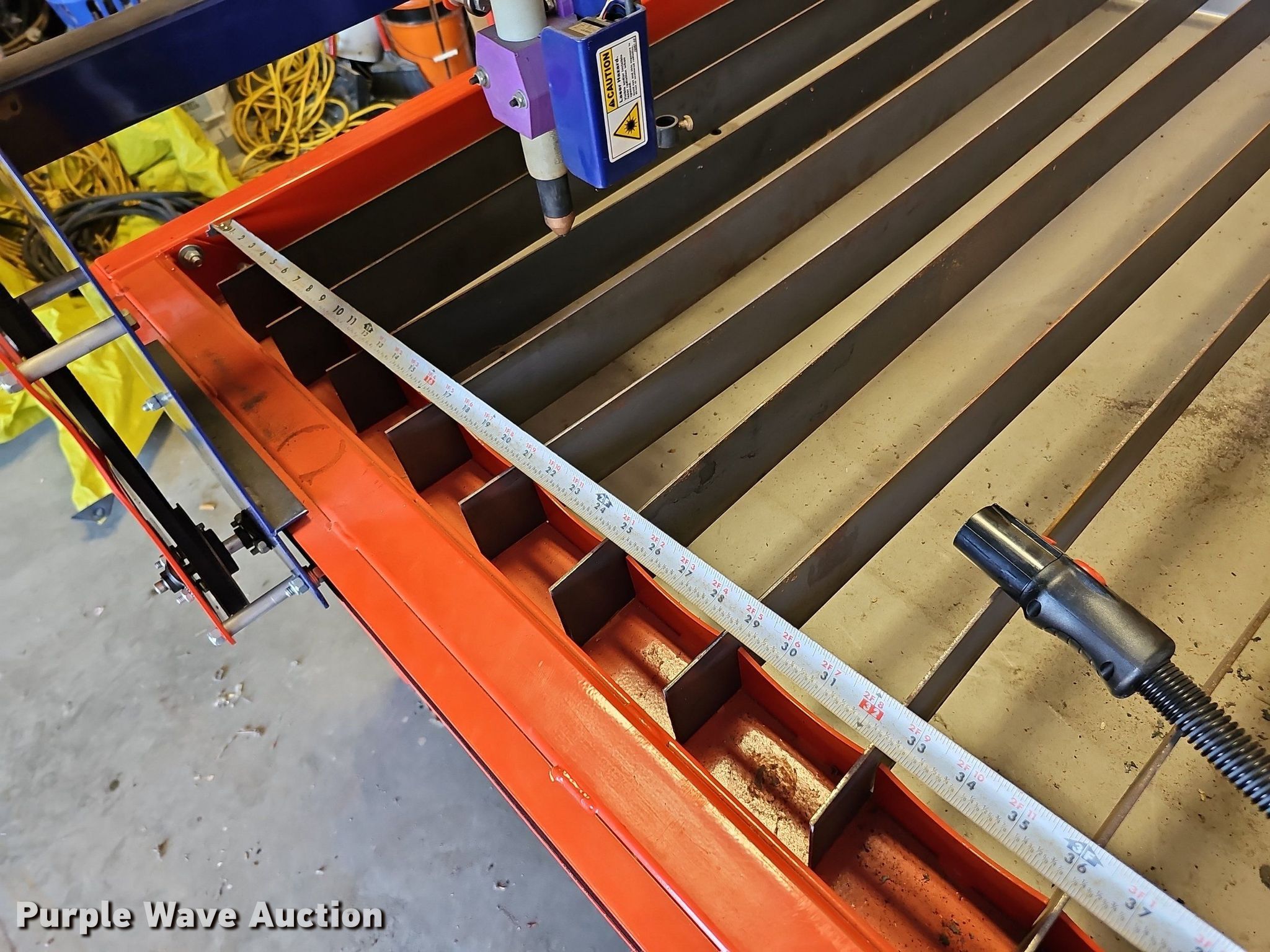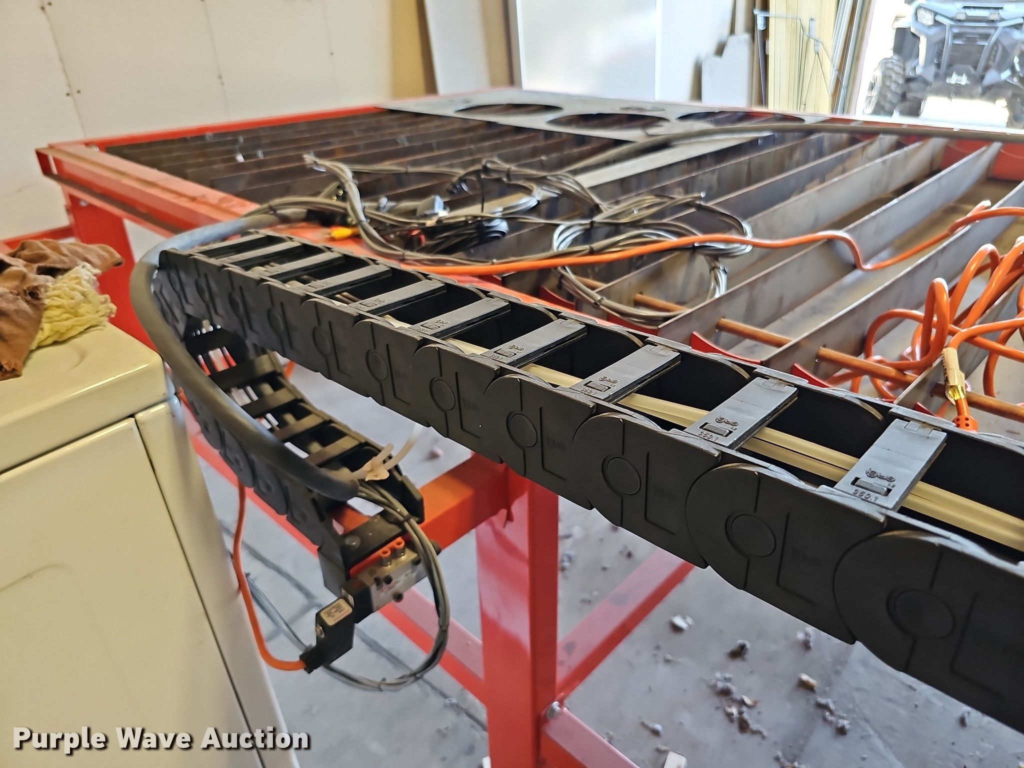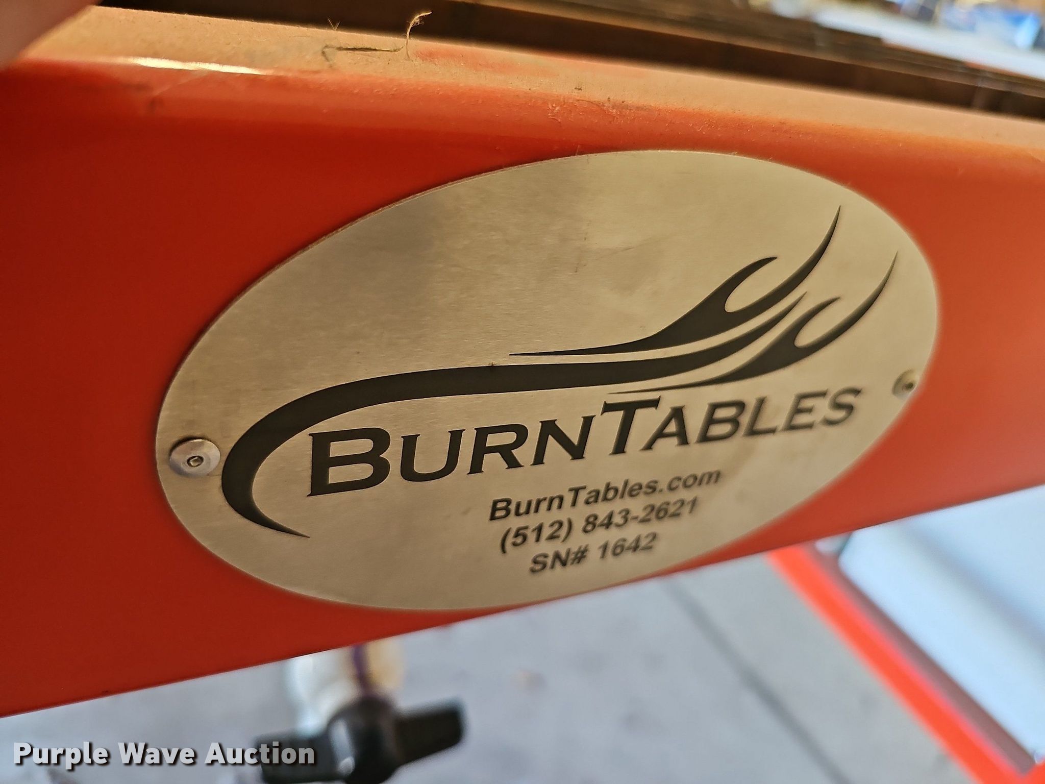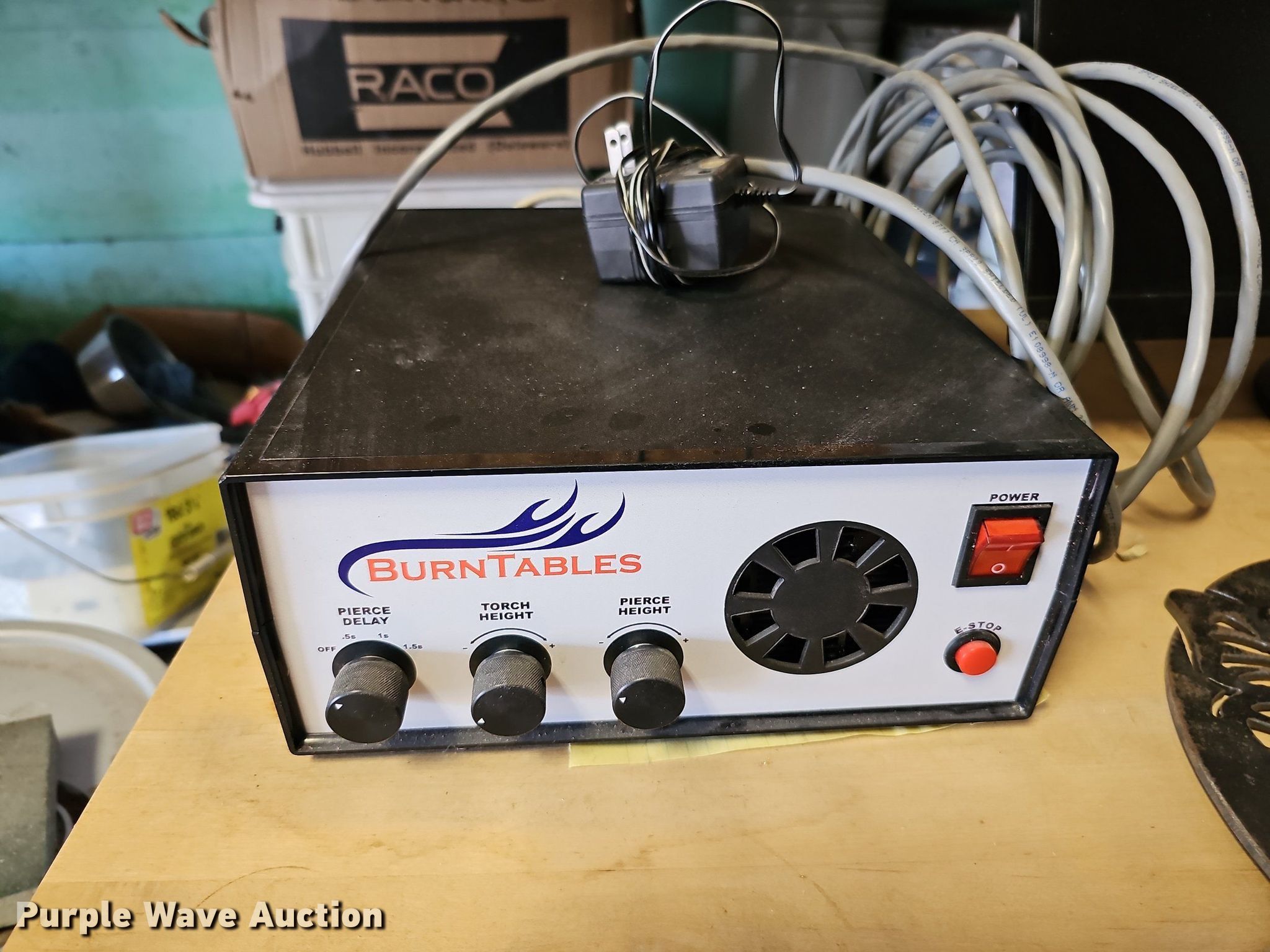 2015 Burn Tables plasma cutting table. Serial: 1642. Electric Motor Volts: 110. Features Overall: 9'5" L x 72" W x 65" H, Table: 9' L x 53.5" W, Desk: 48" L x 25" W x 36" H , PowerMax 85 Hypertherm plasma cutter, (6) plasma cutting tips Unused, Rolling cart, Monitor, Hard drive , Manual. 15299 Chandler Road. Omaha, NE 68138