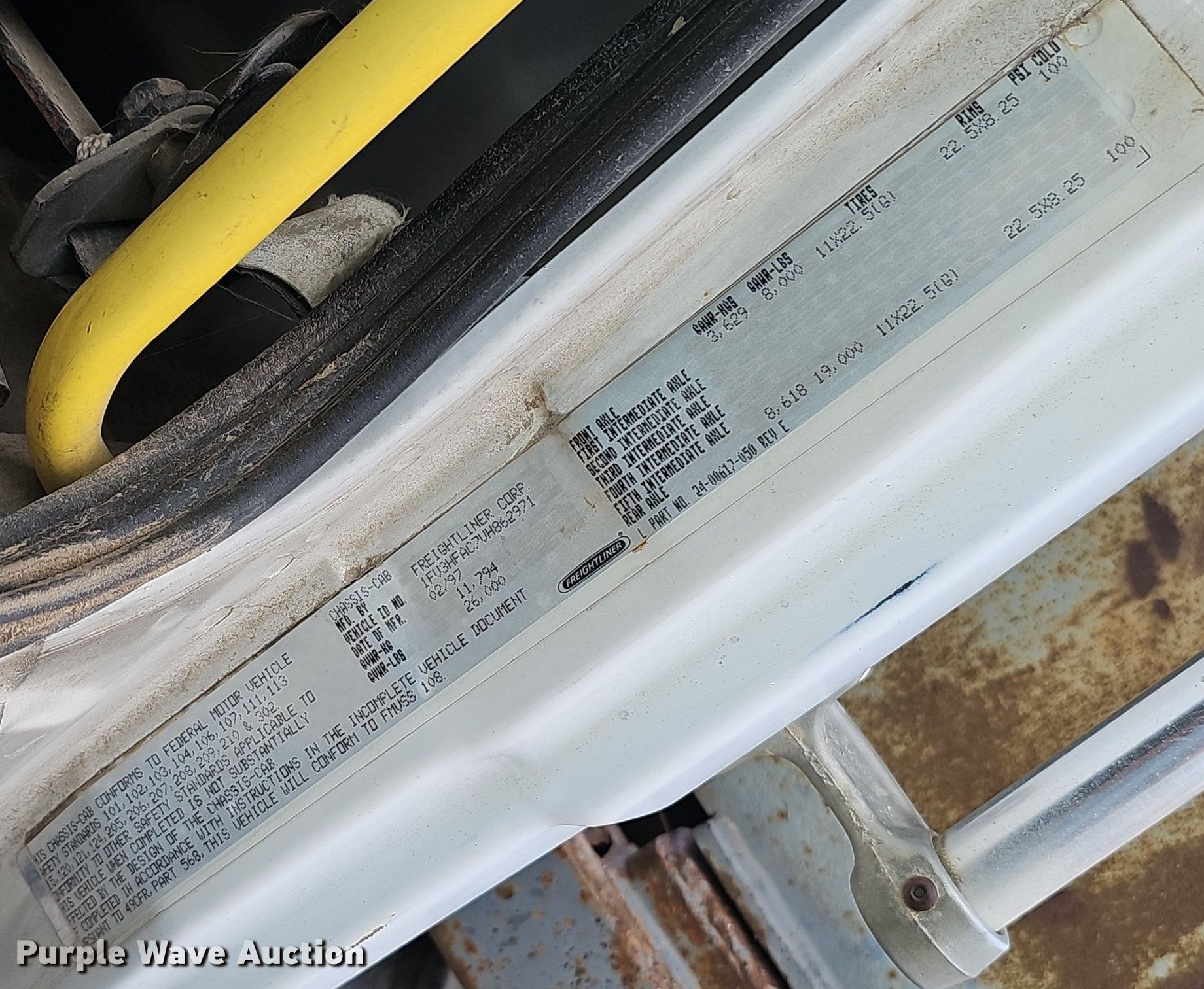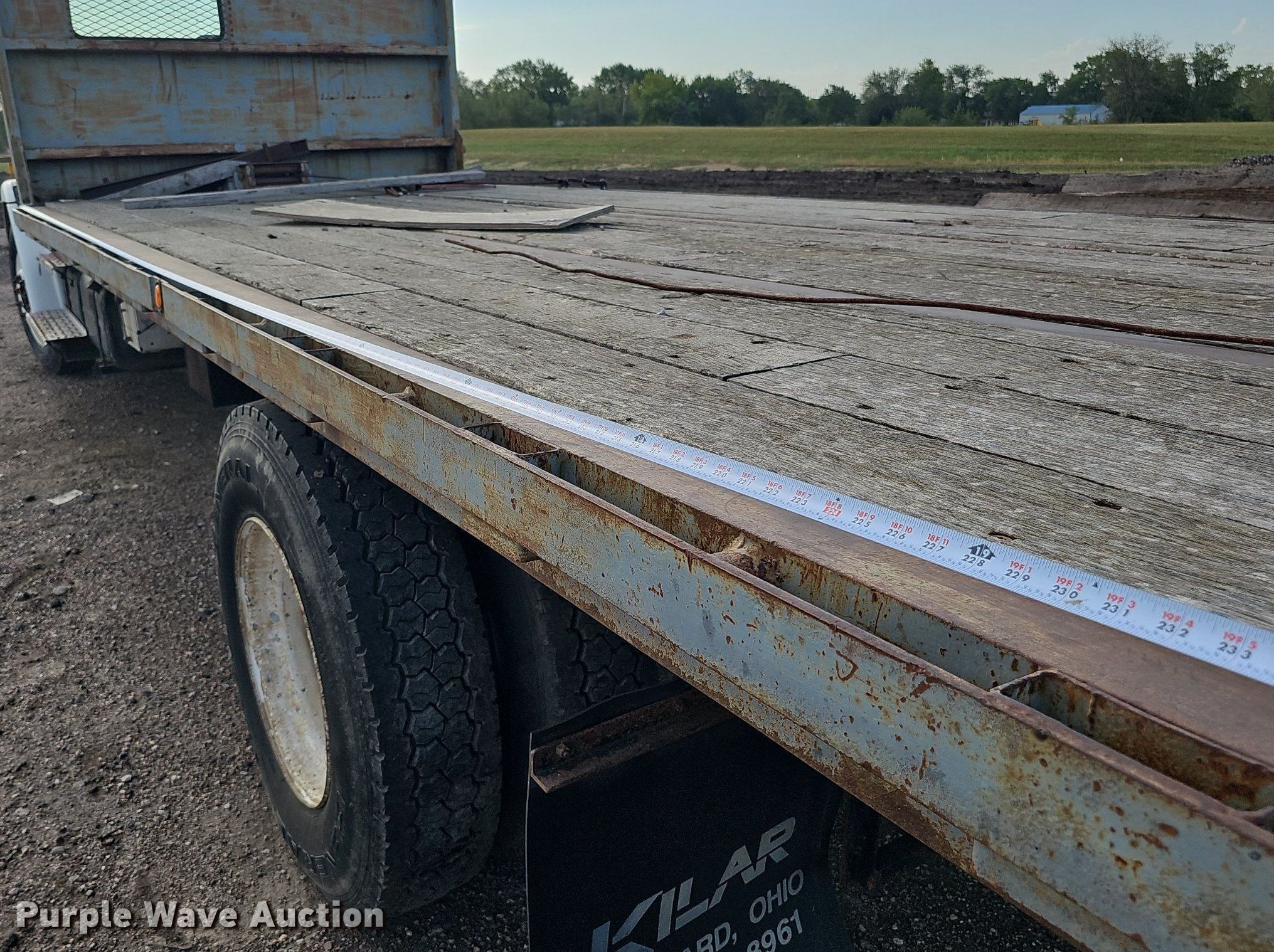 1997 Freightliner FL70 rollback truck. Miles: 142,009 on odometer, VIN: 1FV3HFAC7VH862971. Engine Cummins B series, Displacement: 5.9L, Cylinders: 6, Fuel type: Diesel. Transmission Manual, Speed: 5. Chassis Axles: Single, Suspension: Spring, Brakes: Hydraulic, PTO, GVWR: 26,000 lbs, Wheelbase: 232". Interior AC, Heat, Heated mirrors. Features Rollback bed 26' L x 100" W, Ram: Double, Winch. Tires Front: 11R24.5, Rear: 11R22.5. Notes Windshield chipped or cracked, Non-operational engine, seized, Non-operational unit. Nebraska title. Title distribution may be delayed up to 14 days from verification of funds. Van Kirk Bros. Contracting. 1200 West Ash Street. Sutton, NE 68979