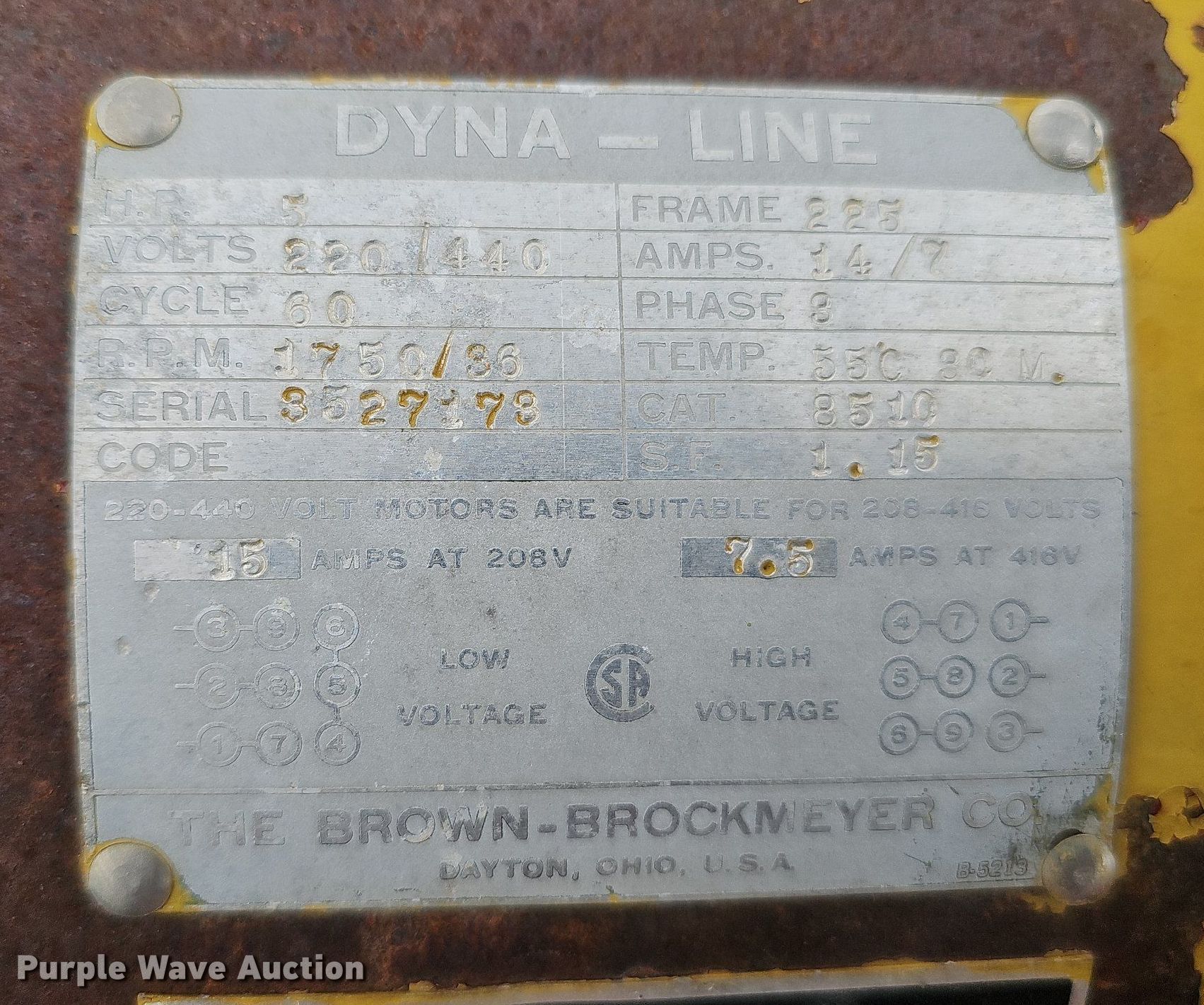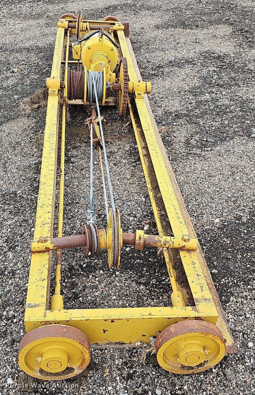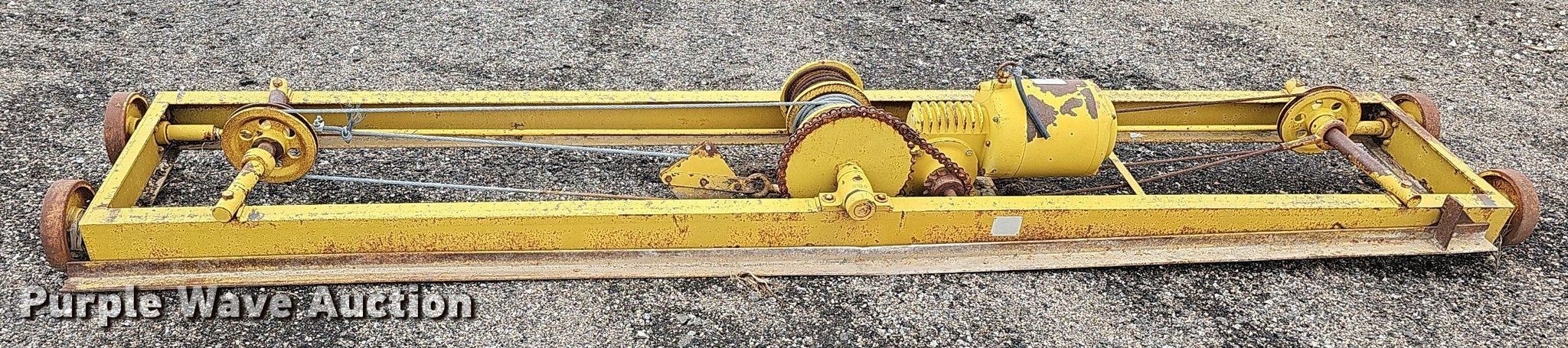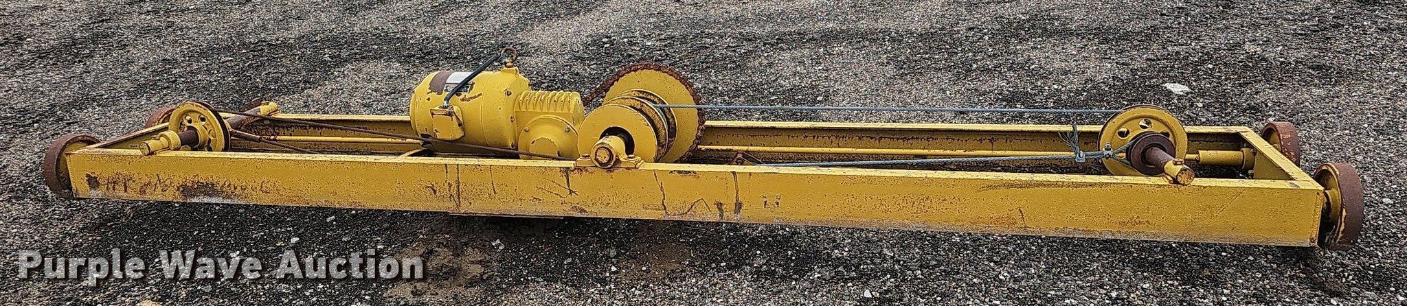 Con-3 conveyor. Features. Conveyor Length: 25' 6", Width: 26", Input hopper Length: 135", Width: 65", Hopper Height: 100", Belt Width: 24", Unknown operating condition. Overhead crane Serial: 52723. Electric Motor Dyna-Line Serial: 3527173, HP: 5, Volts: 220/440, Phase: Three. Features 12' 8" L x 27" W. Van Kirk Bros. Contracting. 1200 West Ash Street. Sutton, NE 68979