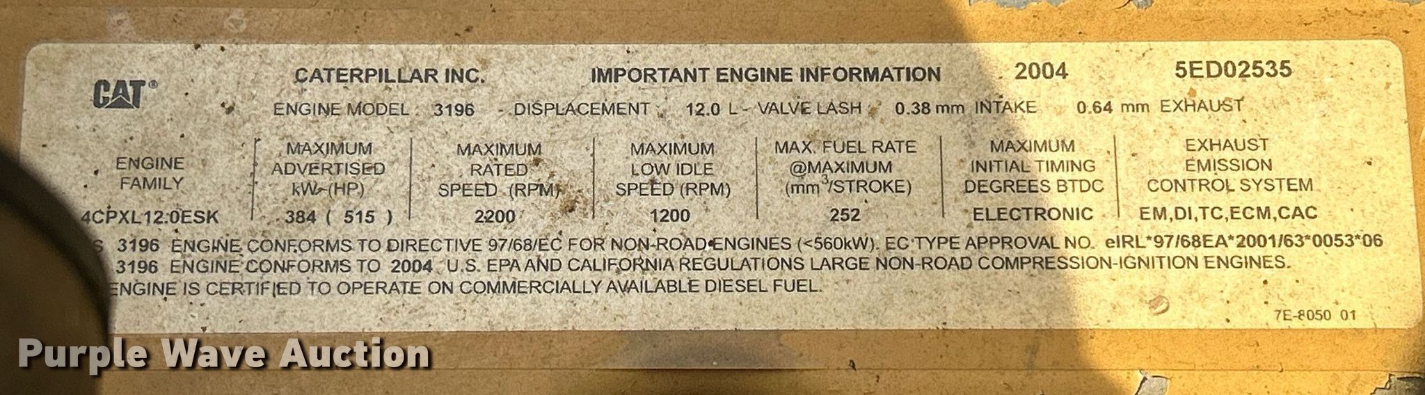 2004 Caterpillar 730 haul truck. Hours: 10,562 on meter, Serial: CAT00730VAGF01300. Engine Caterpillar 3196, Serial: 5ED02535, Displacement: 12.0L, Cylinders: 6, Fuel type: Diesel. Transmission Automatic. Chassis Six wheel drive. Interior AC, Heat. Features Dump bed Caterpillar. Tires Size: 23.5R25. Notes Steering cylinder leak , Bed cylinder leak. Schrader Excavating & Grading. 300 Hwy 151 East. Walford, IA 52315